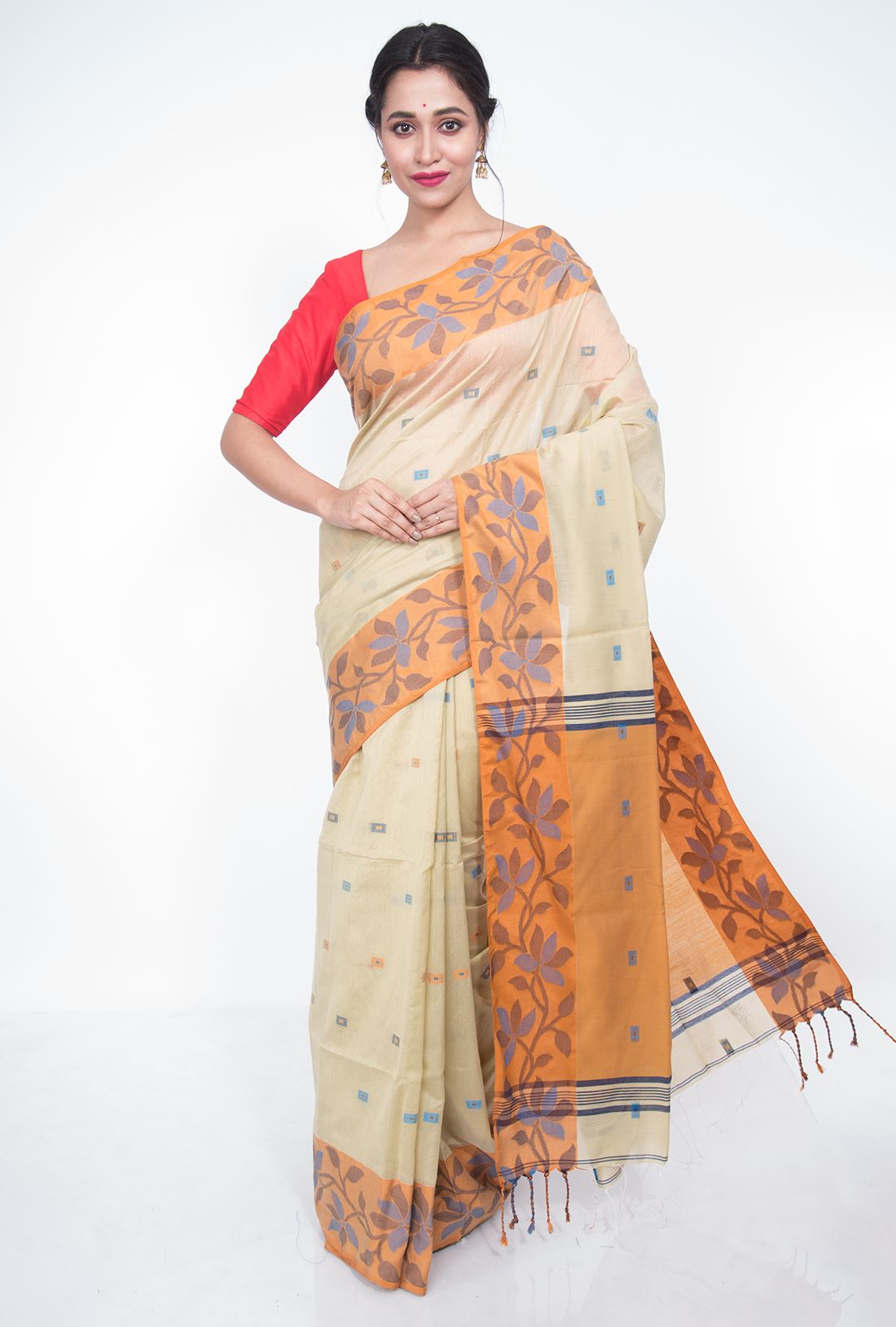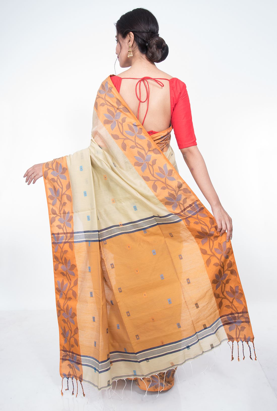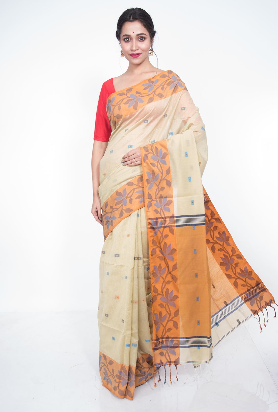 Border: Bright orange border Draws from the pallav with jamdani flower vines in shades og blue.