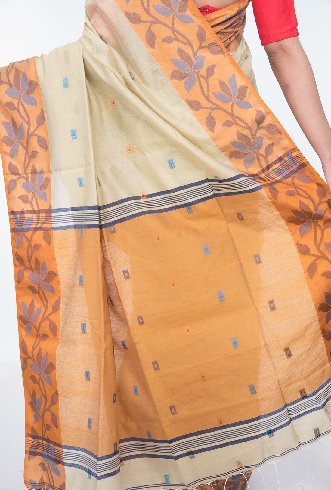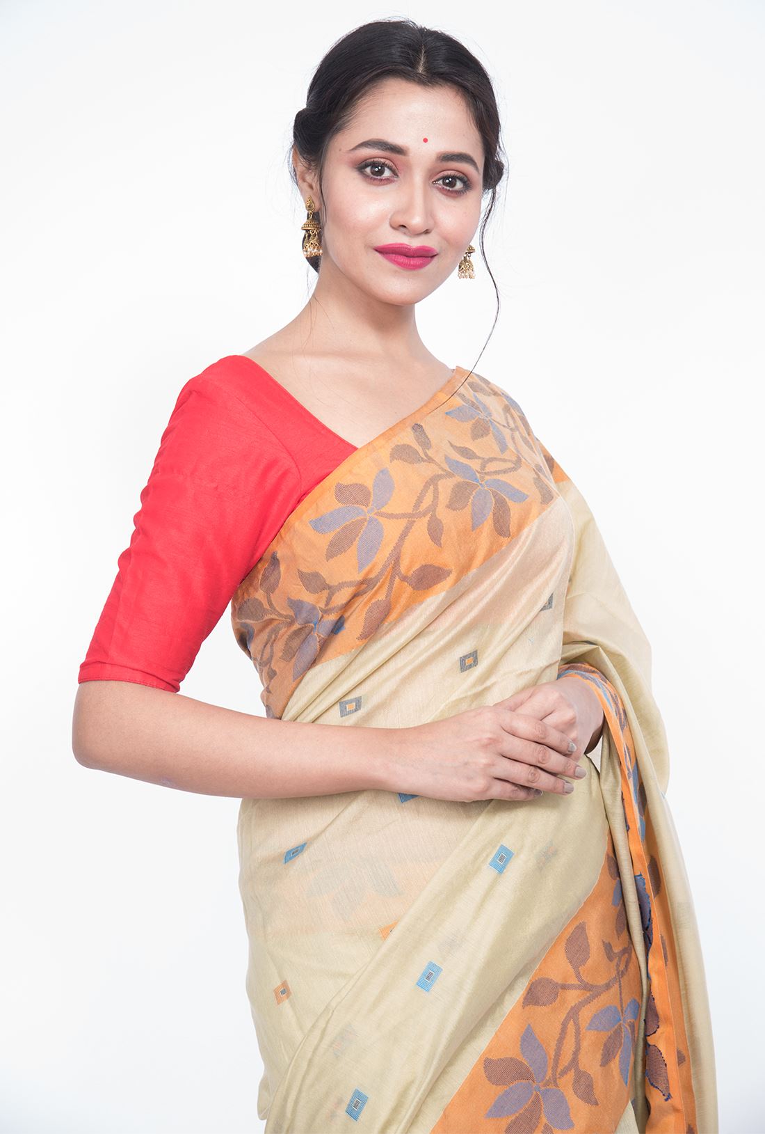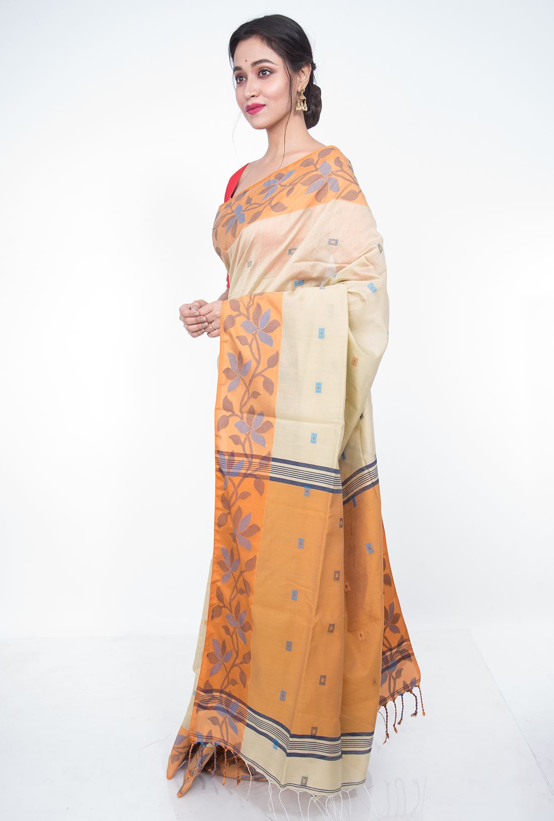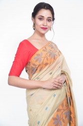 Border: Bright orange border Draws from the pallav with jamdani flower vines in shades og blue.