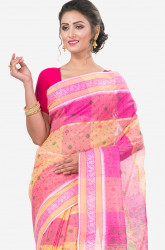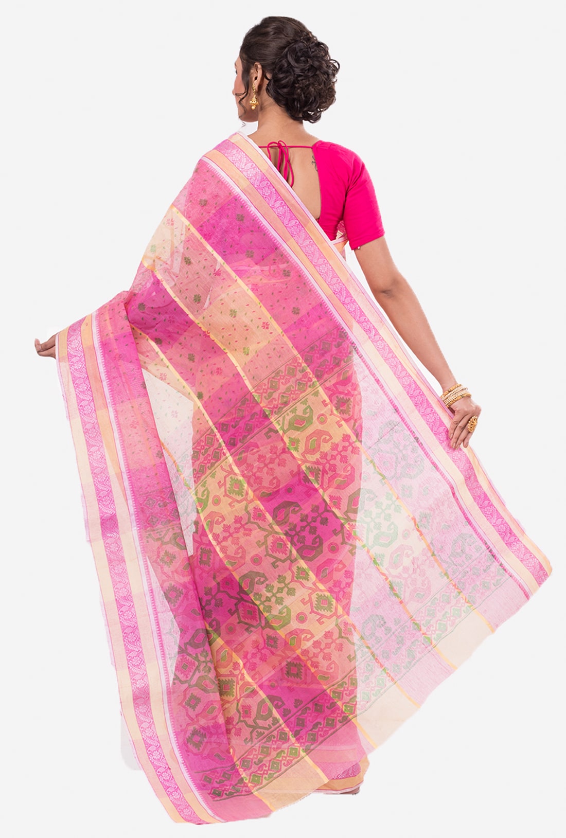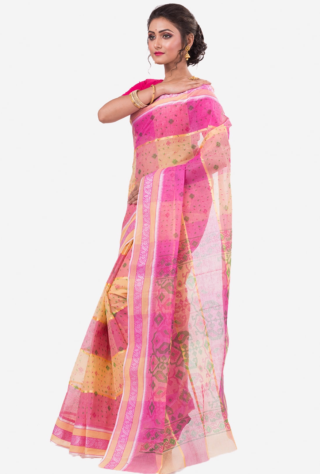Beige Pink Handwoven Bengal Tant Cotton Saree with jamdani pallu. The border is of pure tant cotton.