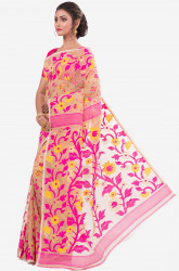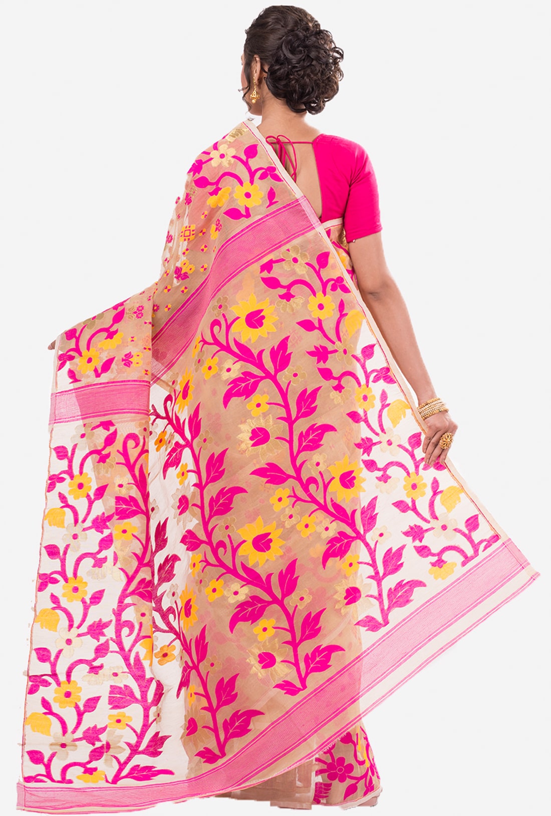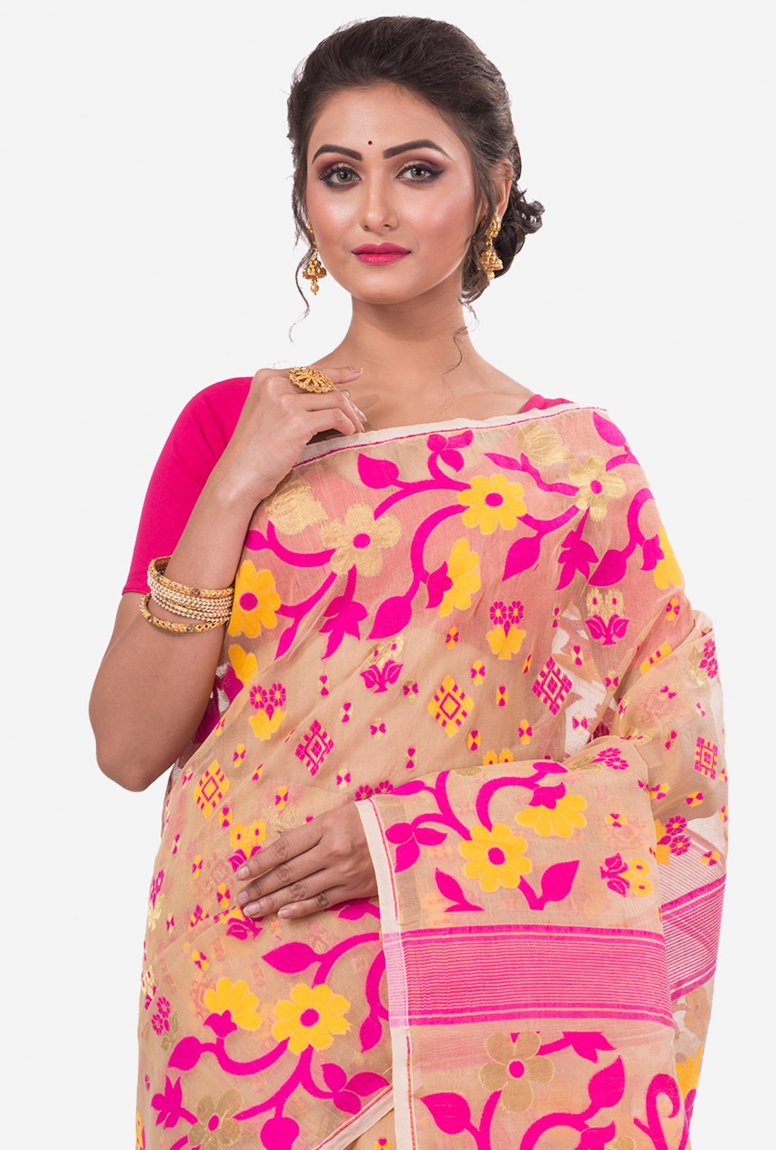 Beige Pink Dhakai Jamdani Handwoven saree with jamdani style pallu. The saree has all over weaving work.