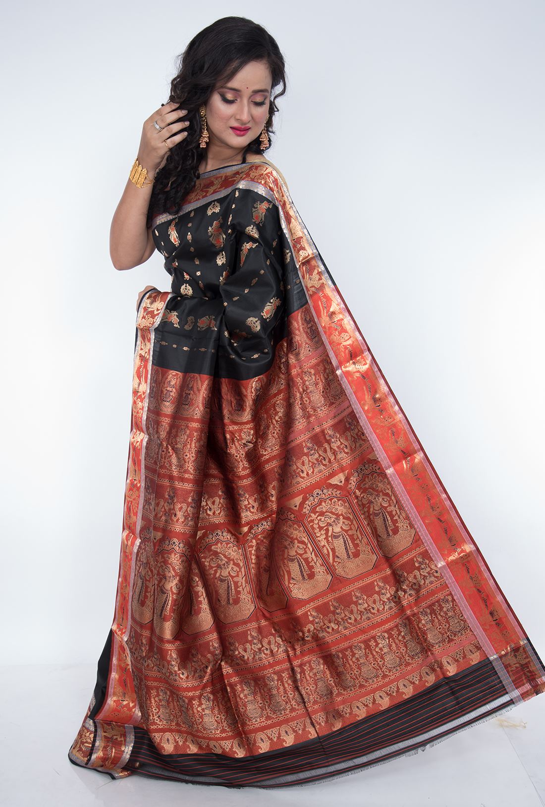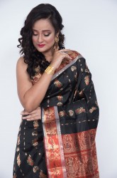Body: black body has figure buttas in golden zari towards the pallav of the saree and small buttas in the rest of the body.