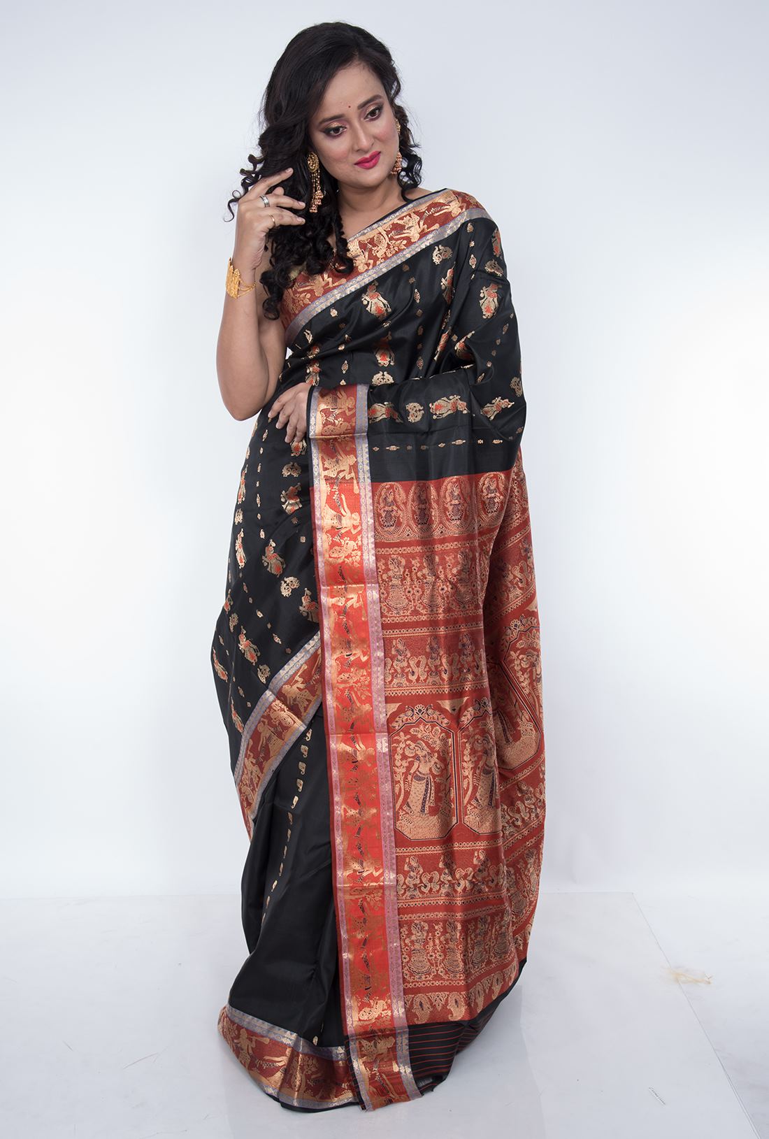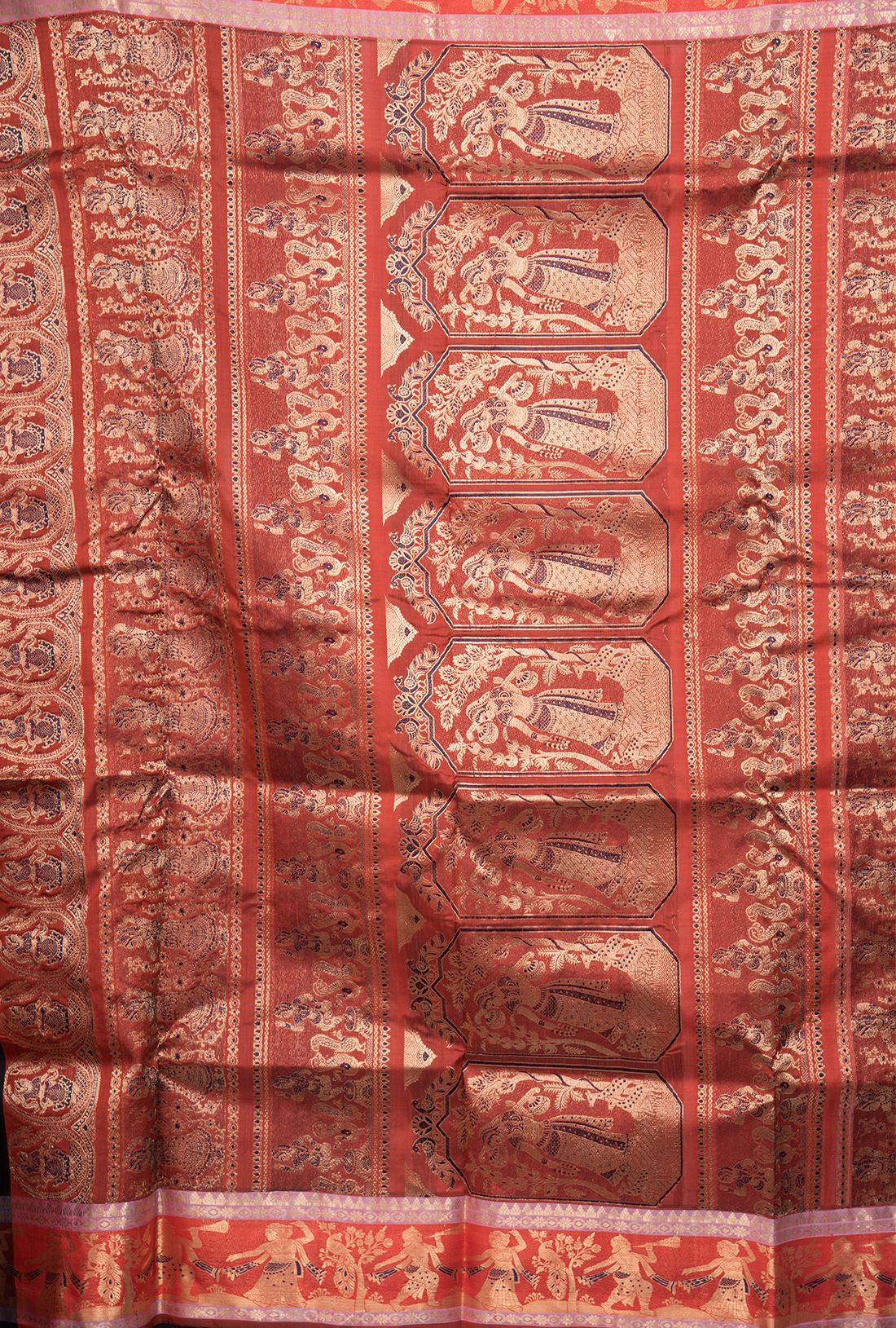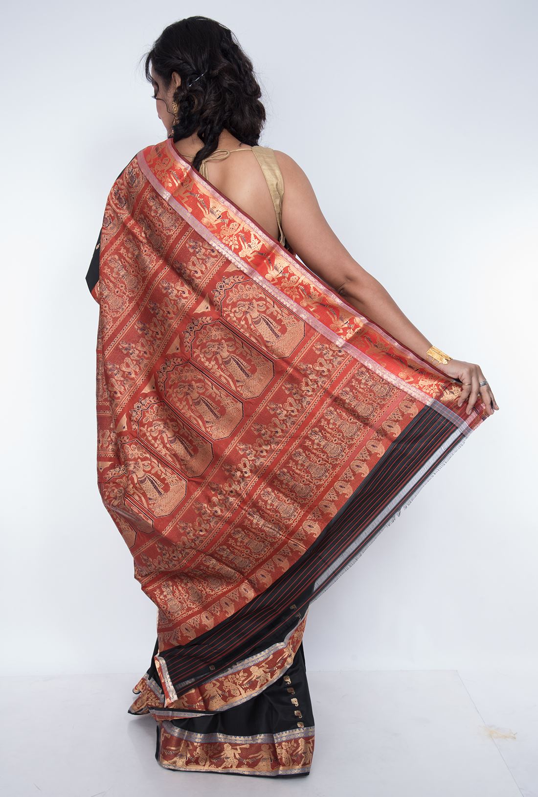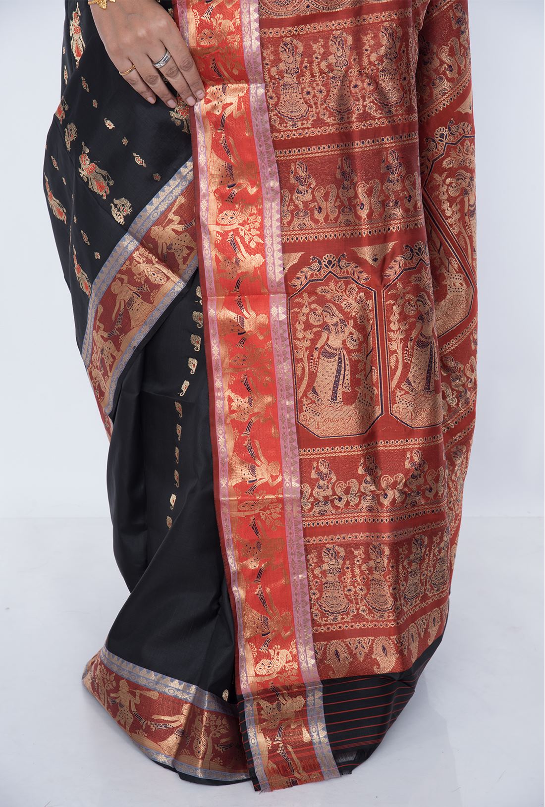 Pallav: Rust Pallav has an intricate Swarnachuri (golden zari) work in contrast to navy blue color where an exquisite dancing figure arts and peacock motifs making the saree extremely gorgeous & beautiful.