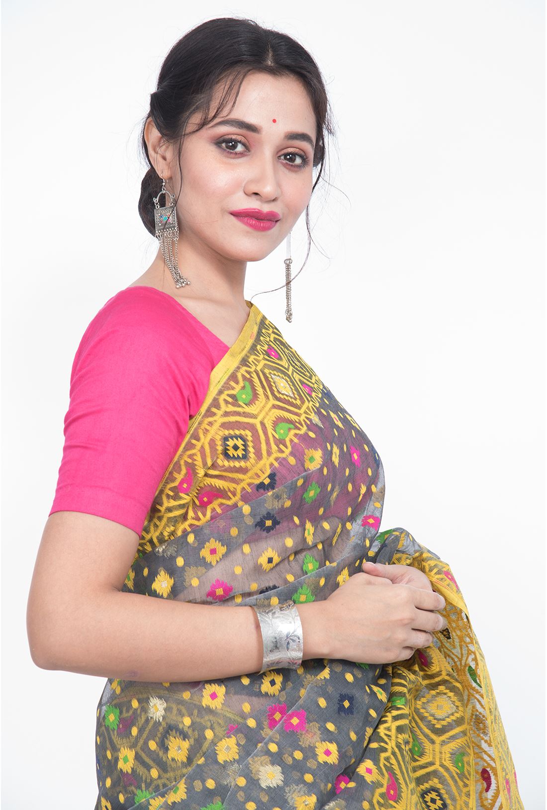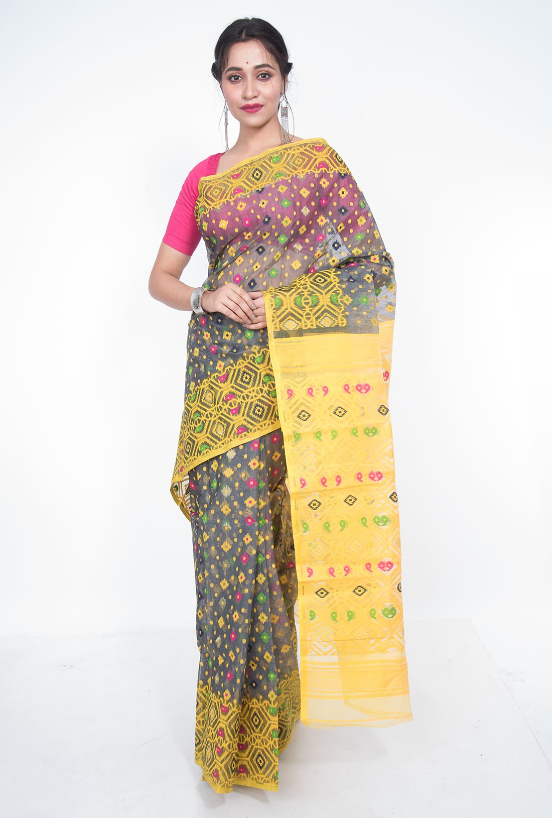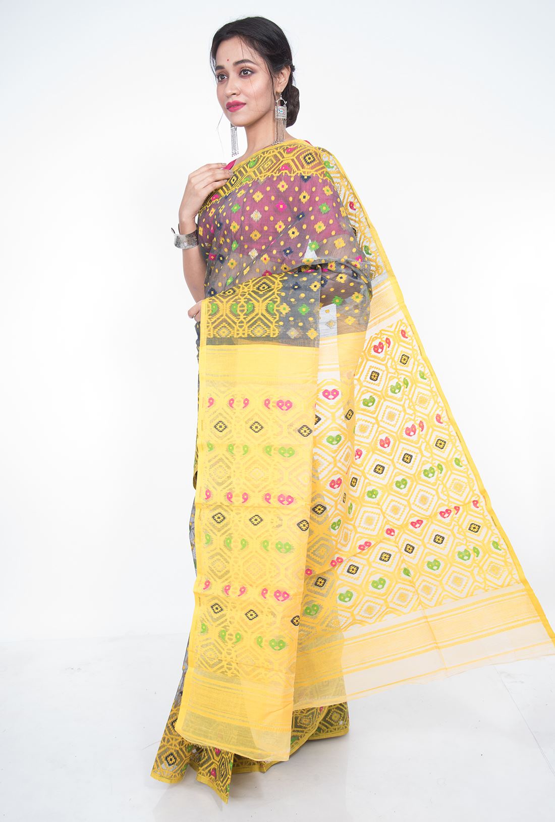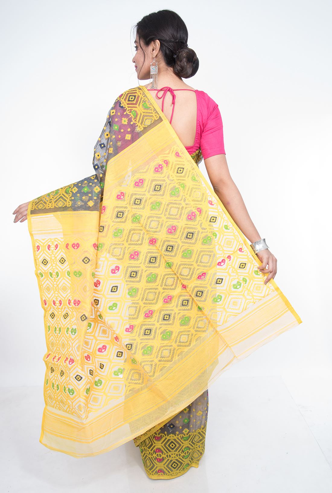 Pallav: Geometrical jamdani work in bright yellow running all over the pallav to give the saree an outstanding look.