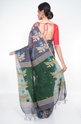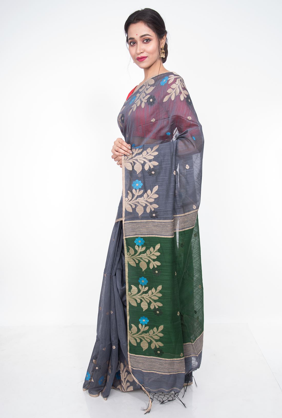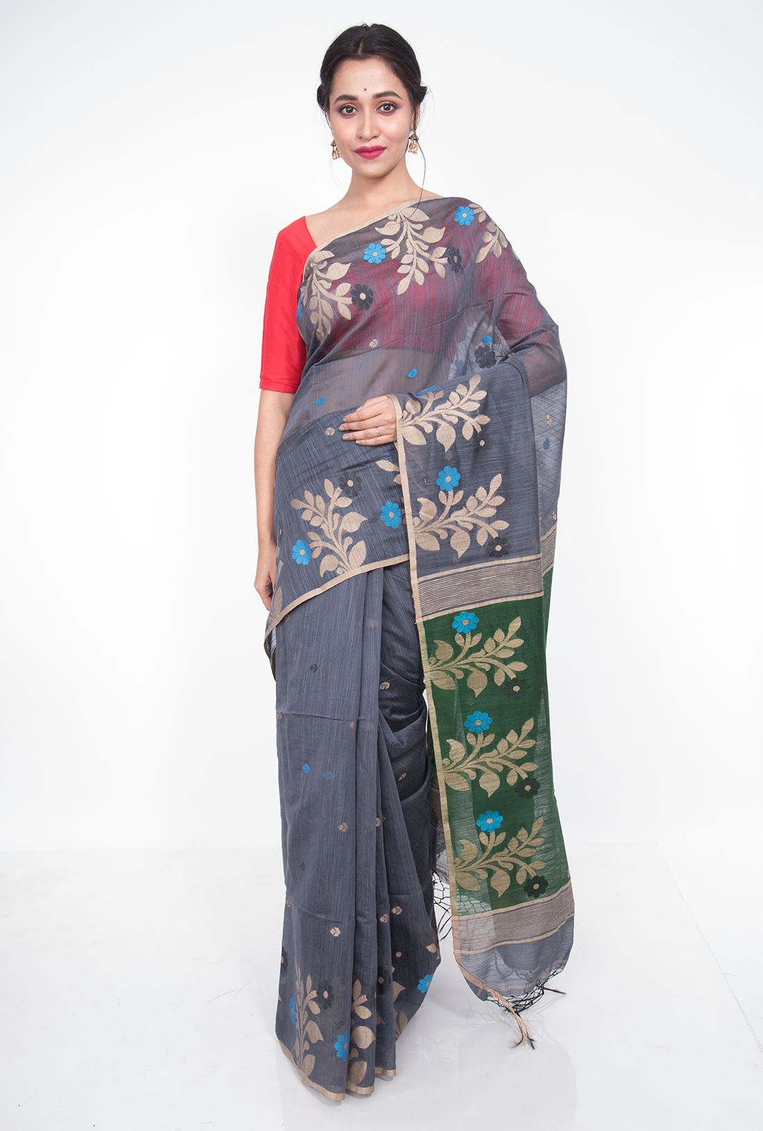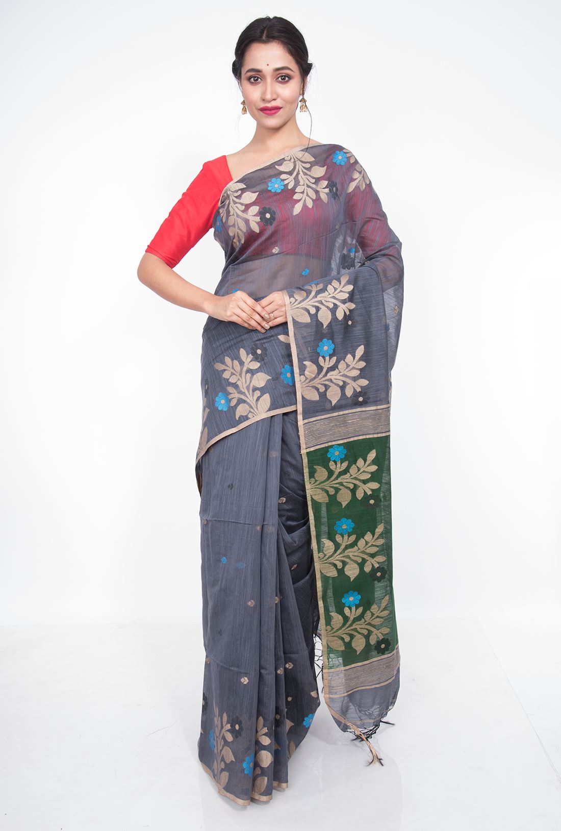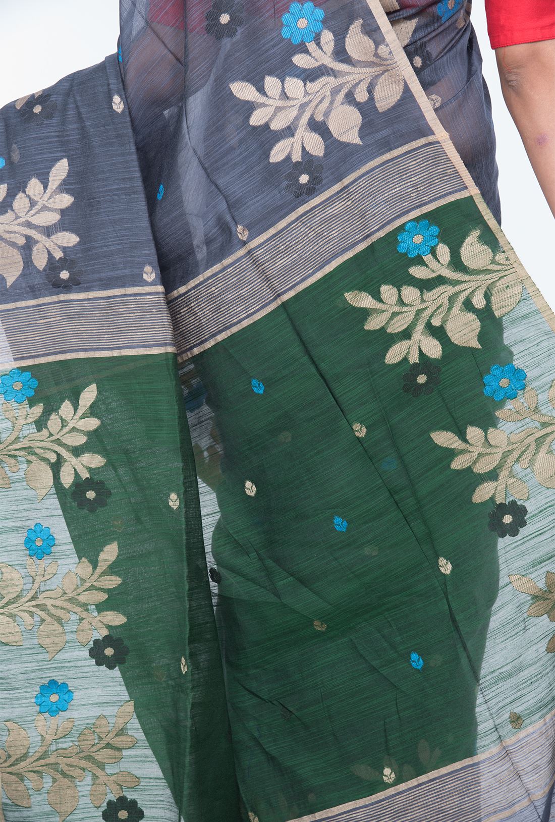 Pallav: In contrast with the blue grey body, dark green Pallav with small buttas all over it with beautiful jamdani floral work in golden and blue at both side of the border creates the look simple yet rich and elegant.