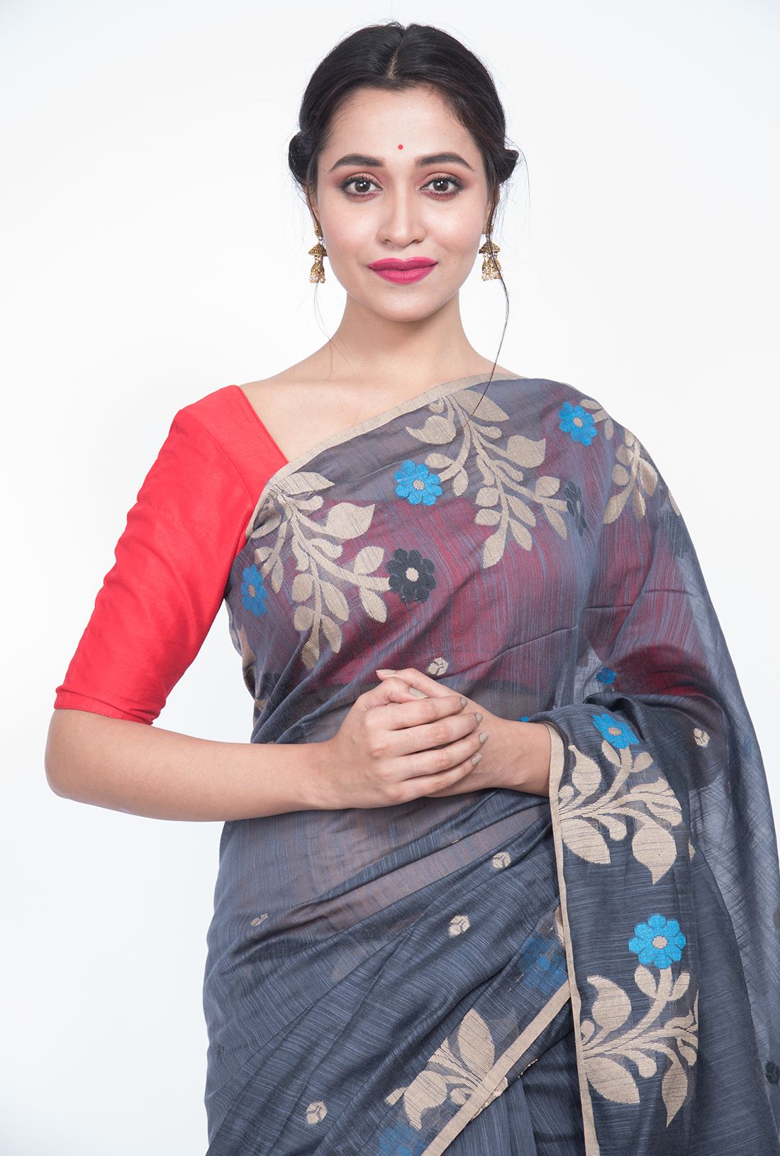 Border: Beautiful and big jamdani floral motifs in golden and blue on both side borders, create the ultimate look of the saree.