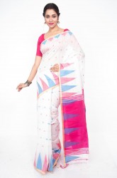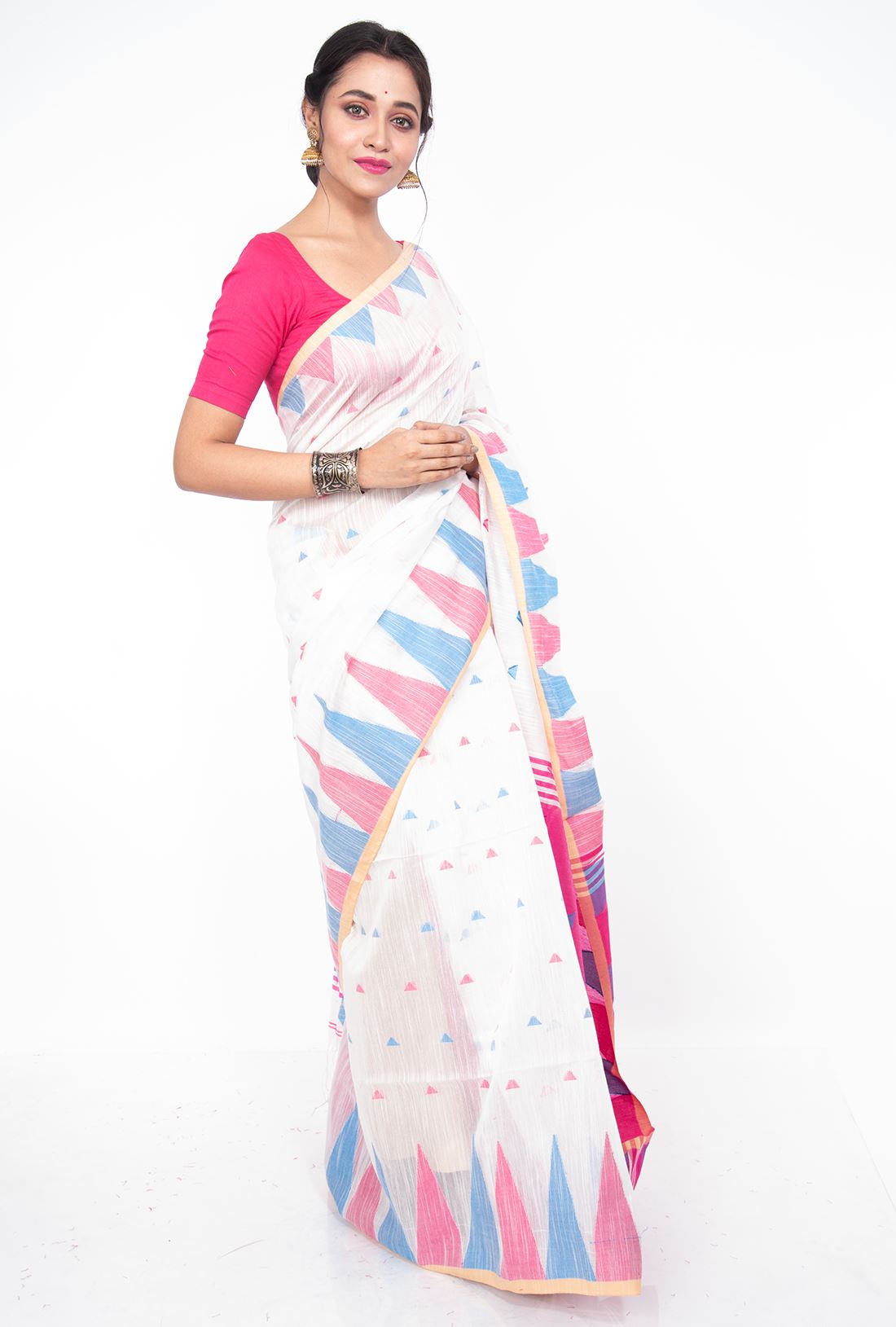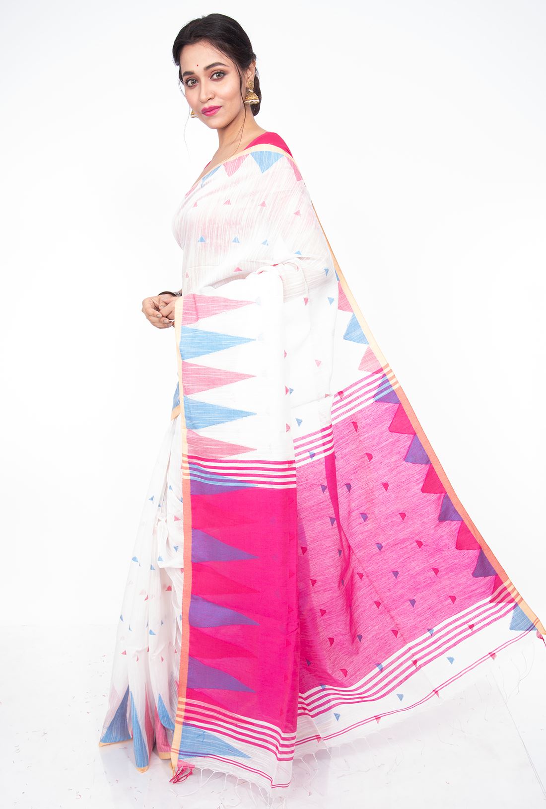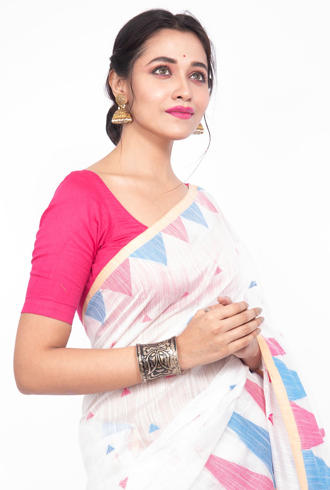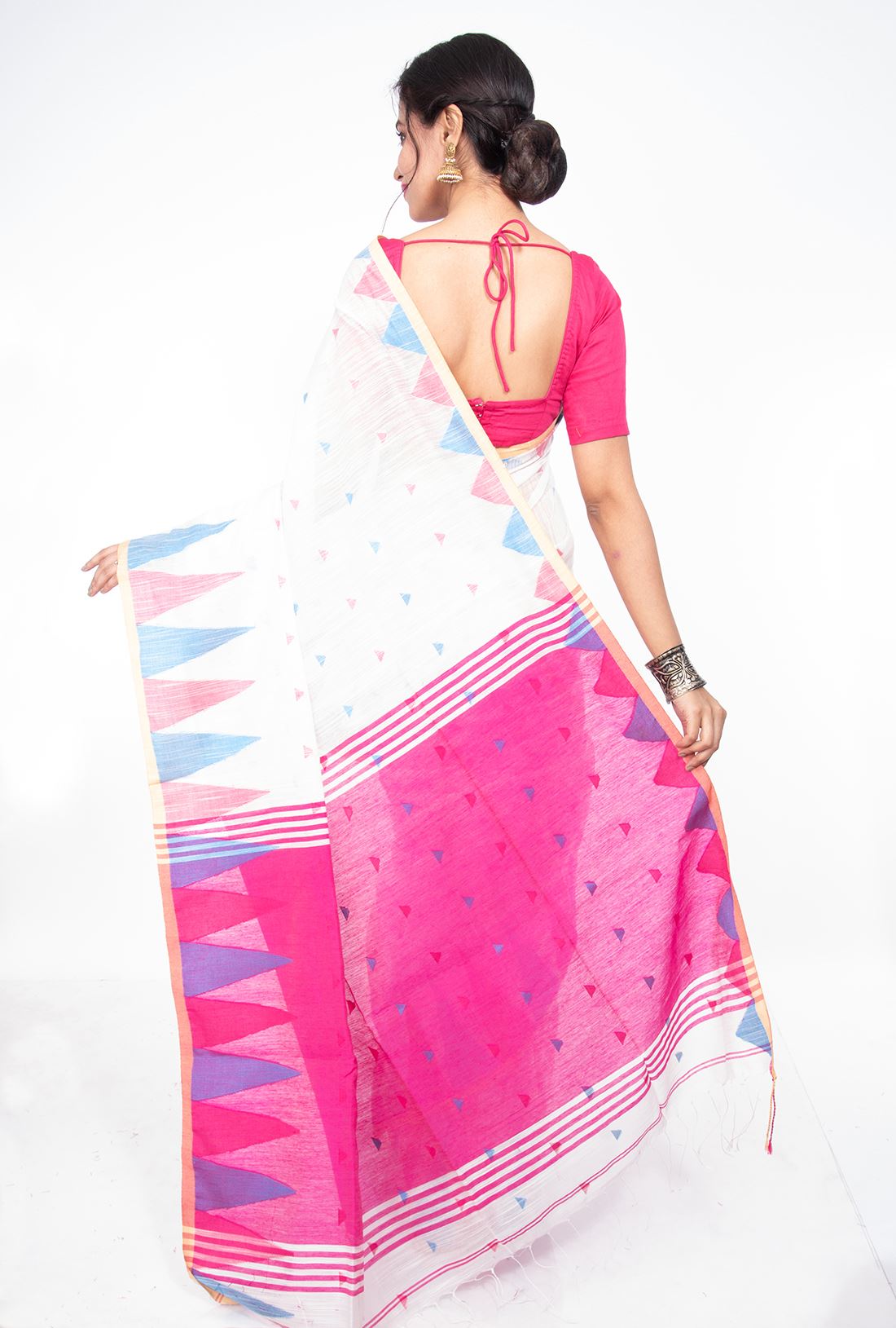Pallav: Deep Pink Pallav with small triangle buttas in blue and pink all over it.
