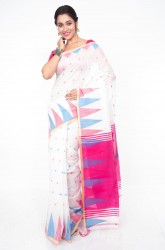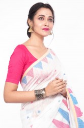 Border: The bottom part of the saree has long temple border and upper part of the saree has short temple border in pink and blue with a narrow golden border on both the edges.