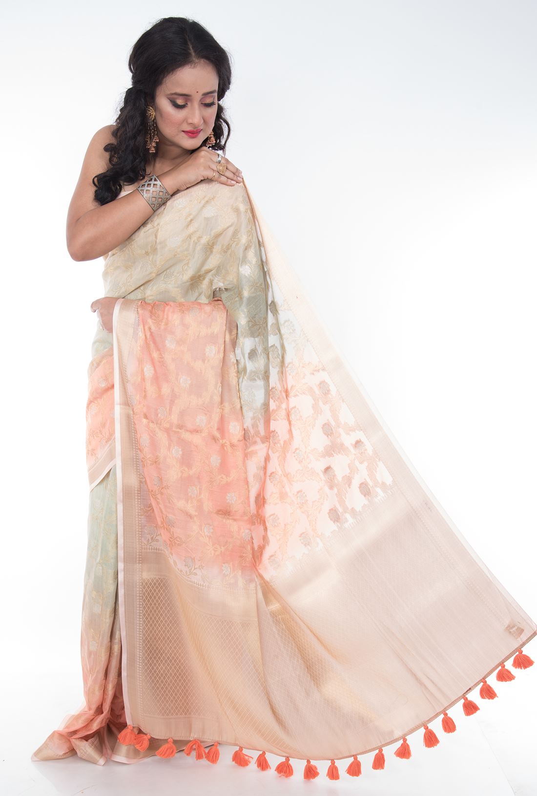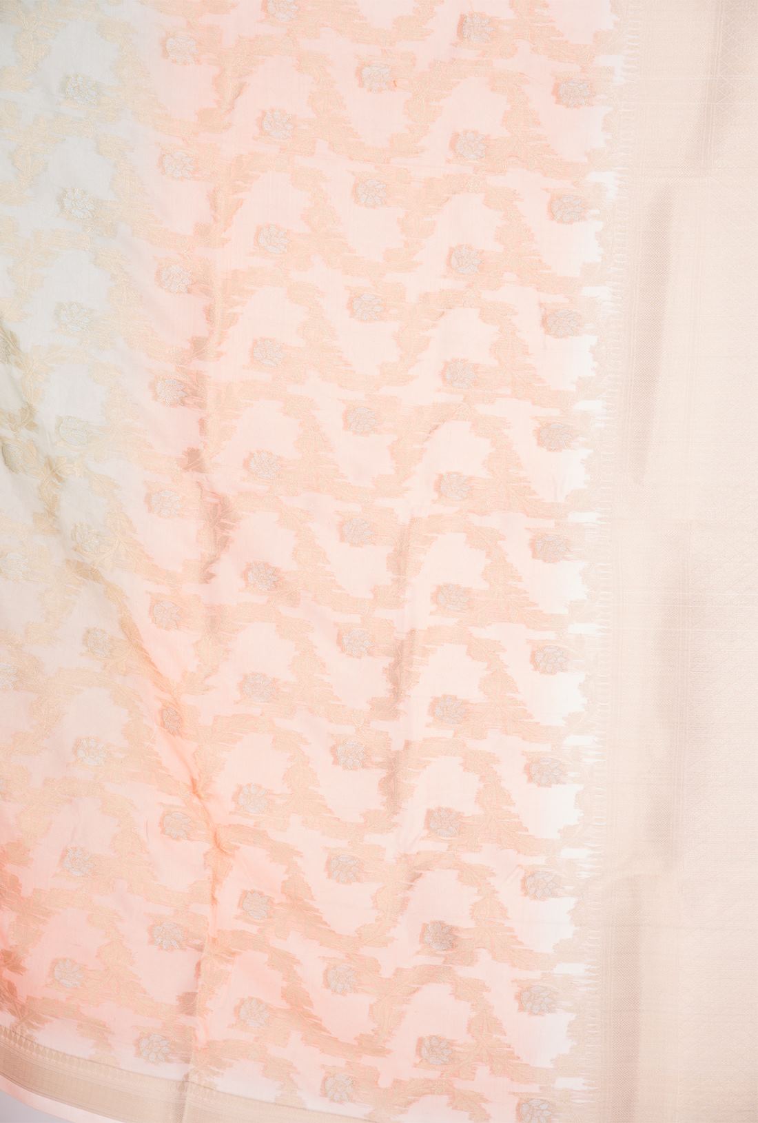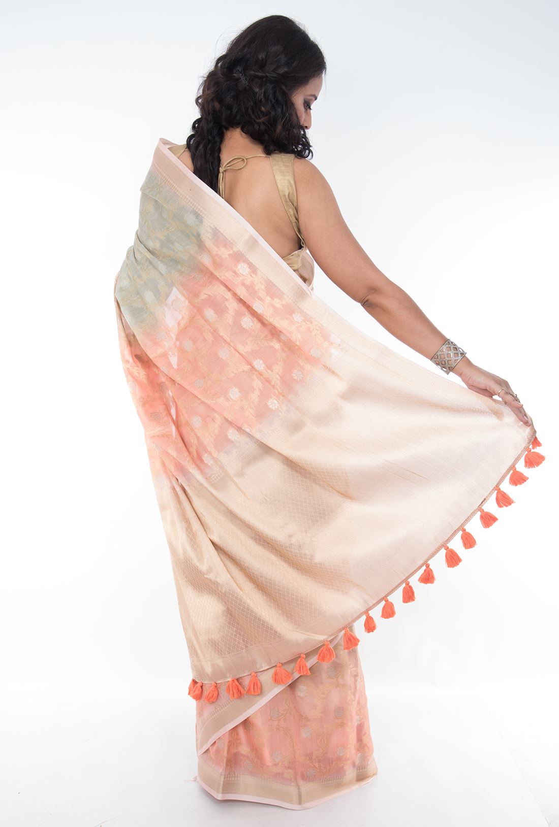 Body: Multi dyed peach & creme body has golden zari floral jaal work is simply beautiful