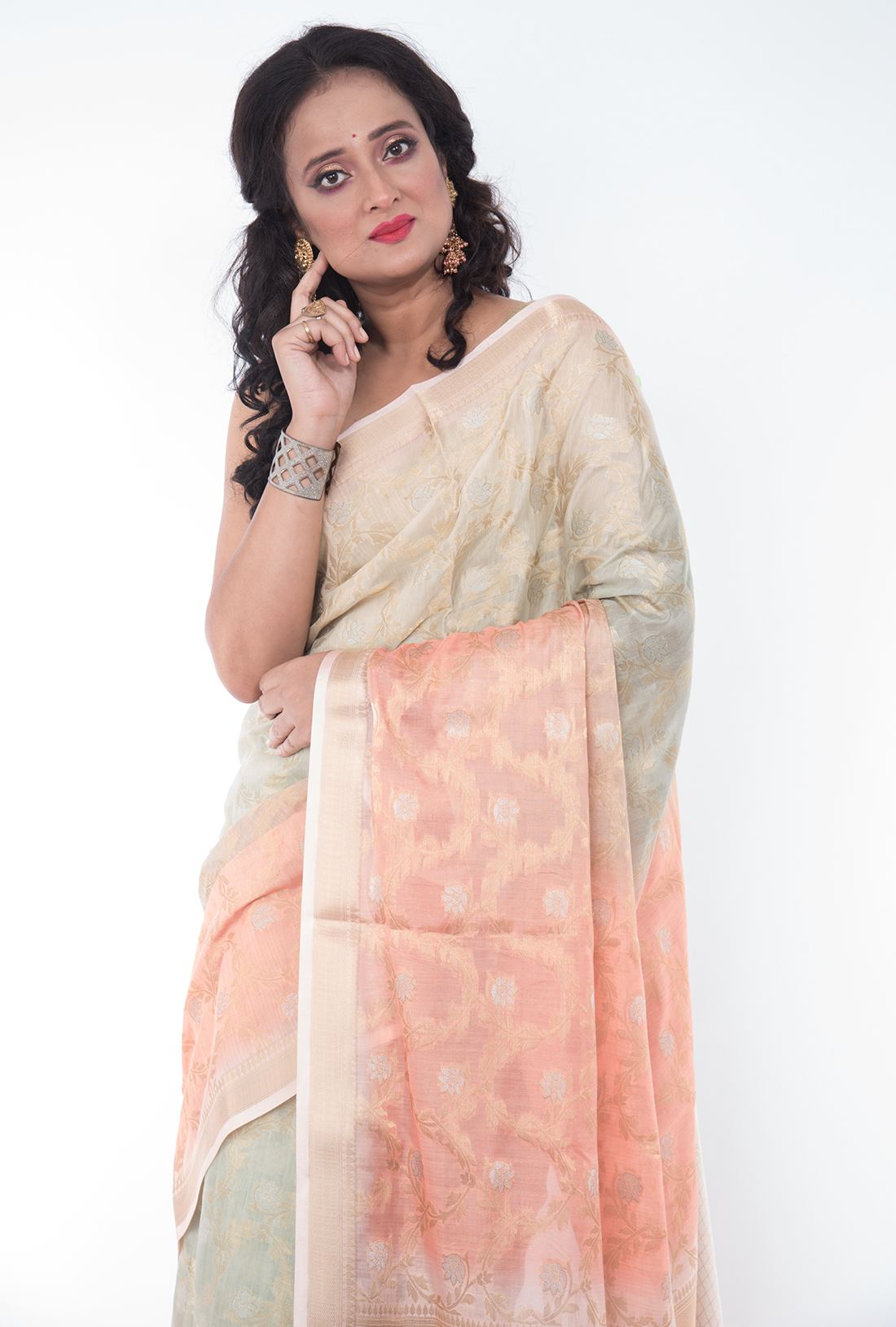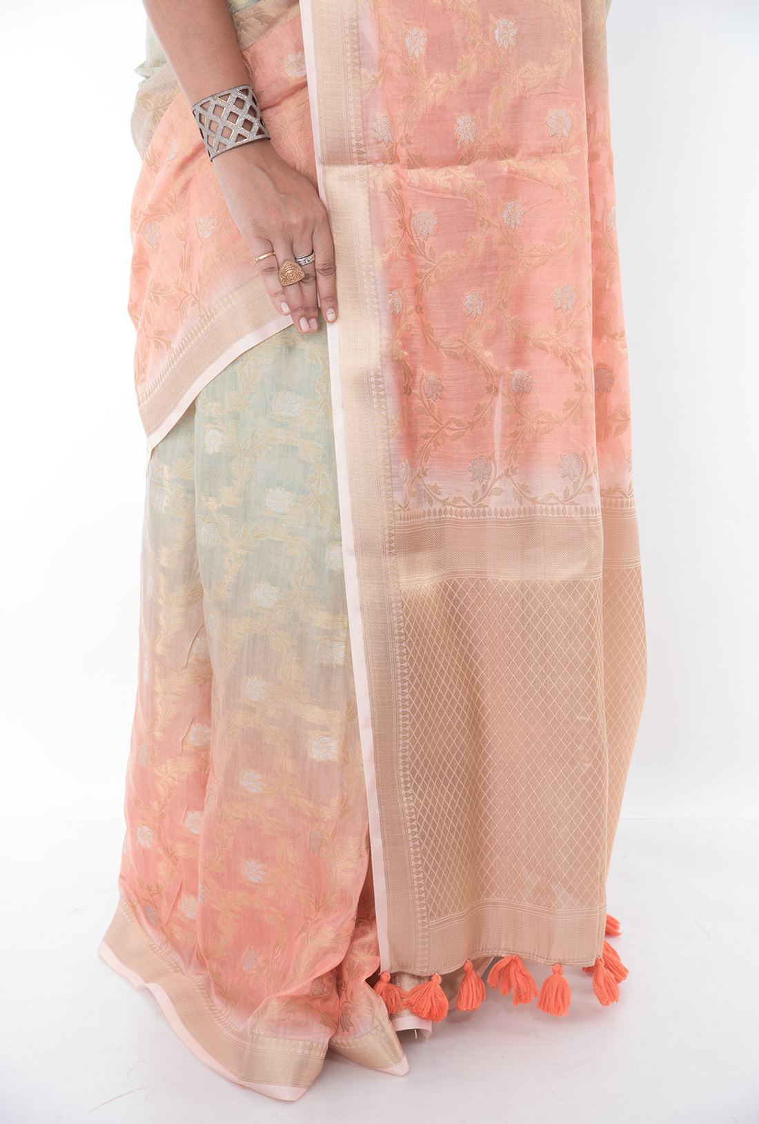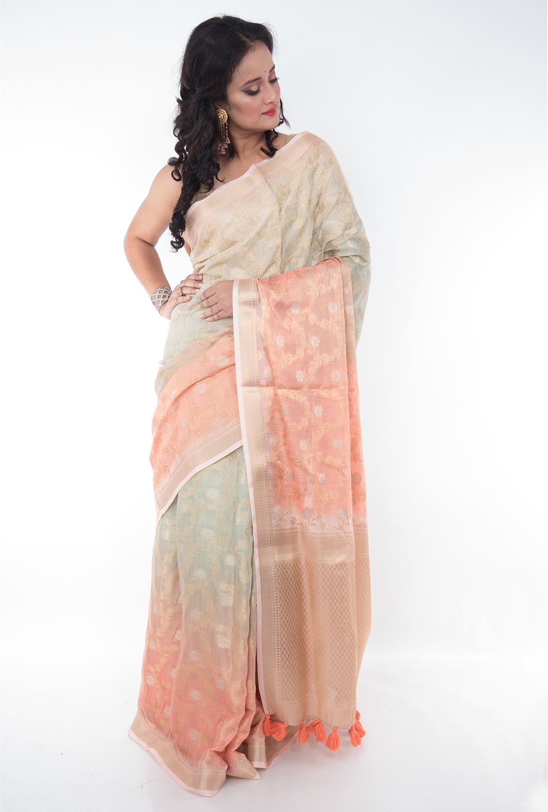 Body: Multi dyed peach & creme body has golden zari floral jaal work is simply beautiful