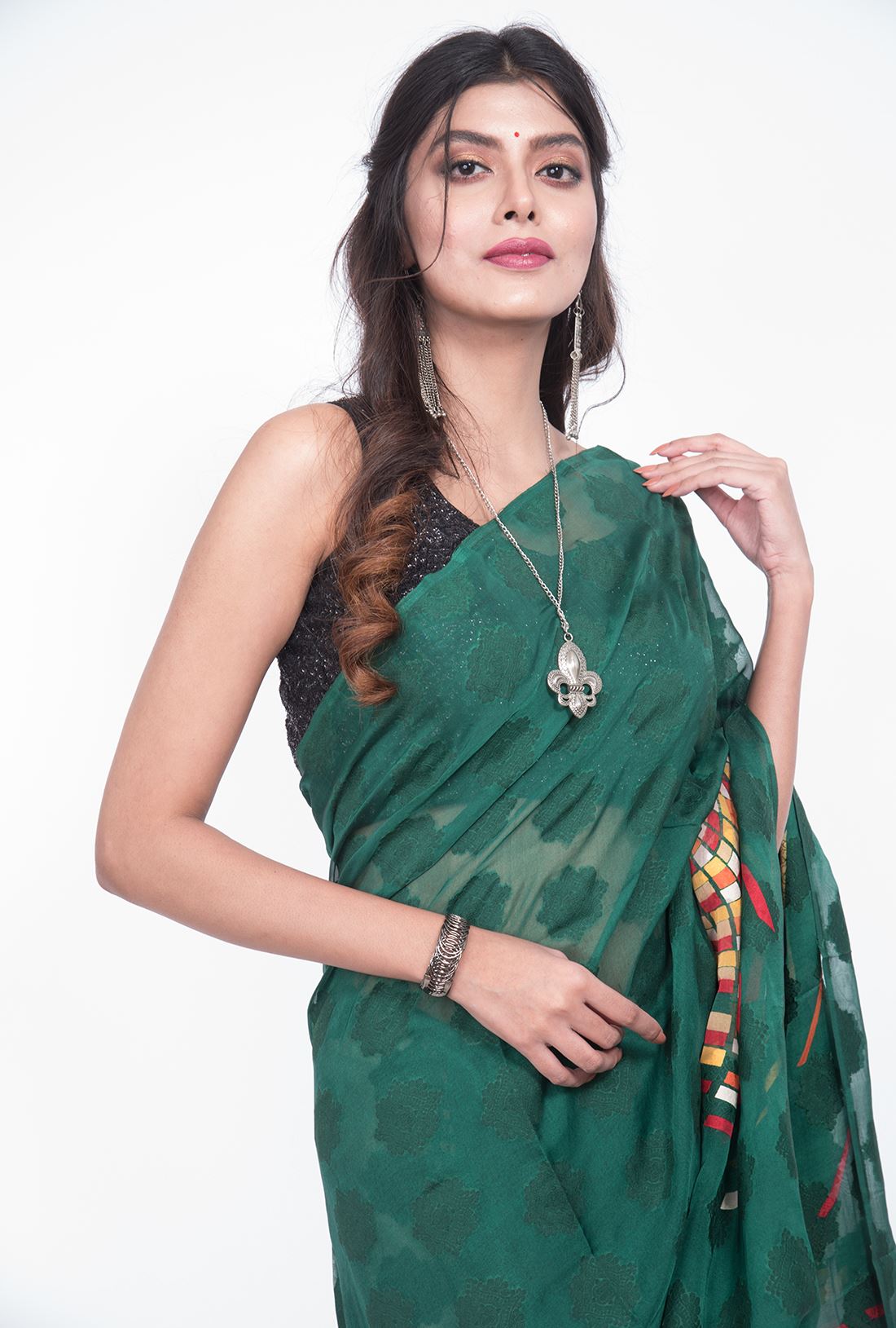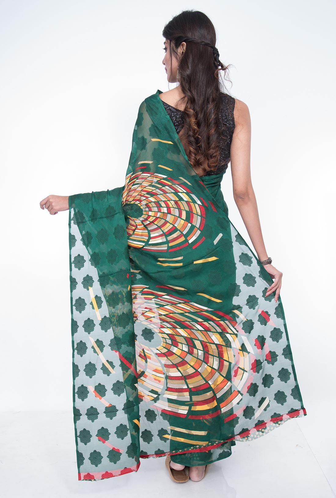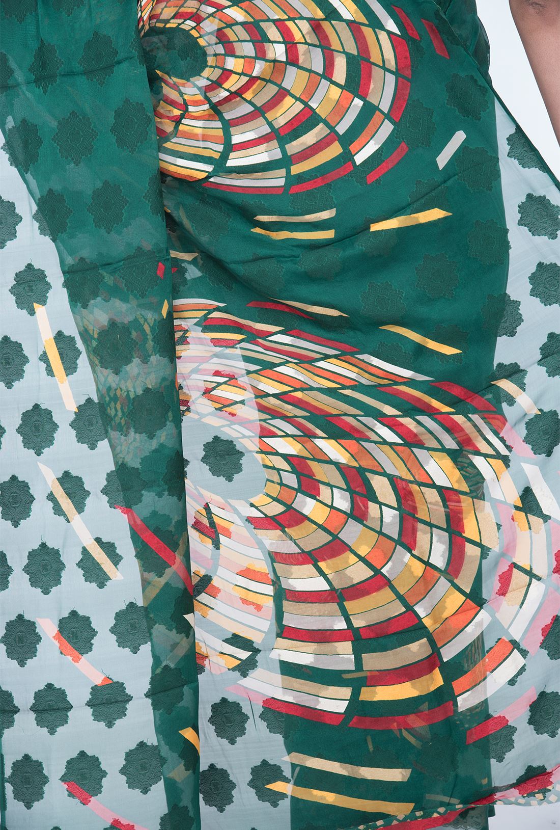 Pallav: Translucent dark green pallav has self color small floral prints with a multicolor contemporary galaxy print design.