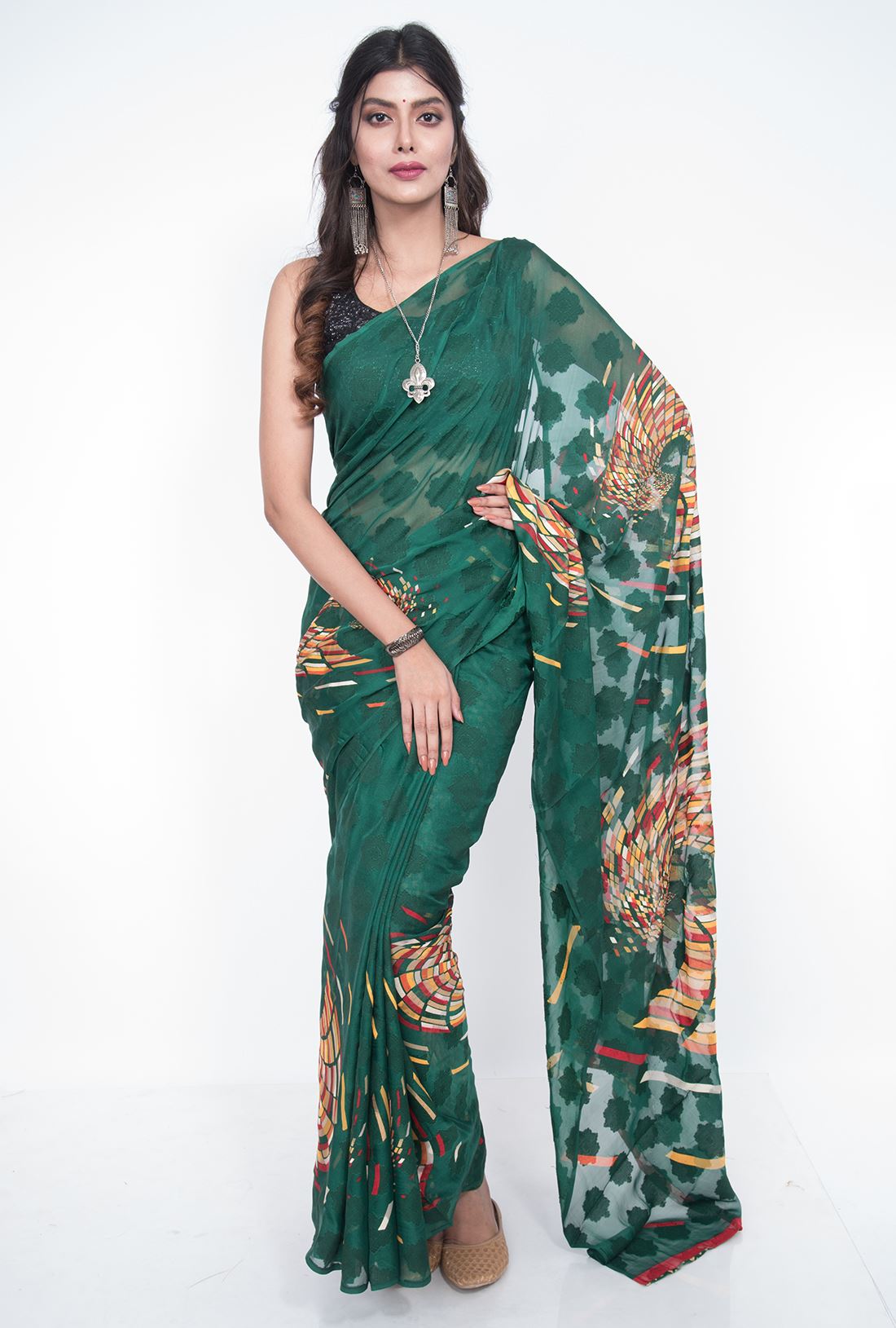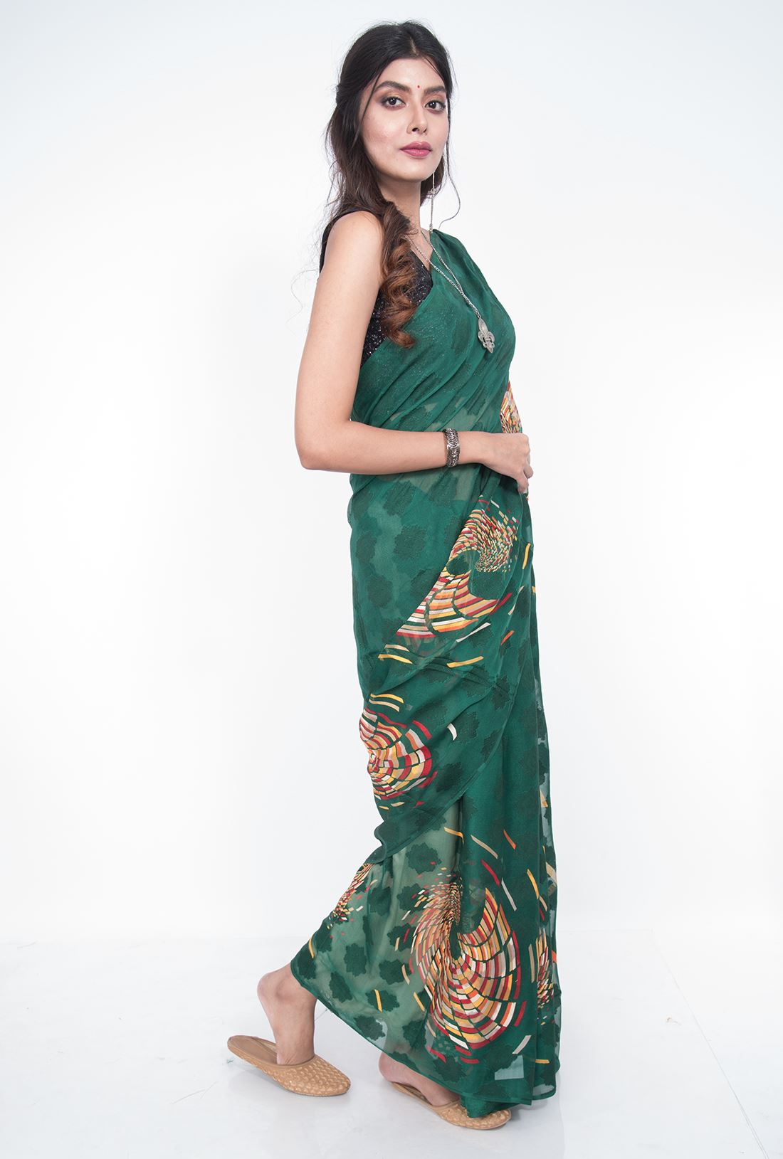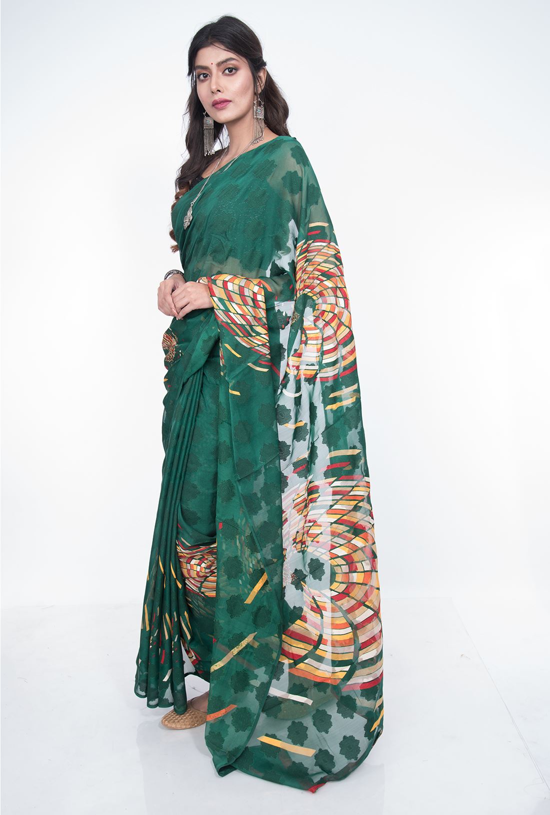 Pallav: Translucent dark green pallav has self color small floral prints with a multicolor contemporary galaxy print design.