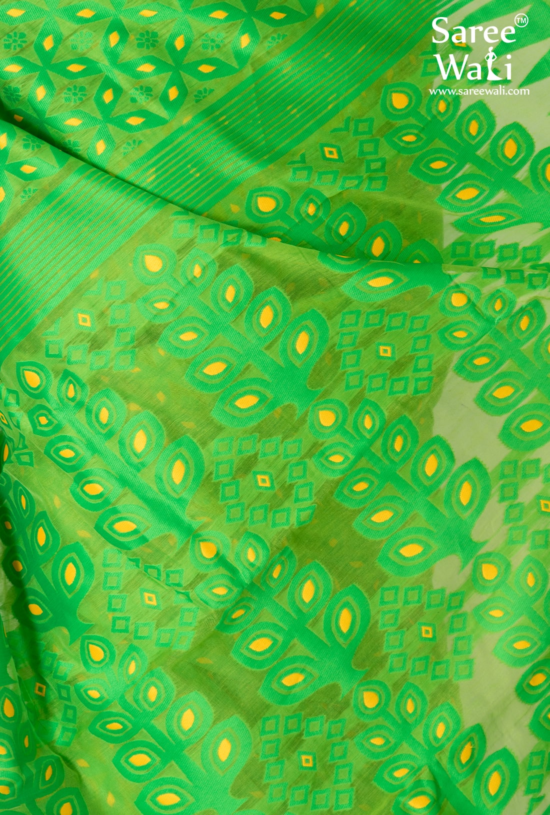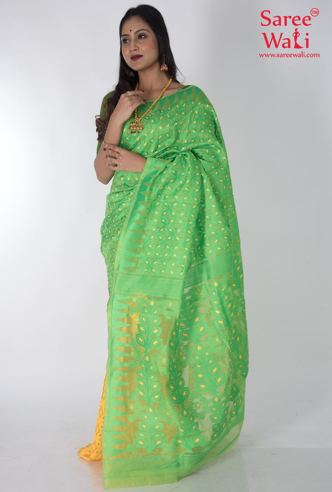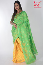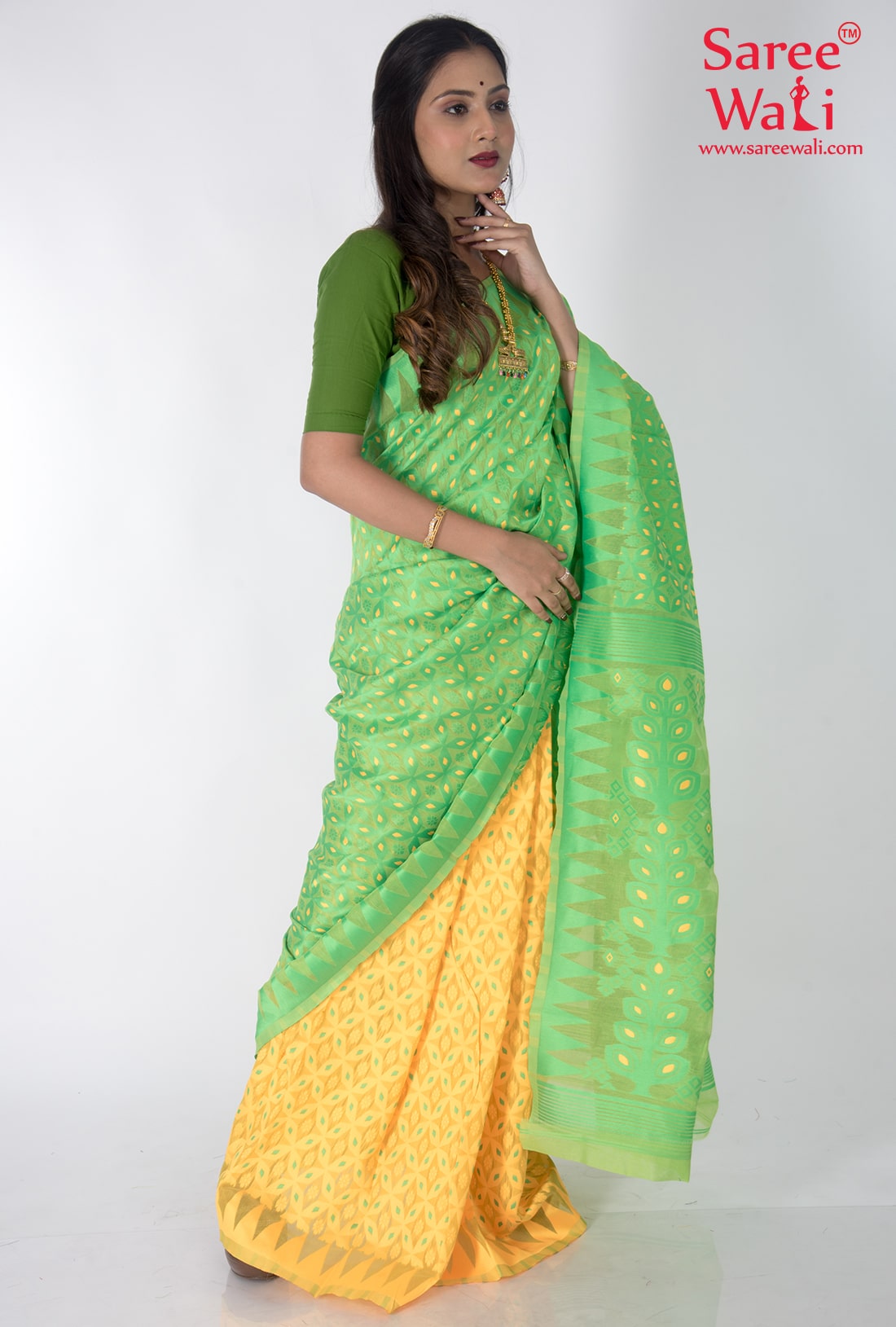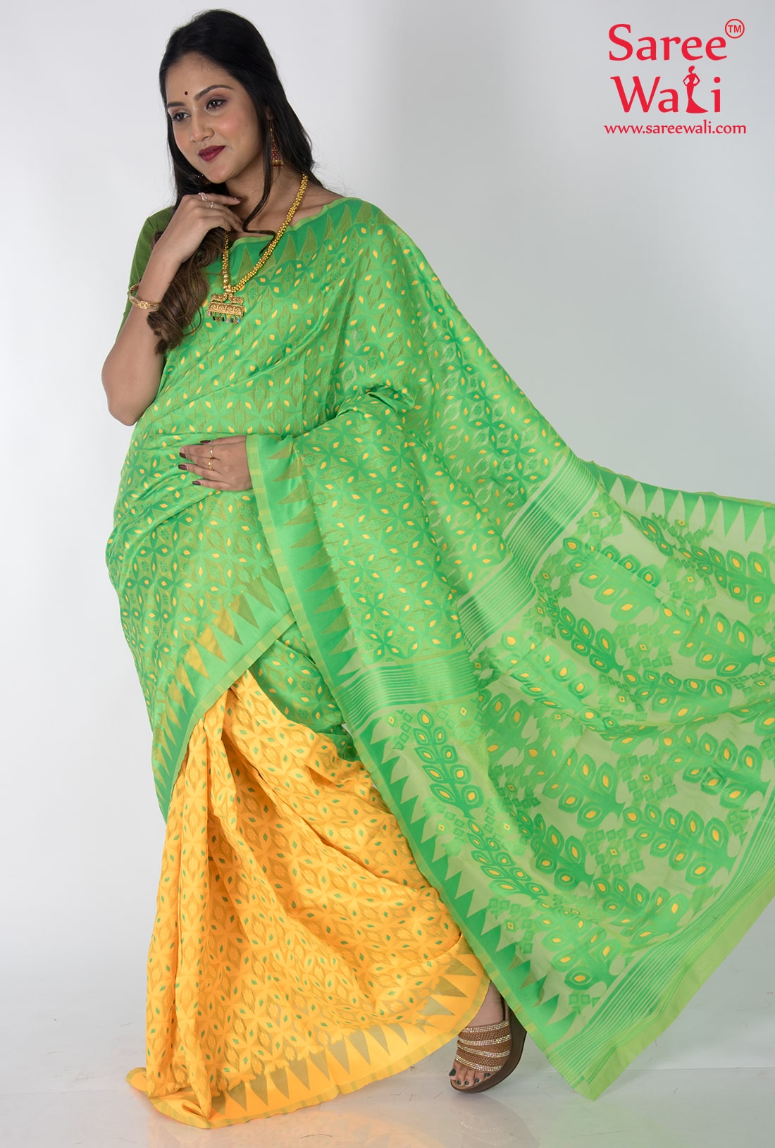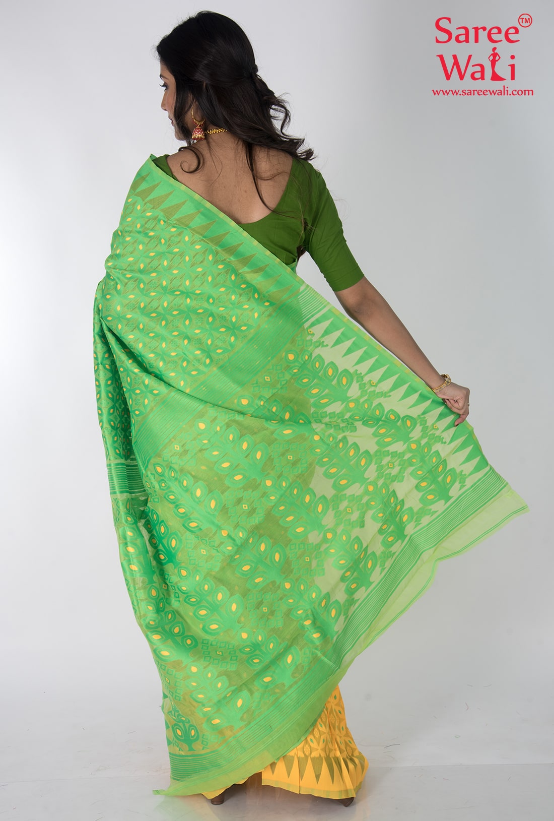 Green Yellow Cotton Work Dhakai Jamdani Saree SWHL0013