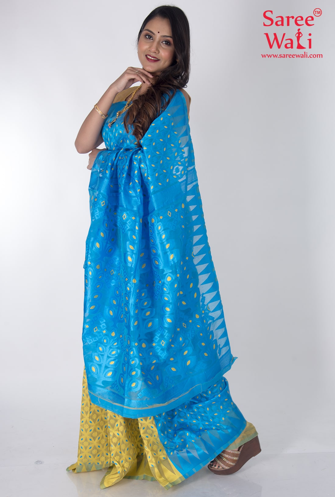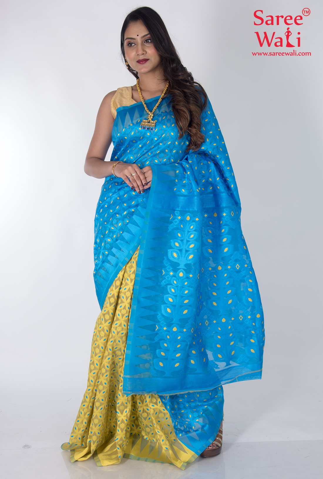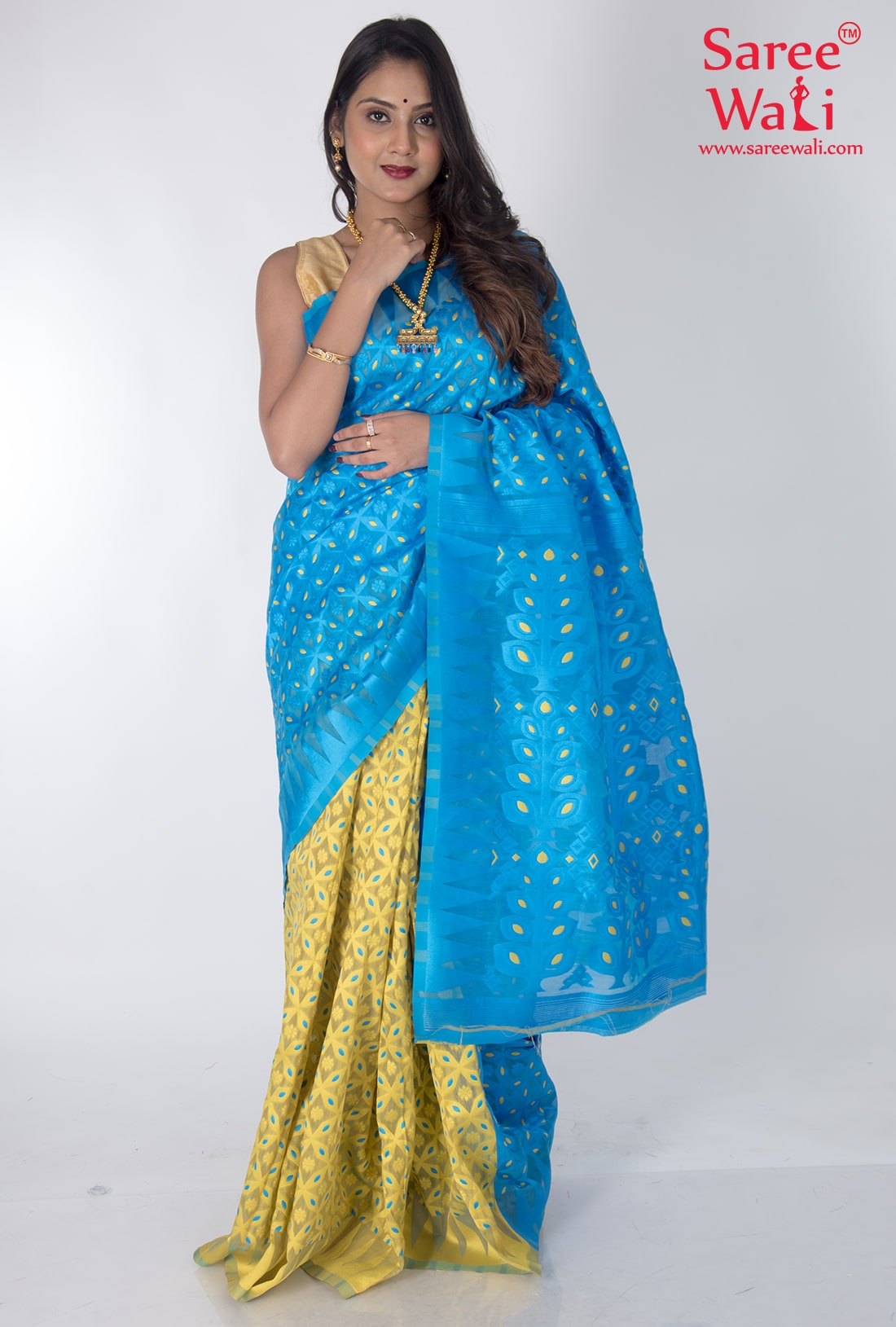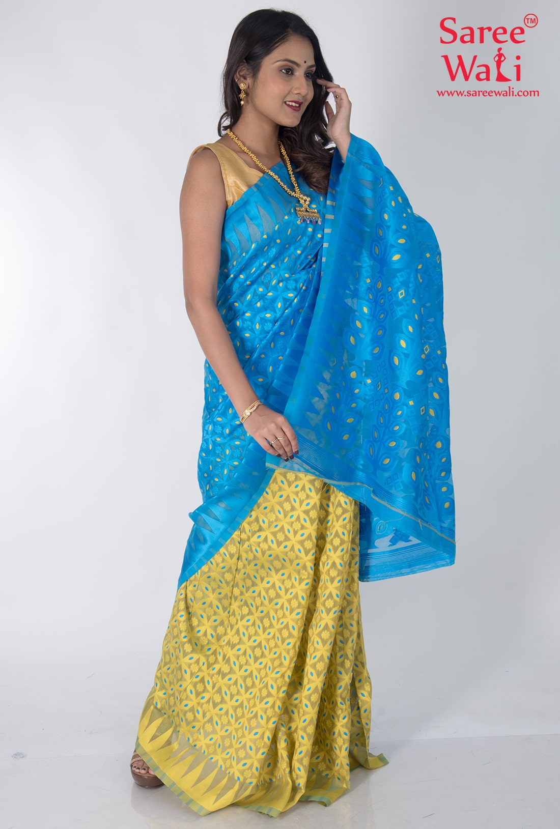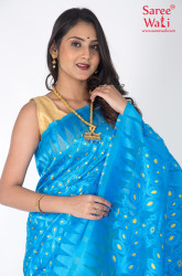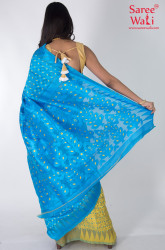Blue Yellow Cotton Work Dhakai Jamdani Saree SWHL0042