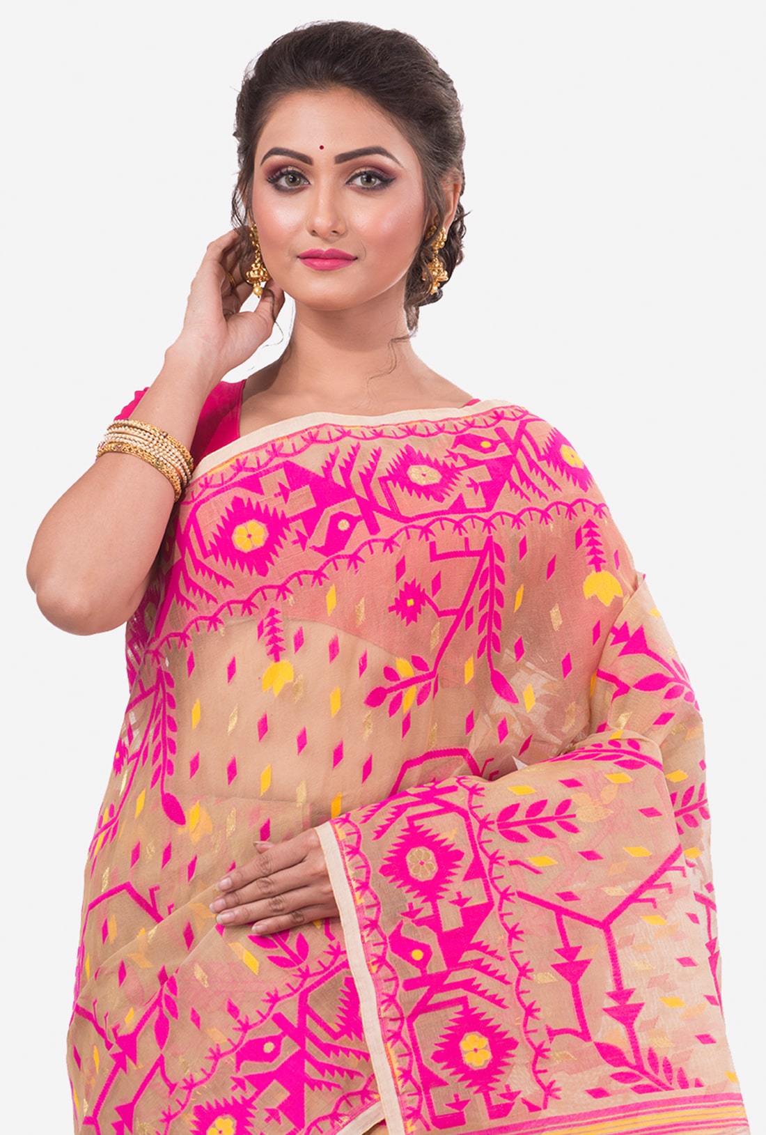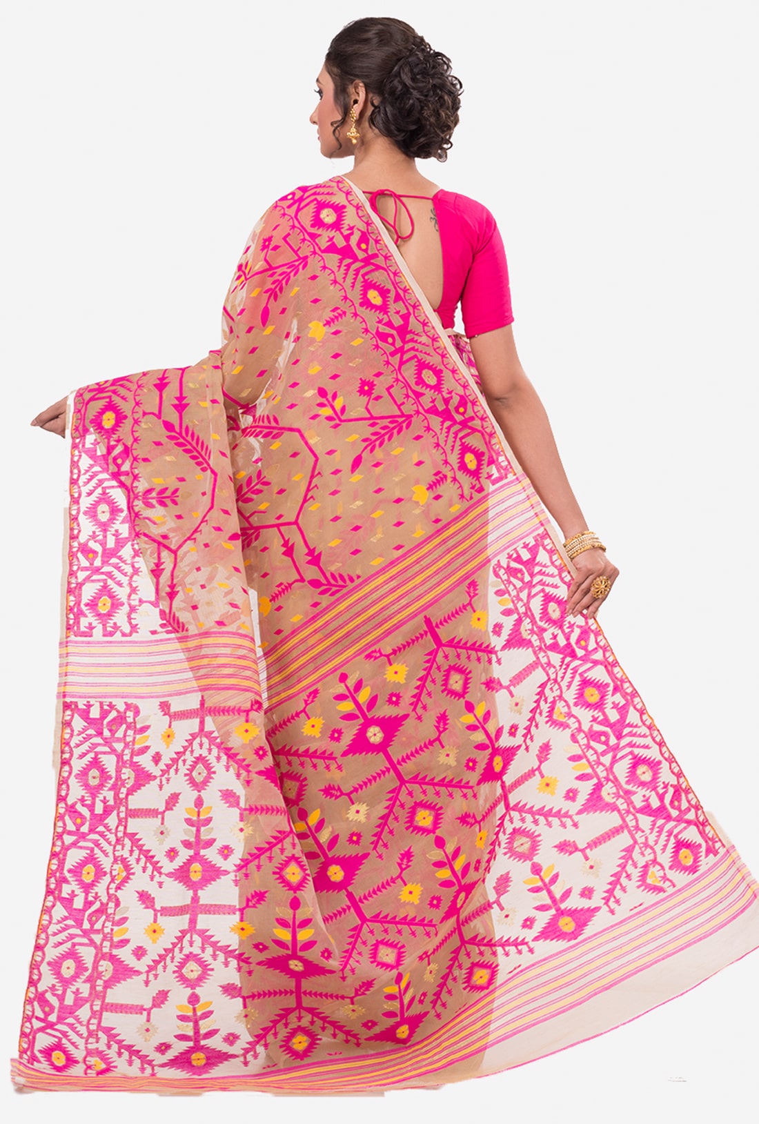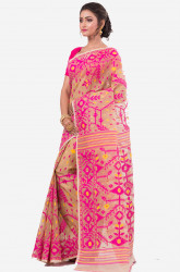 Fuchsia Pink Cream Dhakai Jamdani Handwoven saree with jamdani style pallu. The saree has all over weaving work.