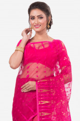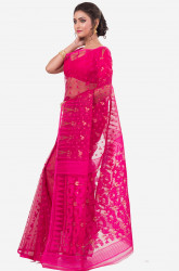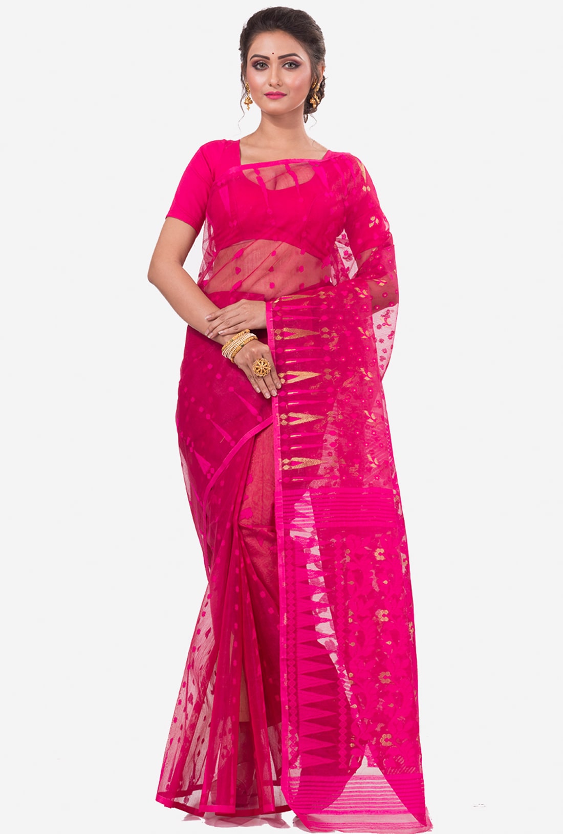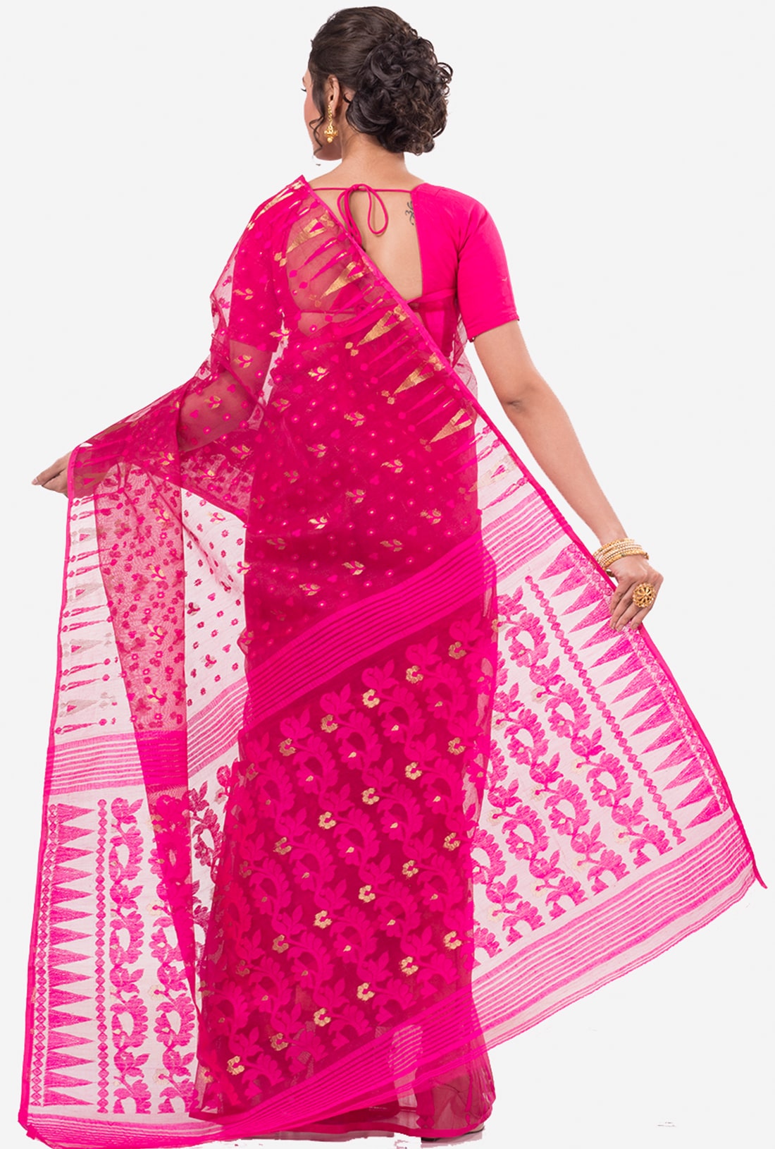 Fuchsia Pink Dhakai Jamdani Handwoven saree with jamdani style pallu. The saree has all over weaving work.