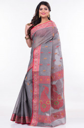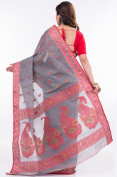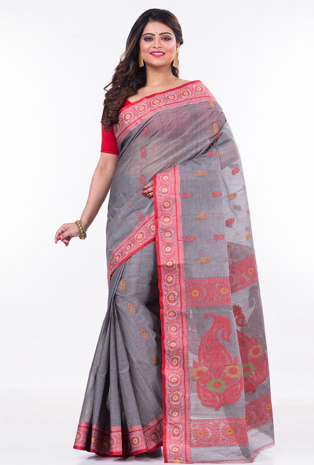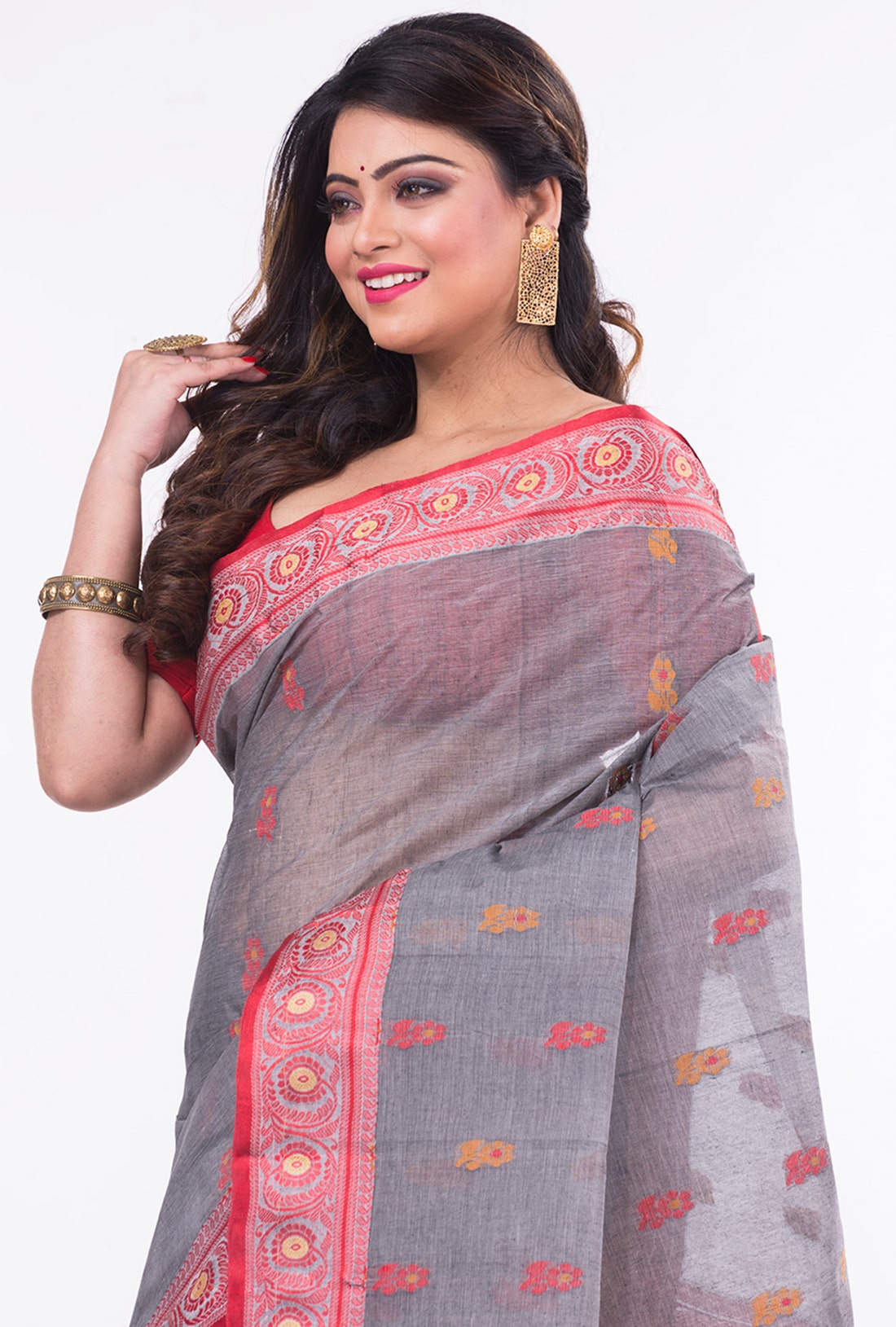 Handwoven grey red Bengal Tant Cotton saree with jamdani pallu. Border is made of fine velvet jamdani. Easy to wear, maintain and drape.