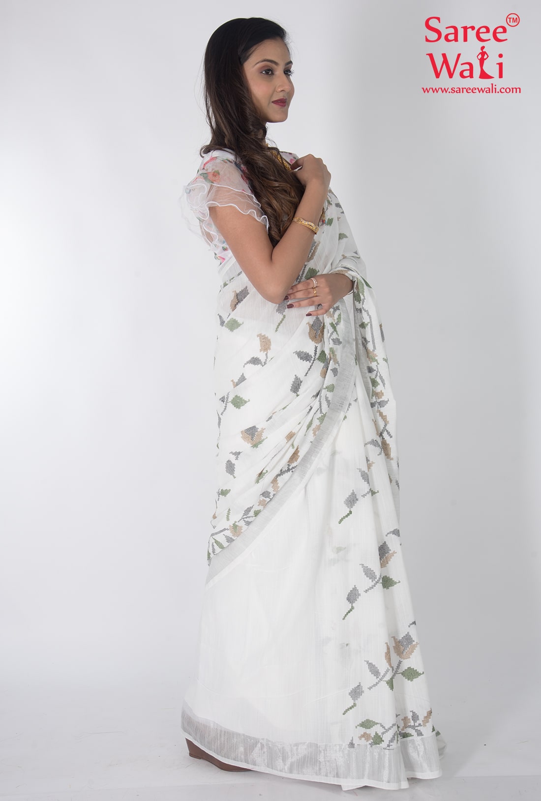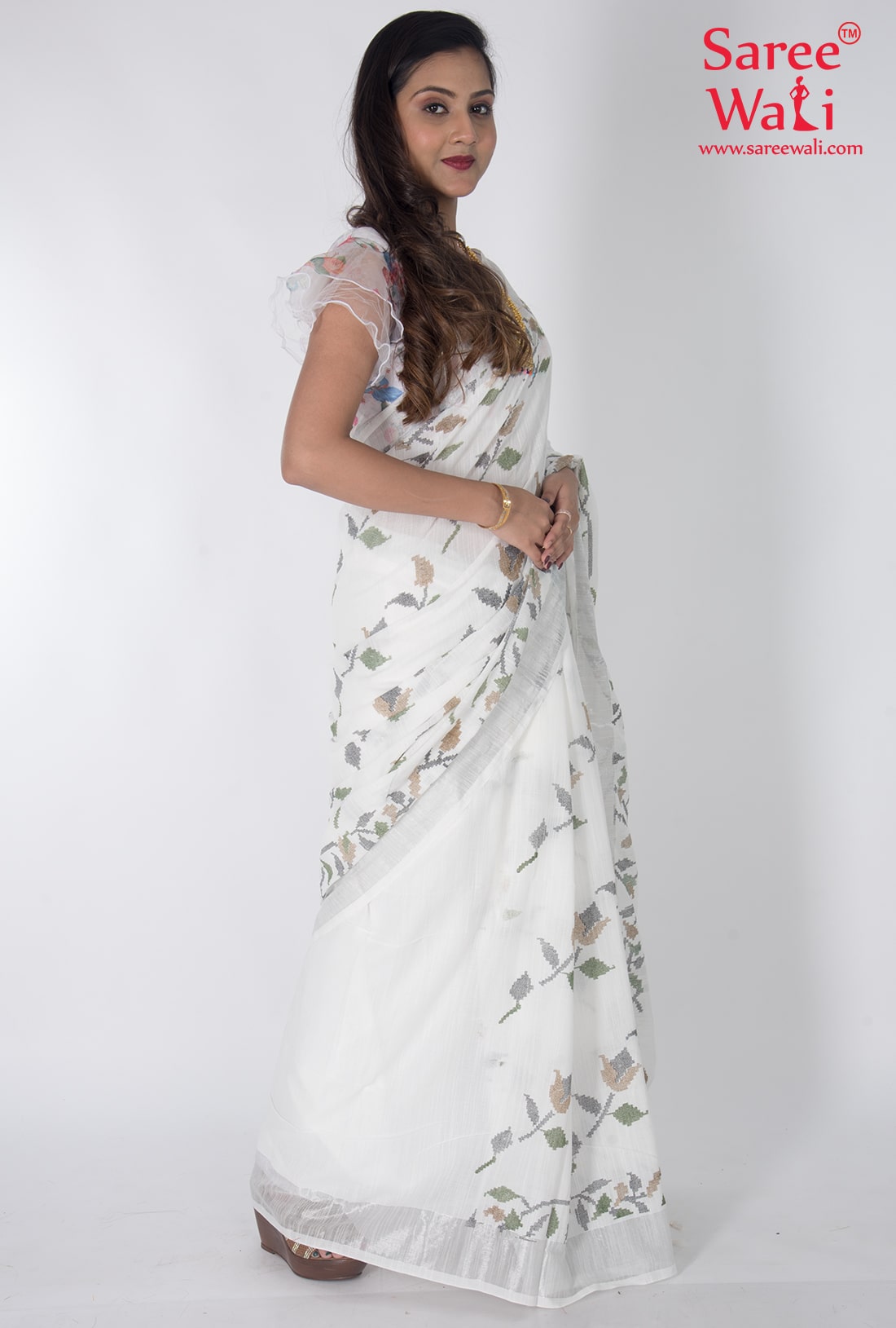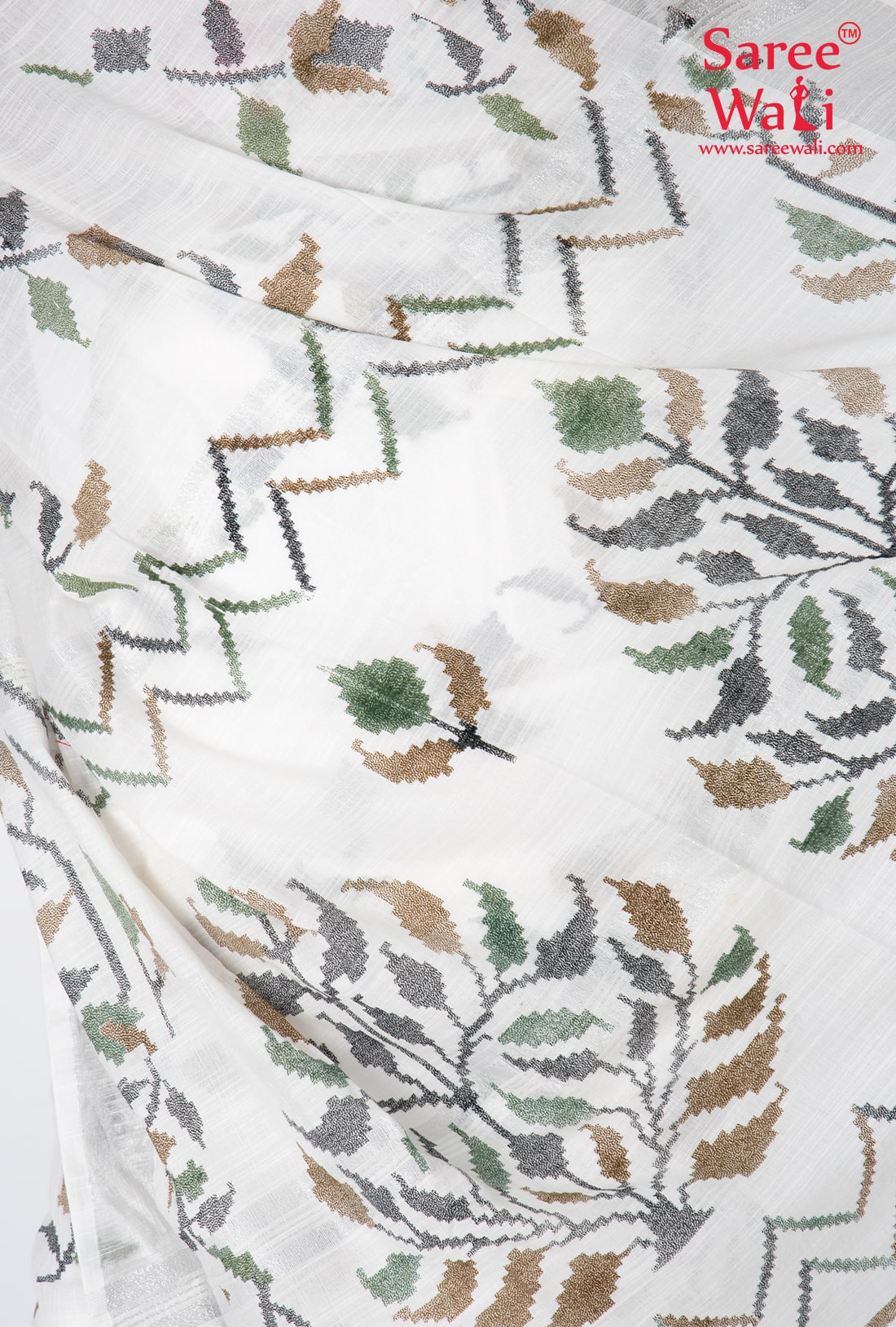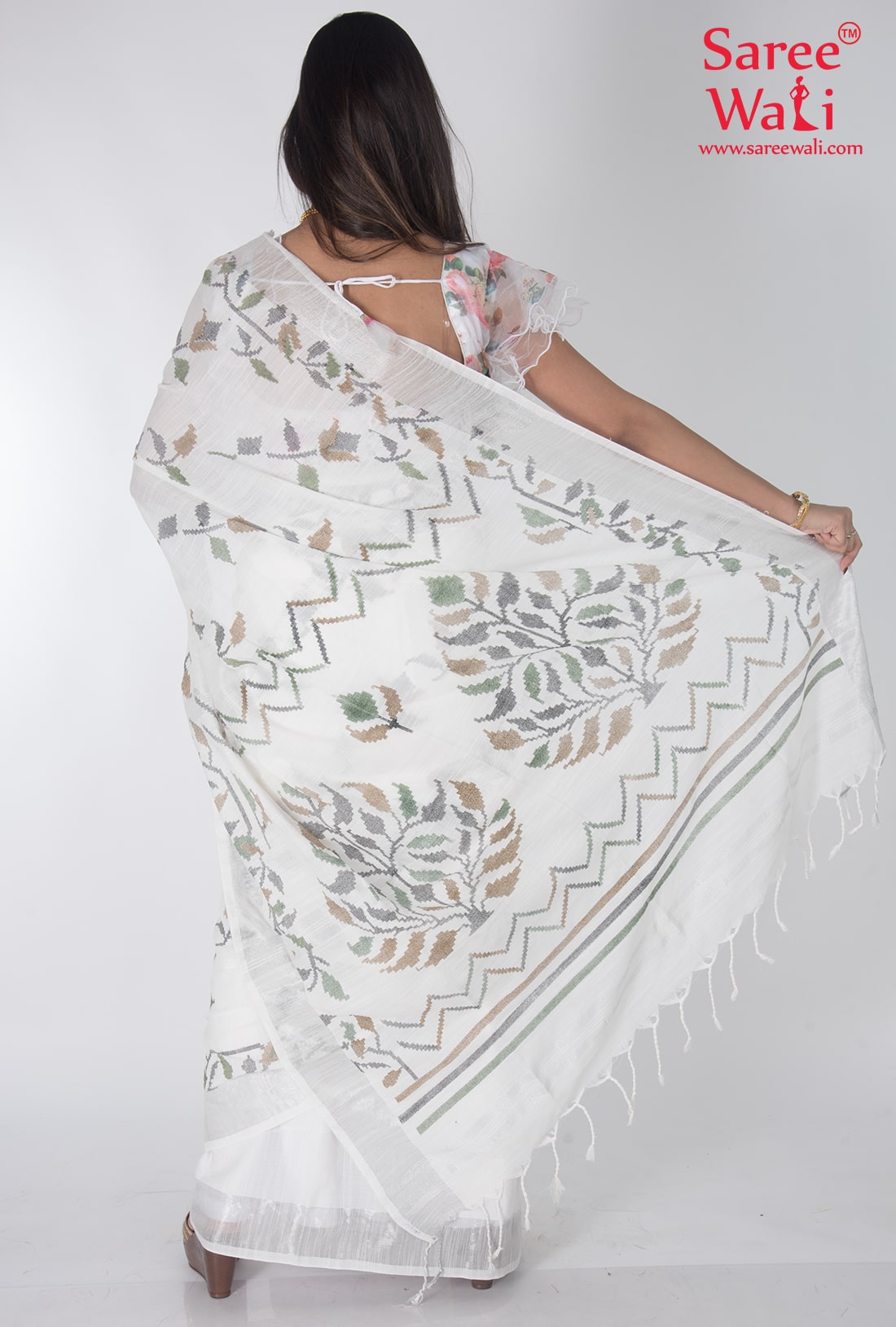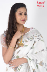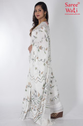 White Cotton Print Handloom Saree SWHL0047