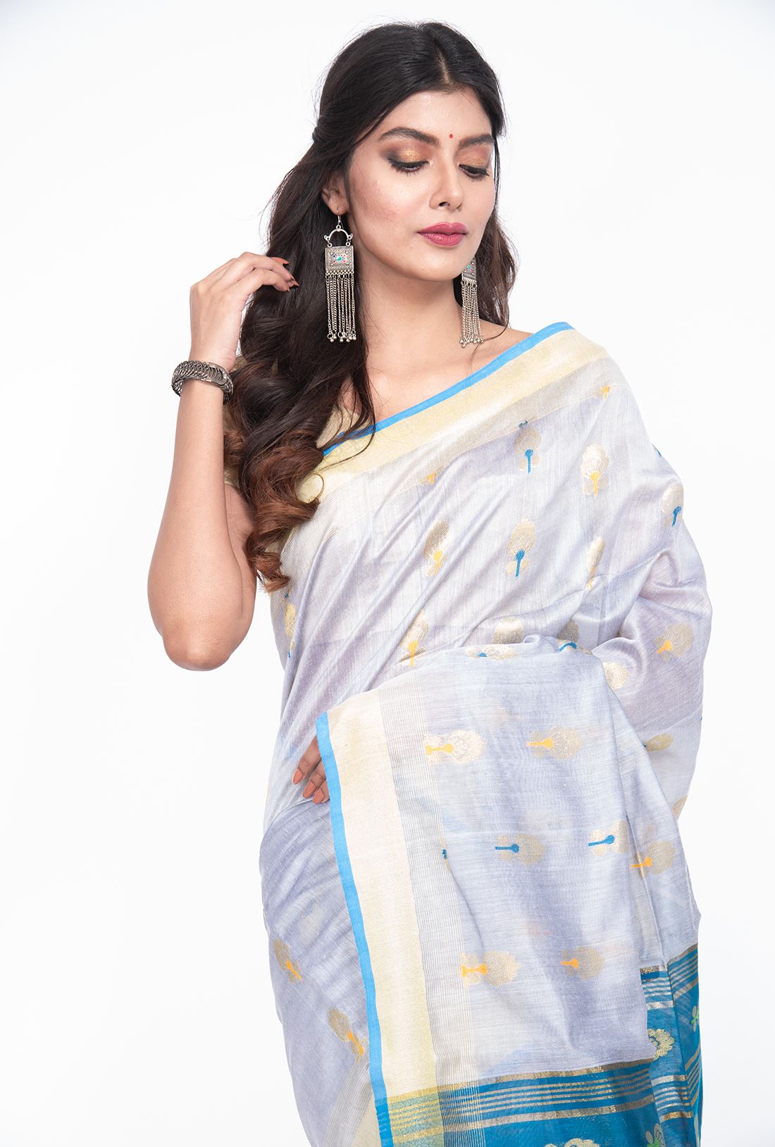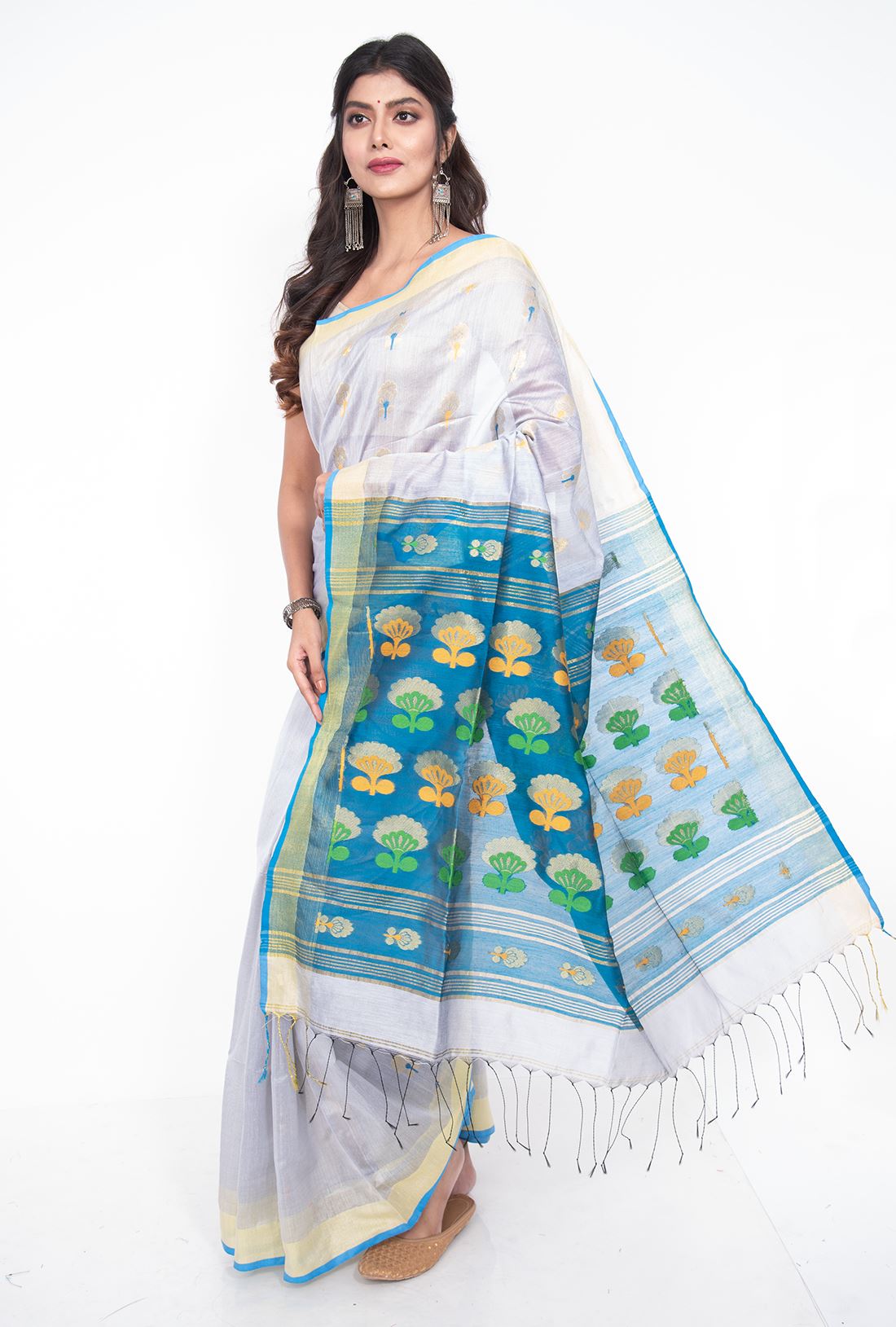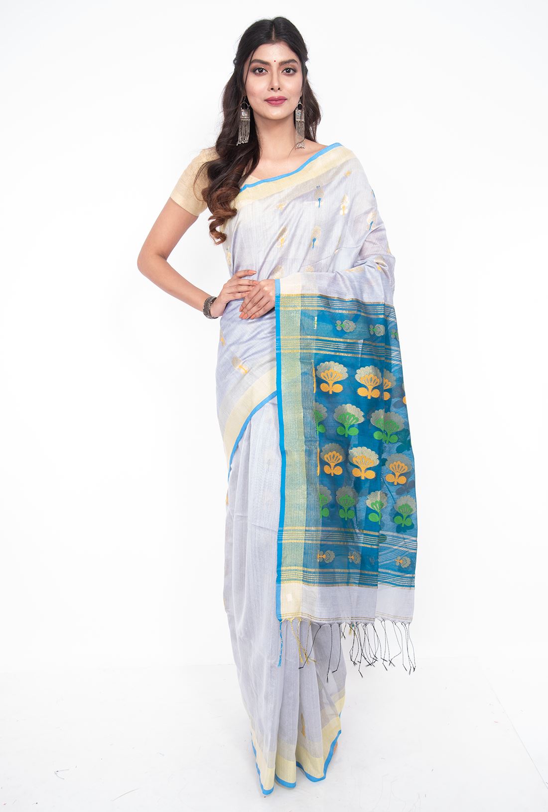 Body: Ice grey body with small golden flower buttas in green & yellow all over the body.