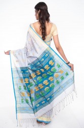 Pallav: Peacock blue Pallav with big floral motifs in golden , green and yellow running through the length of it.