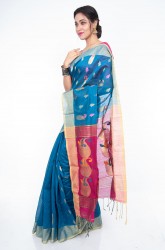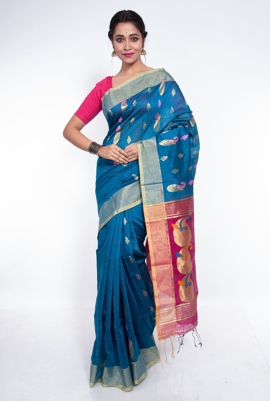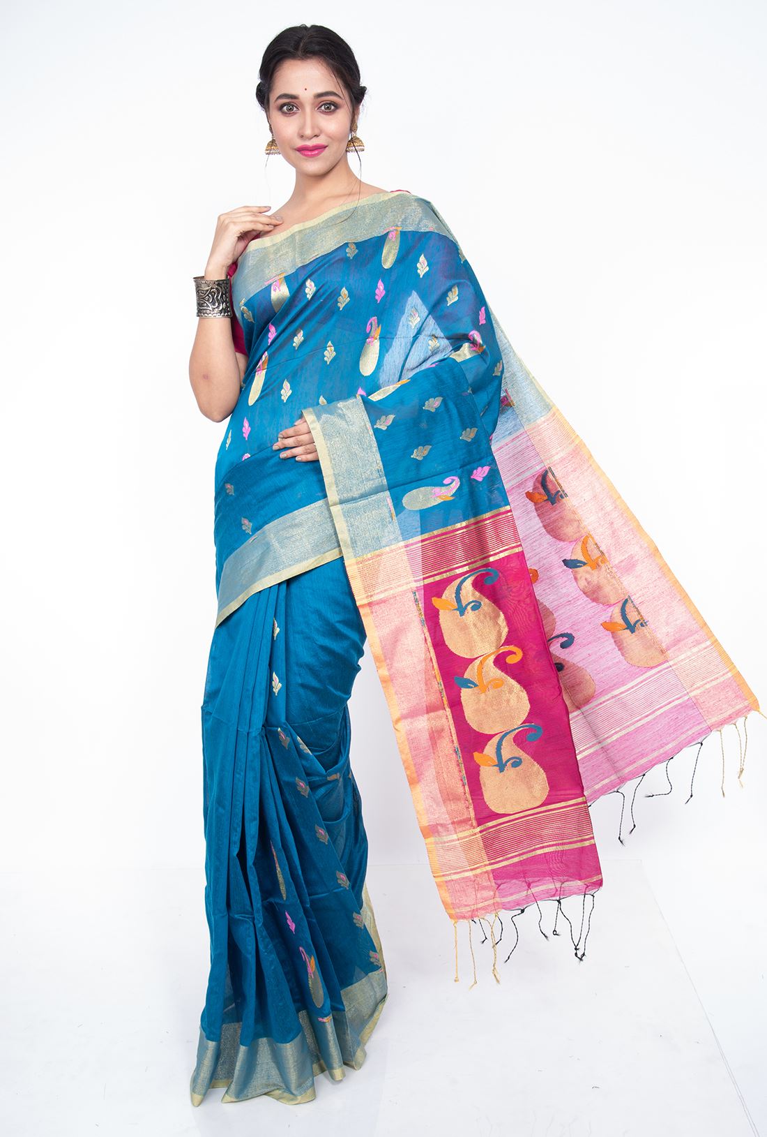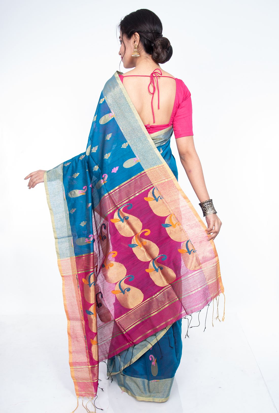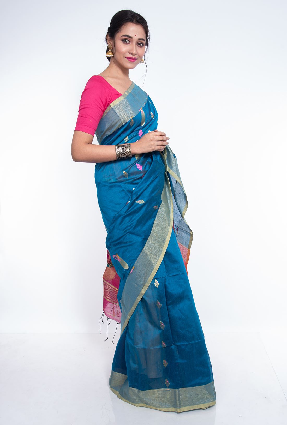 Body: Ivy Blue body with small golden and pink floral buttas and towards the pallav the body has medium mango pattern motifs along with small floral bttas in golden,copper, pink and orange.