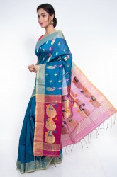 Pallav: Magenta Pink Pallav with large mango pattern design in golden copper, blue and orange, making the look of the saree more rich.