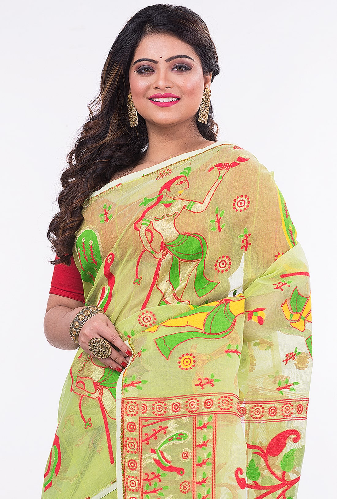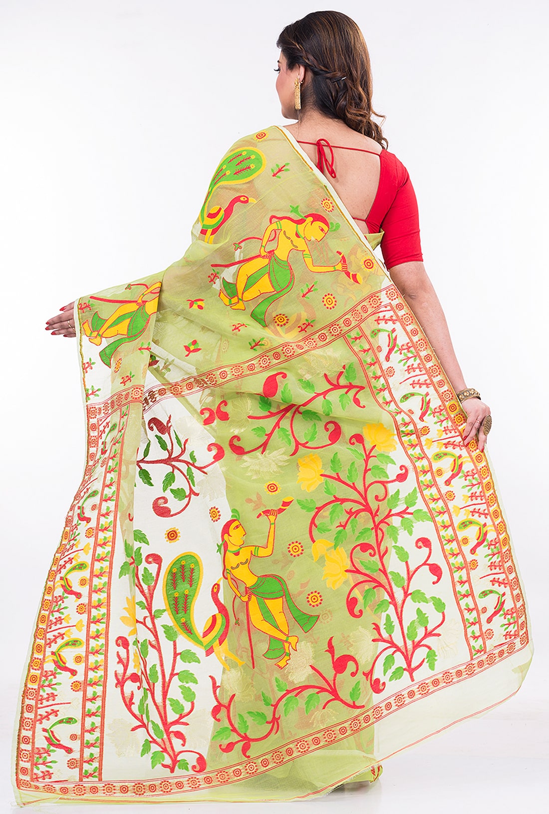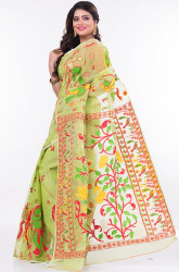 Lime Green Dhakai Jamdani saree with multi-color work. Easy to wear, maintain and drape.