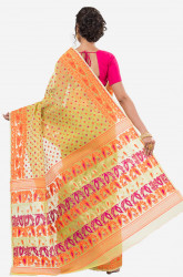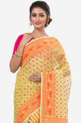Lime Green Orange Dhakai Jamdani Handwoven saree with jamdani style pallu. The saree has all over weaving work.