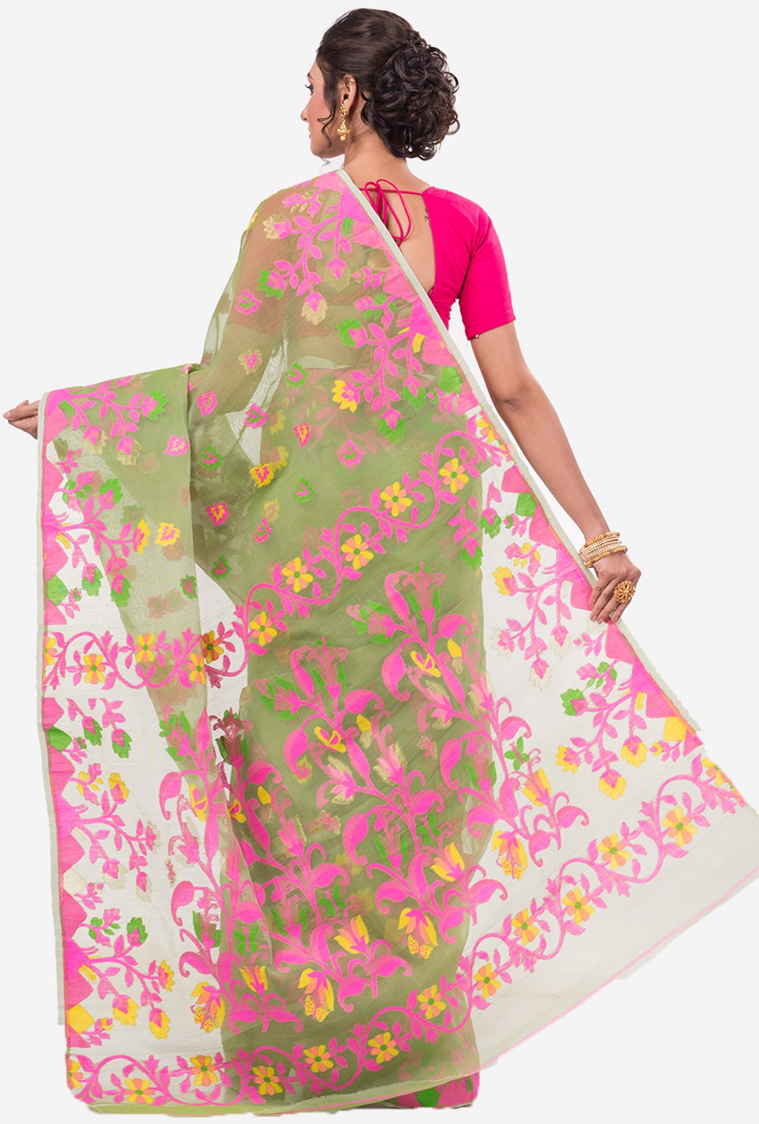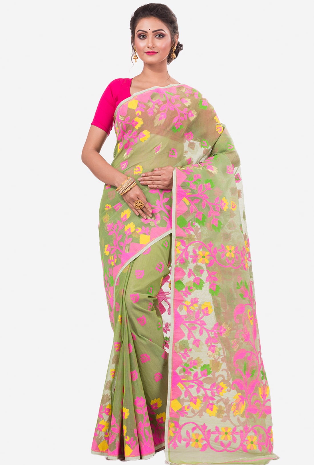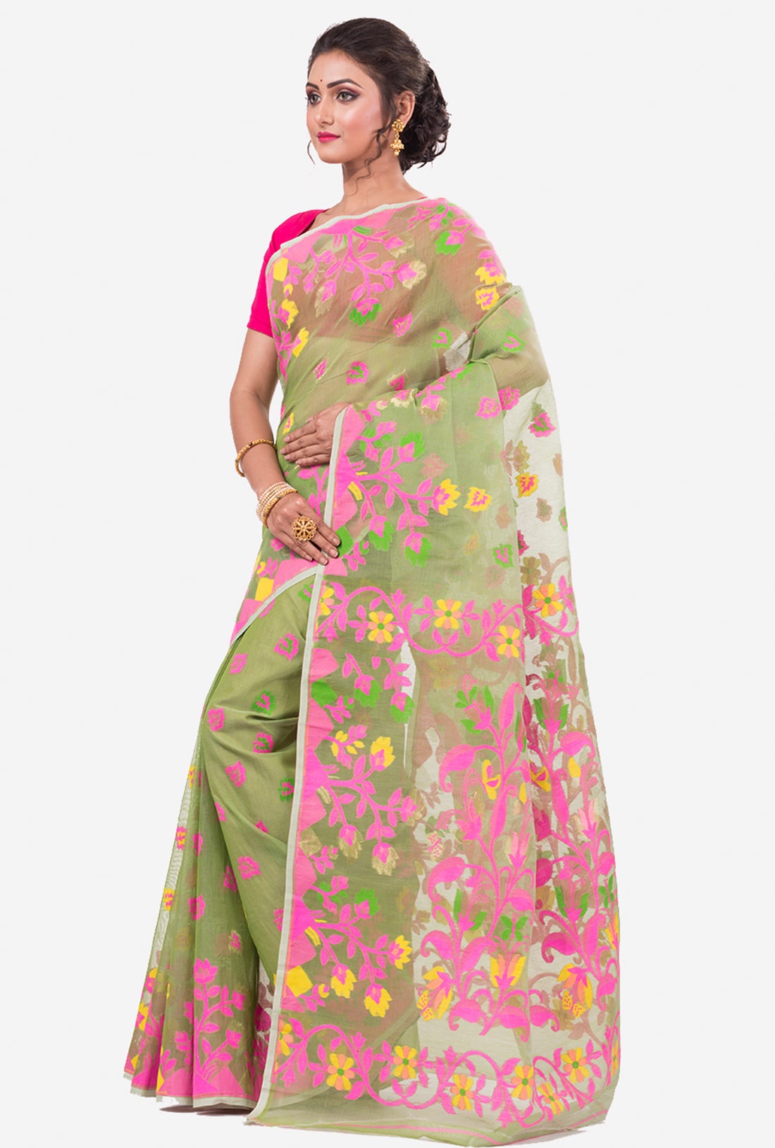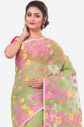 Lime Green Pink Dhakai Jamdani Handwoven saree with jamdani style pallu. The saree has all over weaving work.