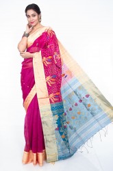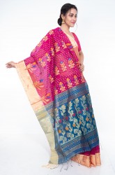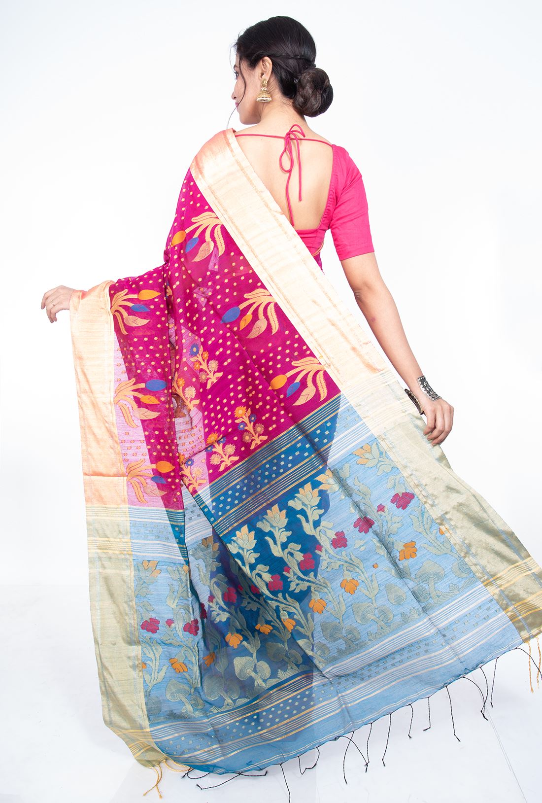 Body: Magenta Pink body with small golden copper buttas all over it and towards the pallav the body has large floral motifs in golden copper, blue and orange.