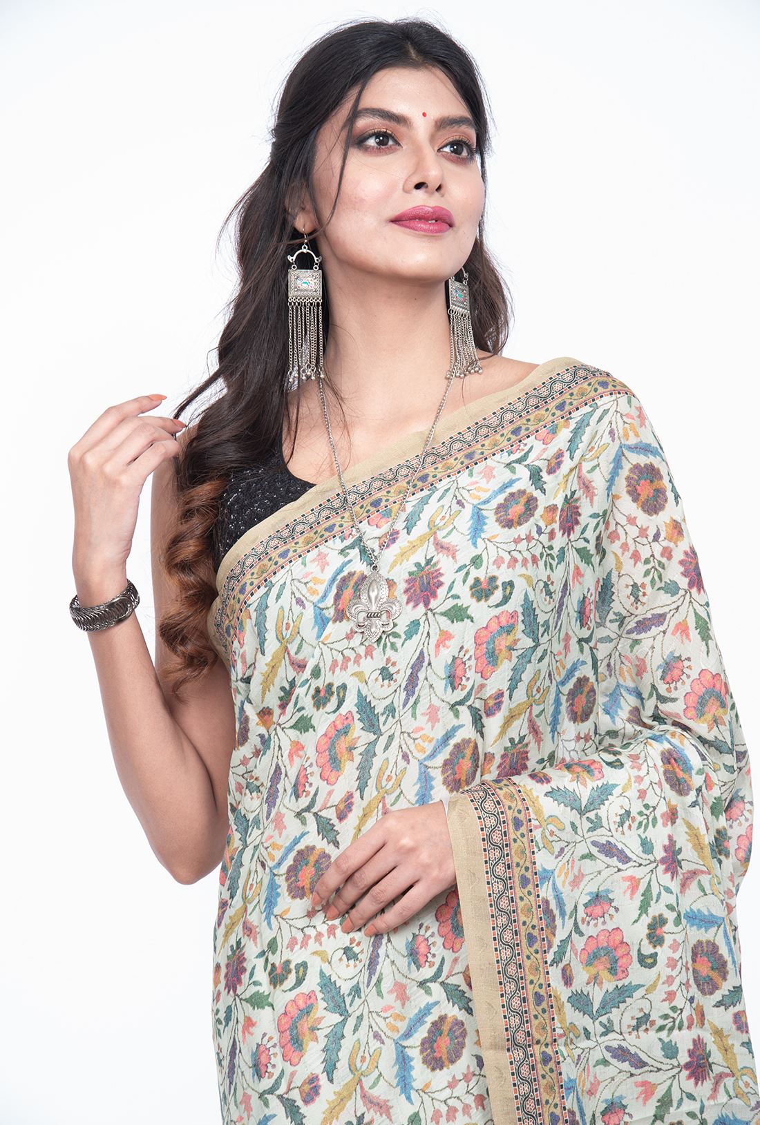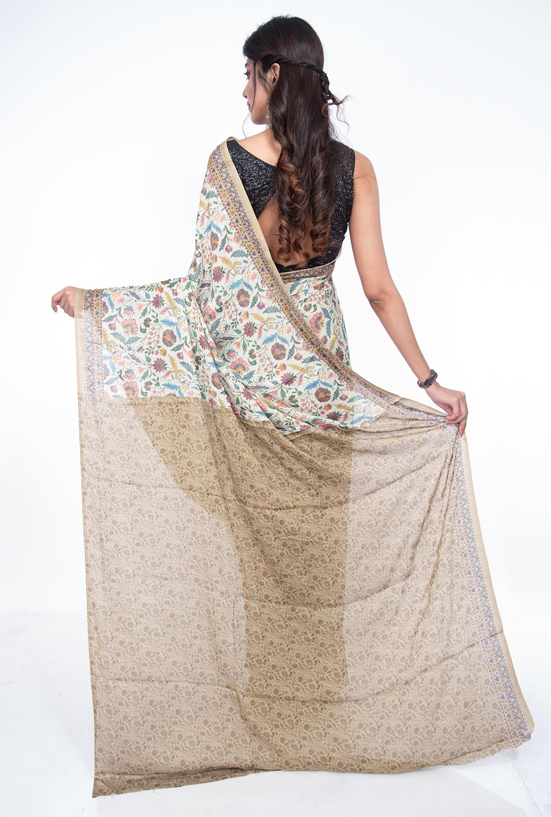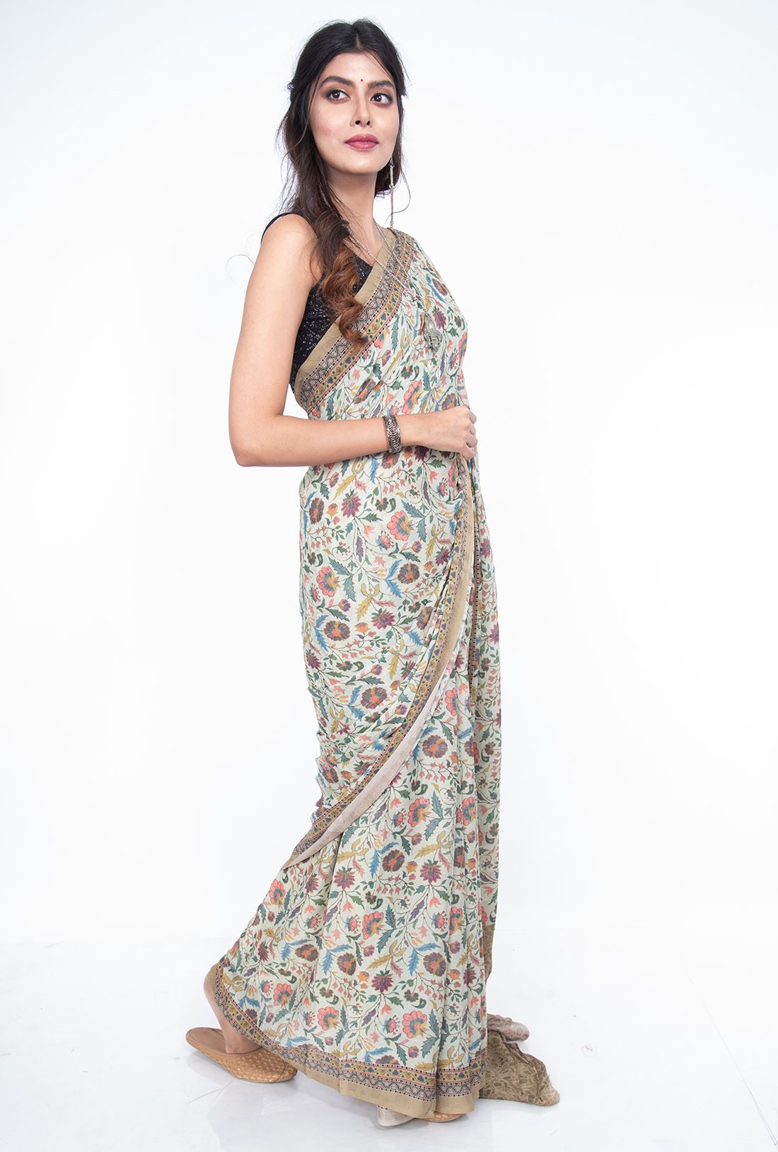 Border: It has a narrow width floral border in pashmina prints with same color contrast to the pallav on both the sides.