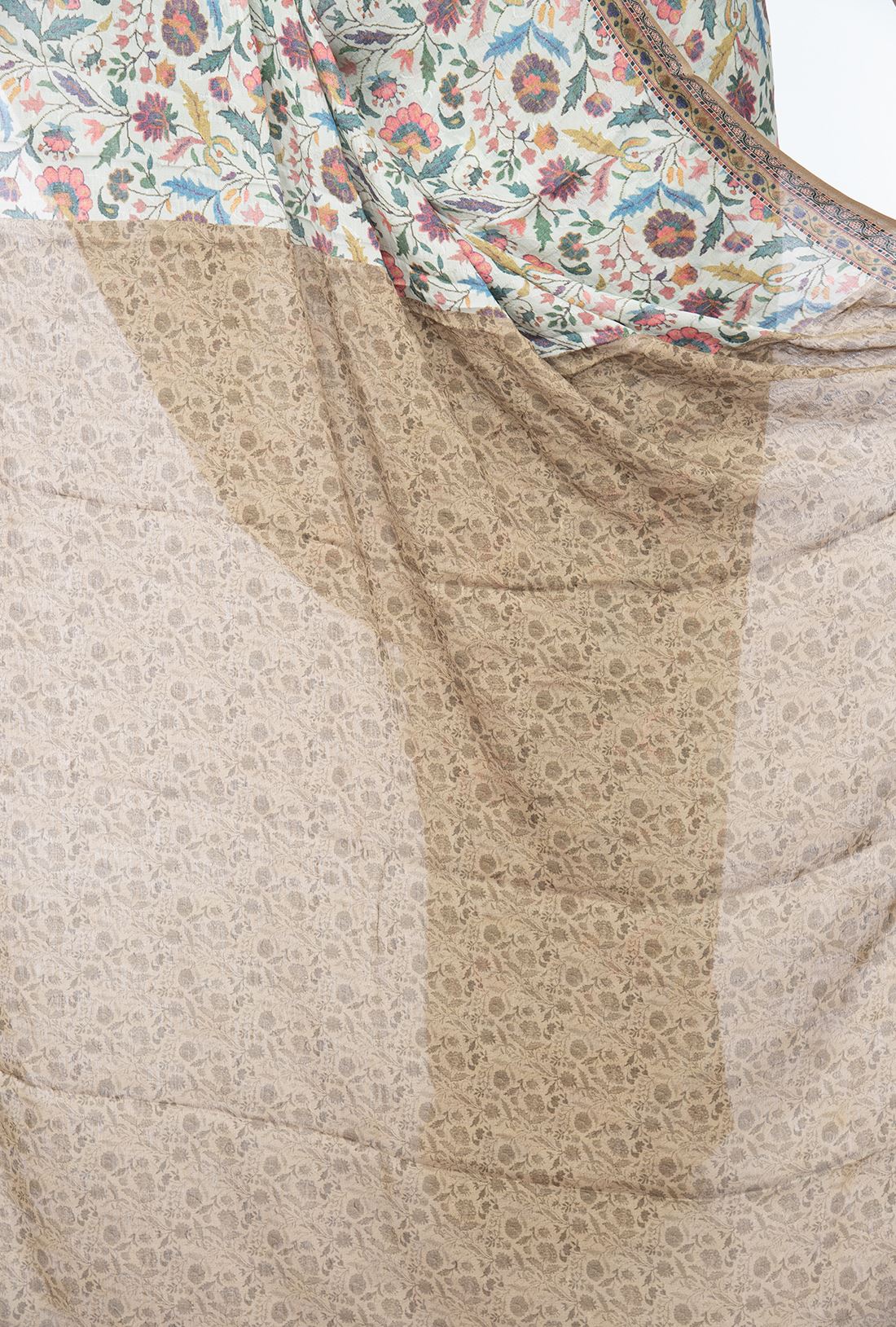 Pallav: A typical pashmina prints with floral jaal work in beige brown makes a perfect traditional yet fancy look.