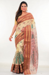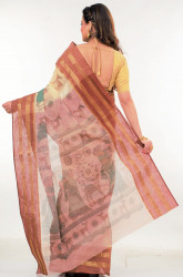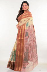 Off White Brown Handwoven Bengal Tant Cotton Saree with jamdani pallu.