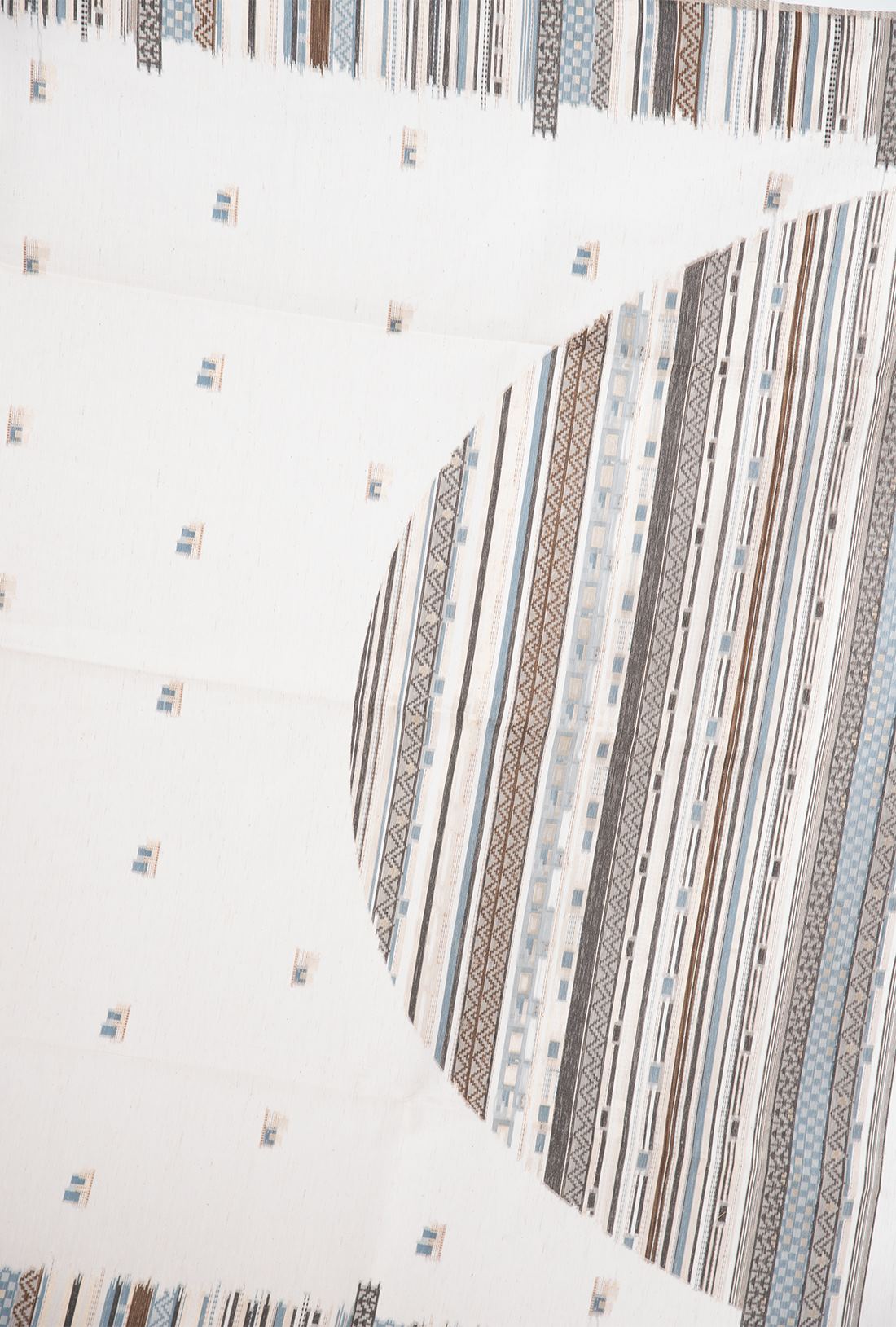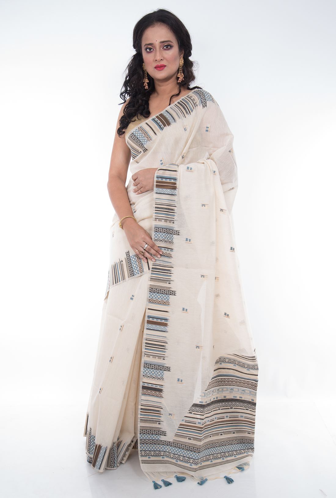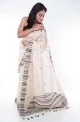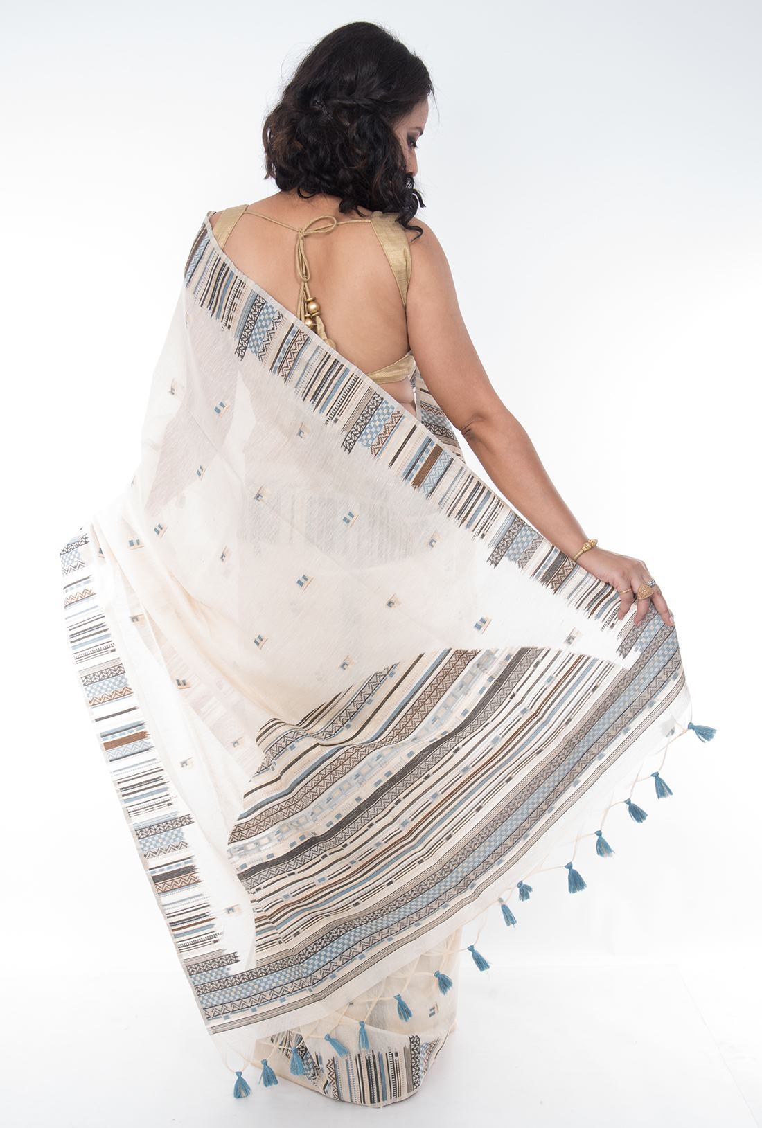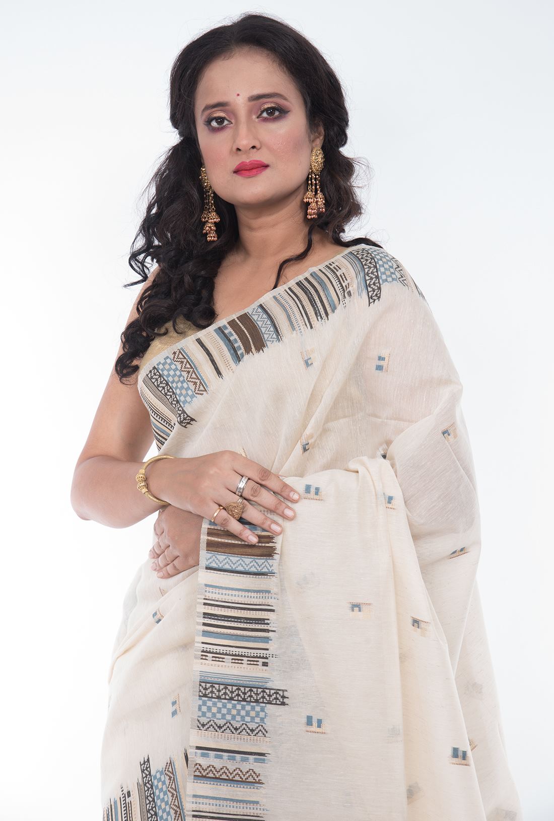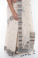 Pallav: Plain Off white pallav has a big half circled contemporary desing in grey blue heu creates very simple yet elegant look.