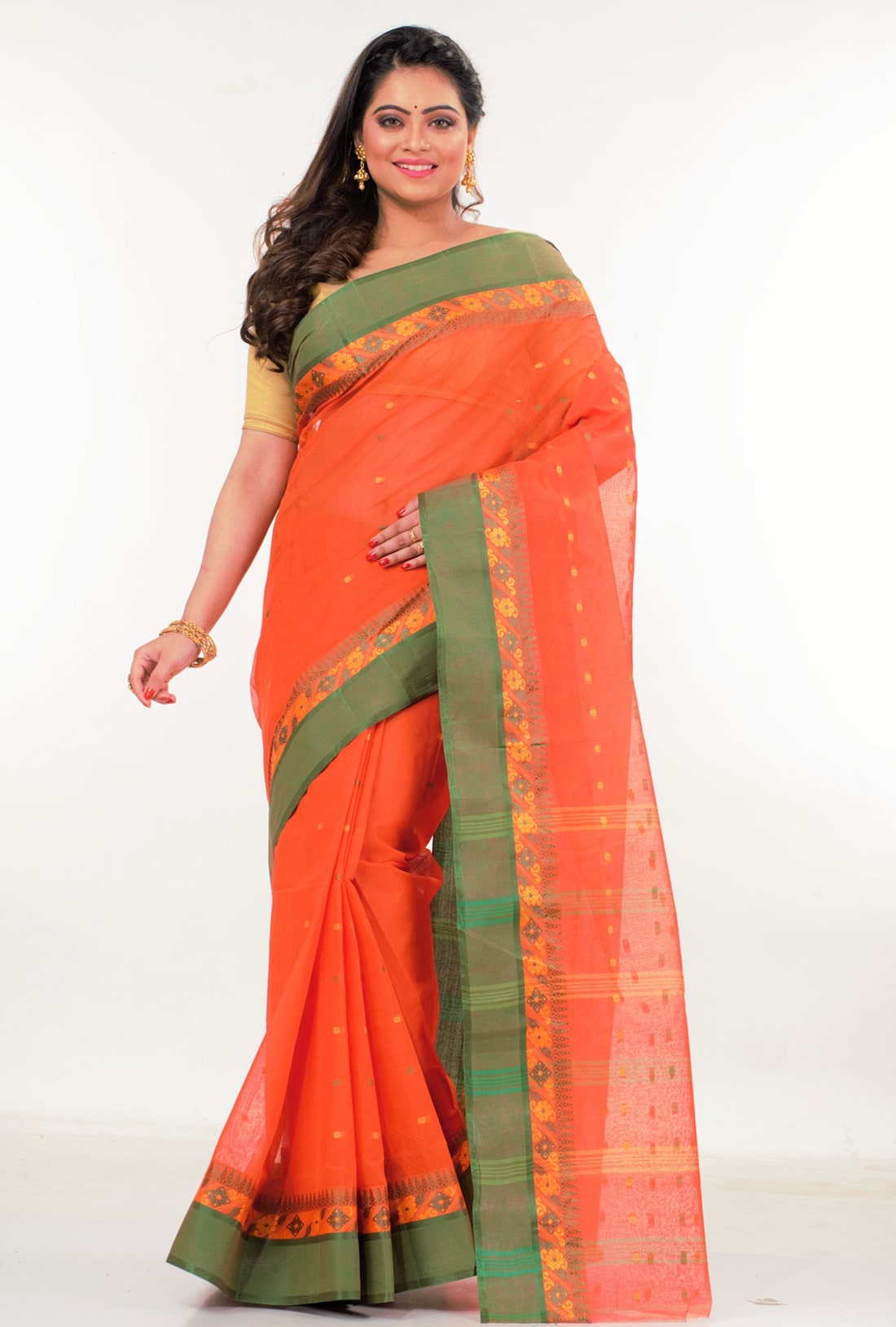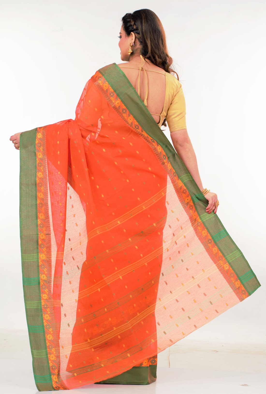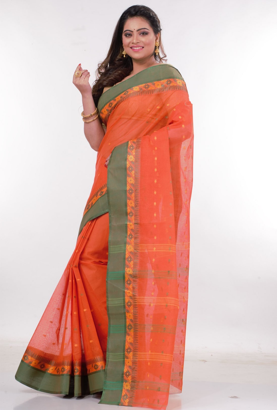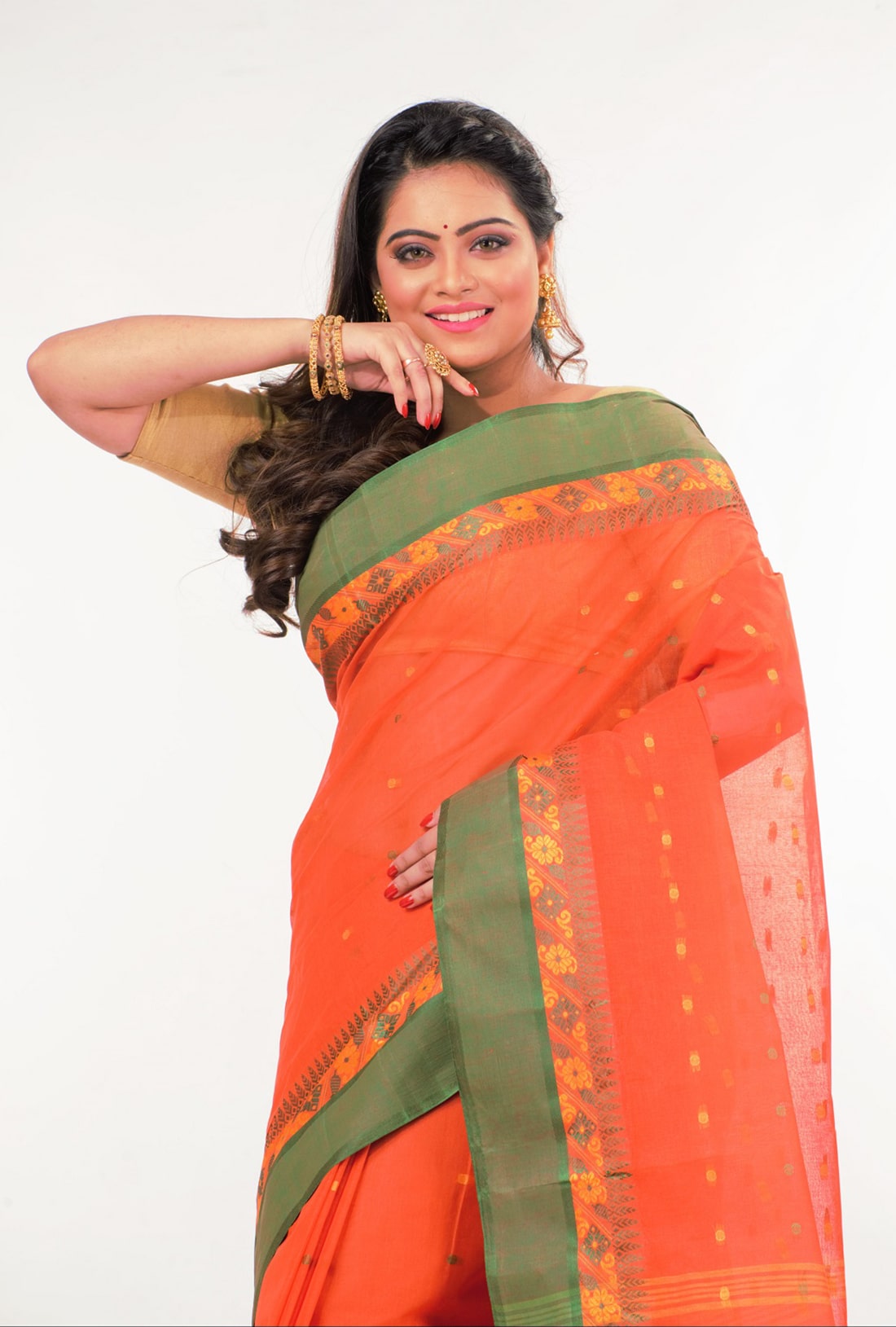 Orange Green Handwoven Bengal Tant Cotton Saree with jamdani pallu.