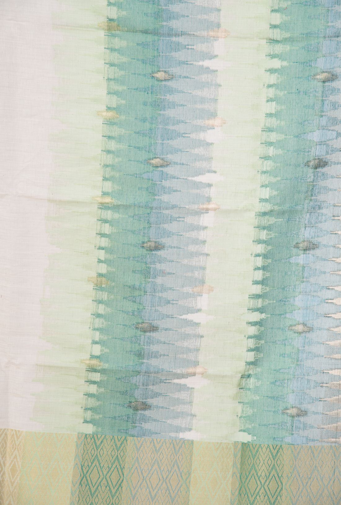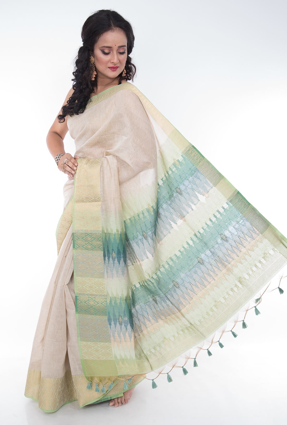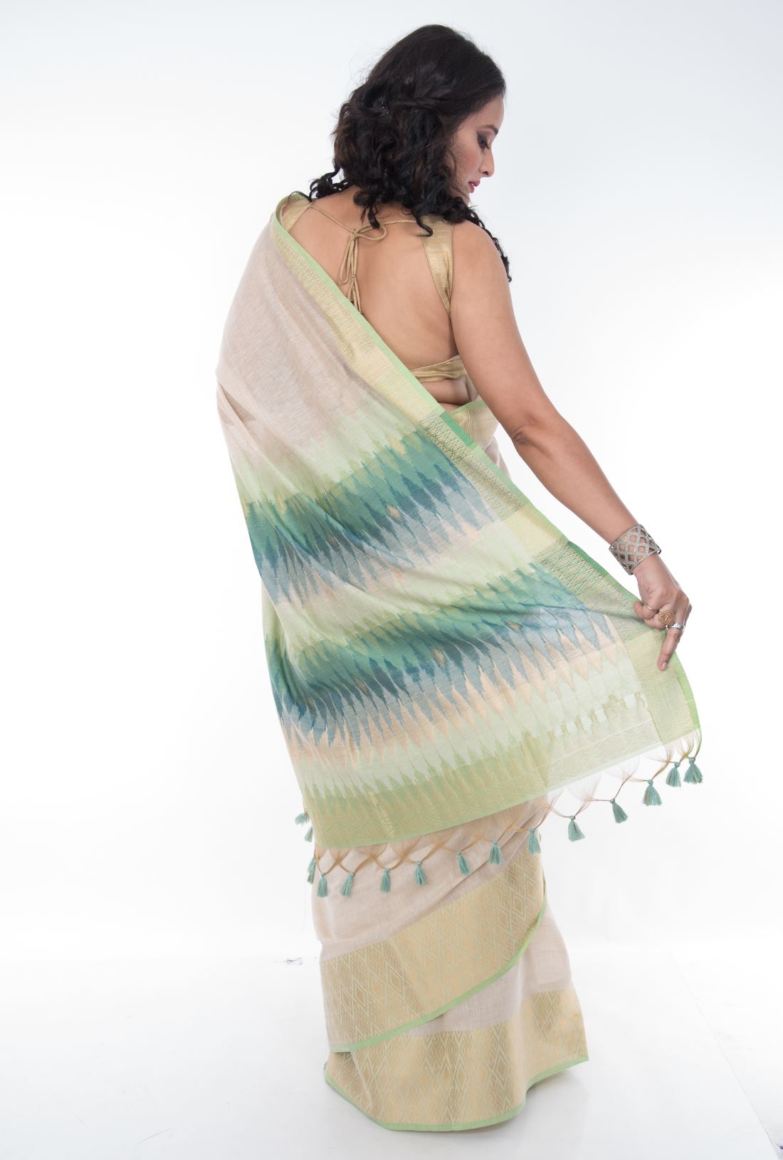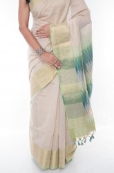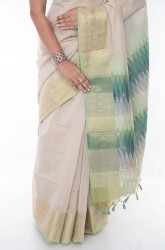 Pallav: Green pallav has golden zari work with contemporary style in rhombus patterns creating an elegant and beautiful look.