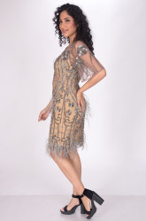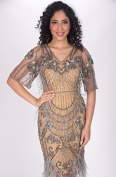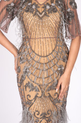 Hand knitted, Tulle Fabric and Embroidery with Glass beads and Ostrich Feather