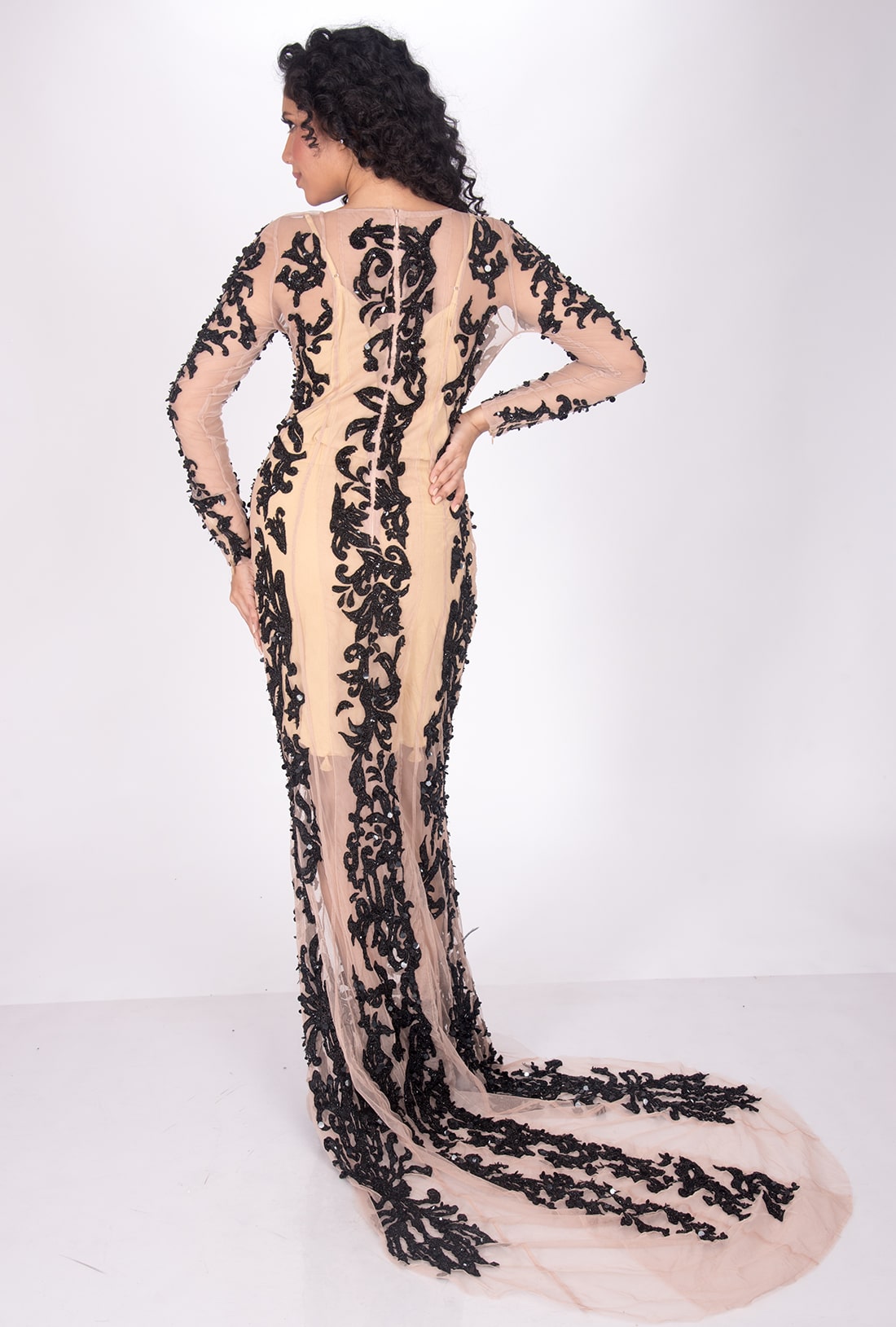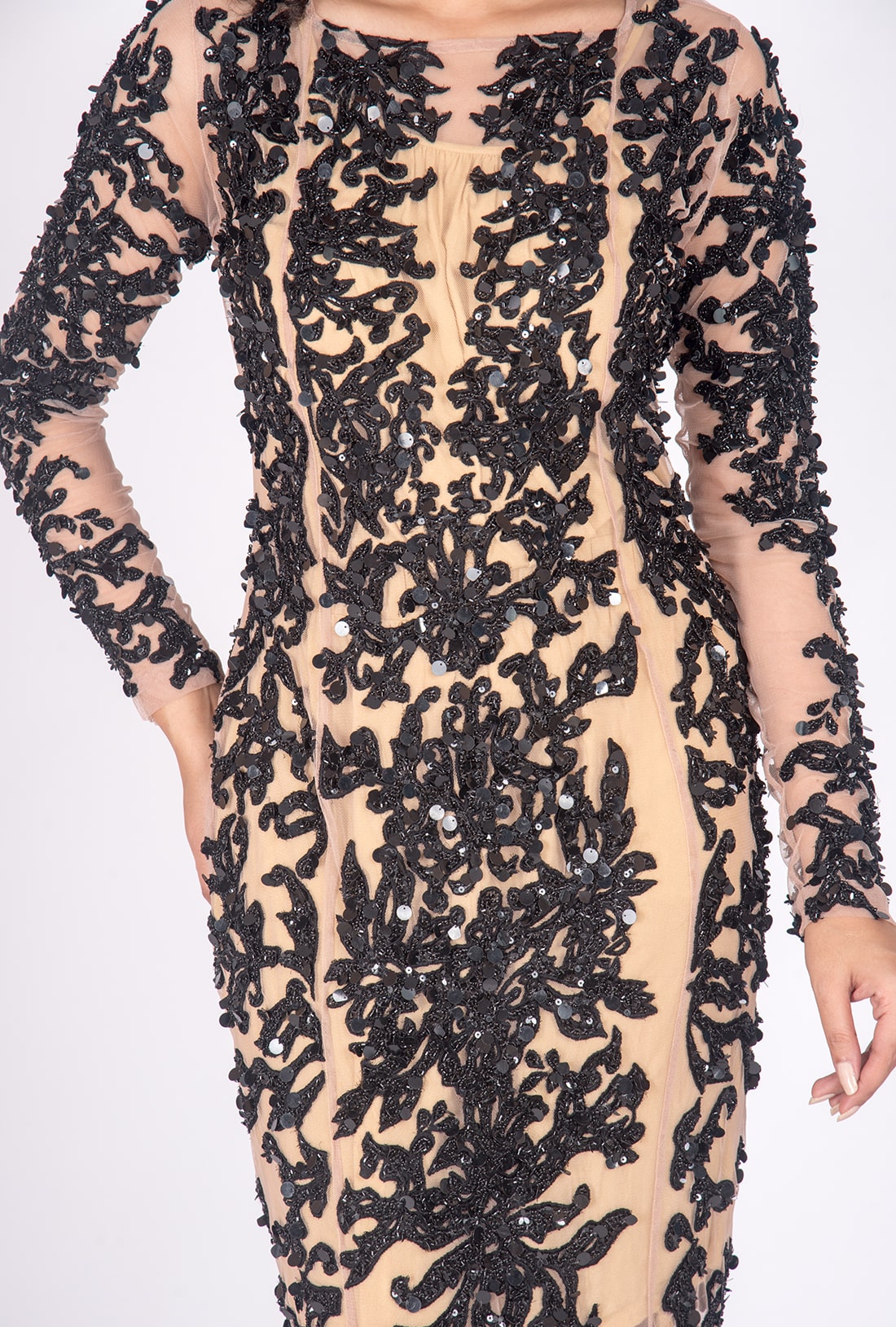 Hand knitted, Tulle Fabric and Embroidery with Plastic beads and Glass Beads