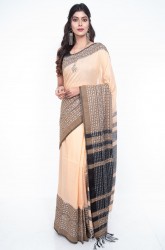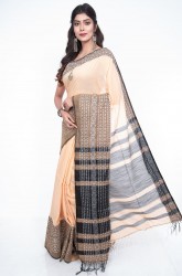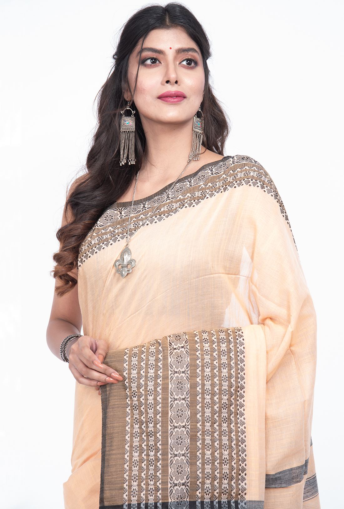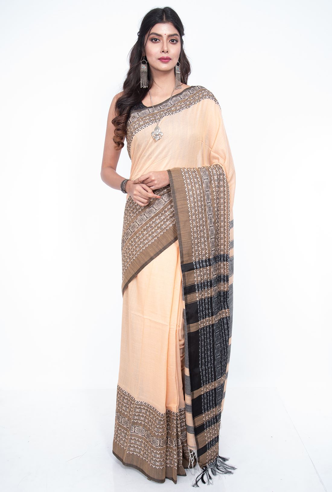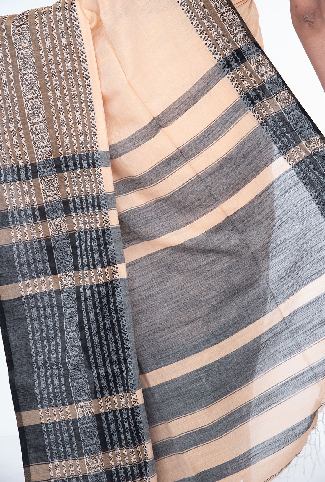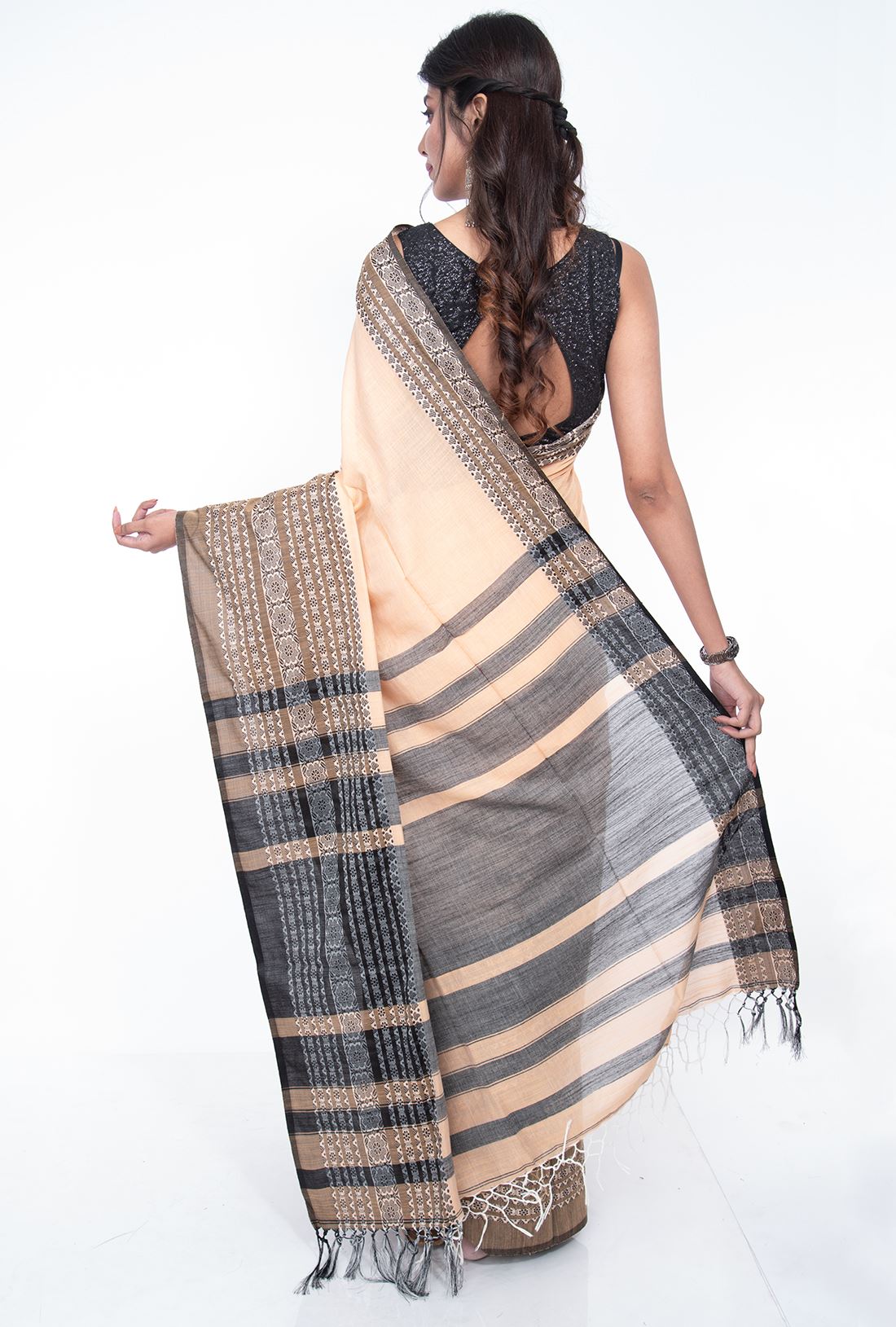 Pallav: Pastel peach and black Pallav with horizontal lines , create the look simple yet rich and elegant.