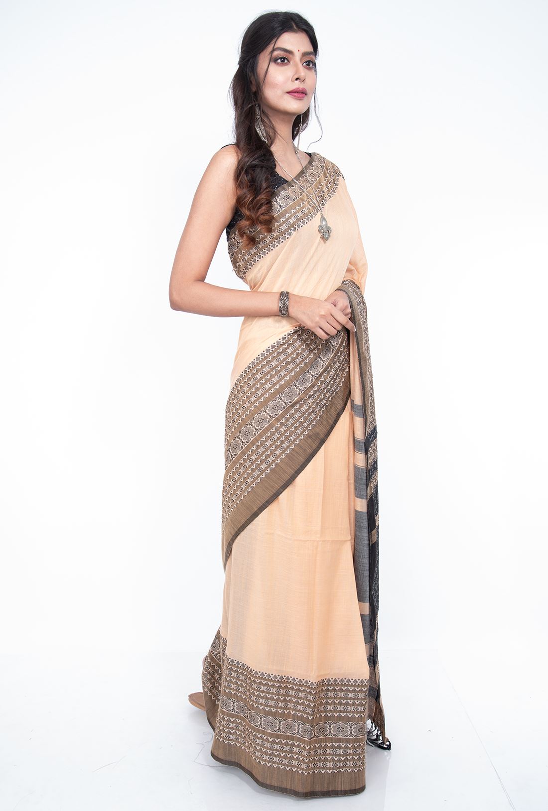 Border: Broad width Skirt border in light brown has an intrinsic floral designs at bottom and mid width floral worked border in light brown at the upper part of the body.