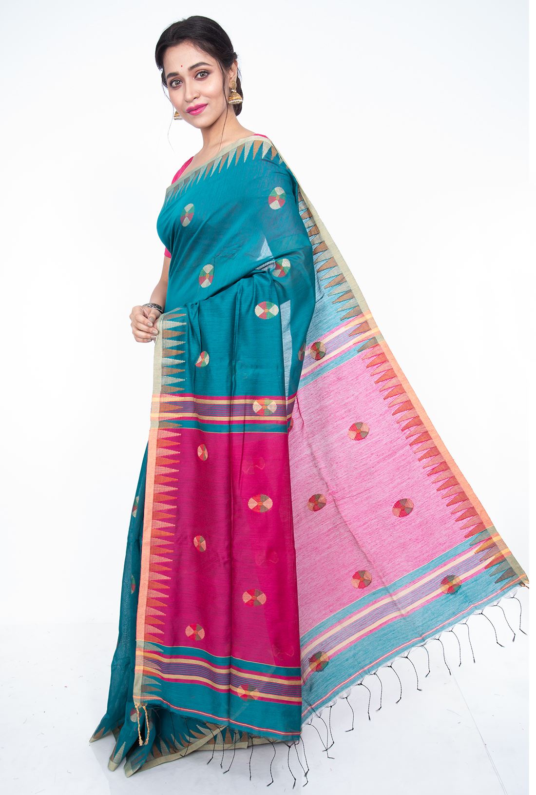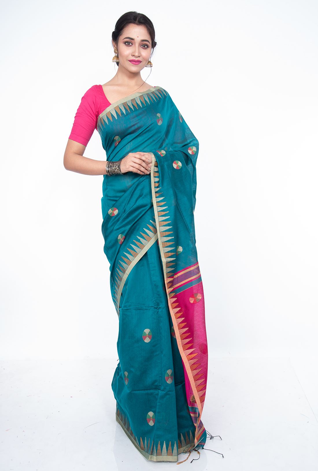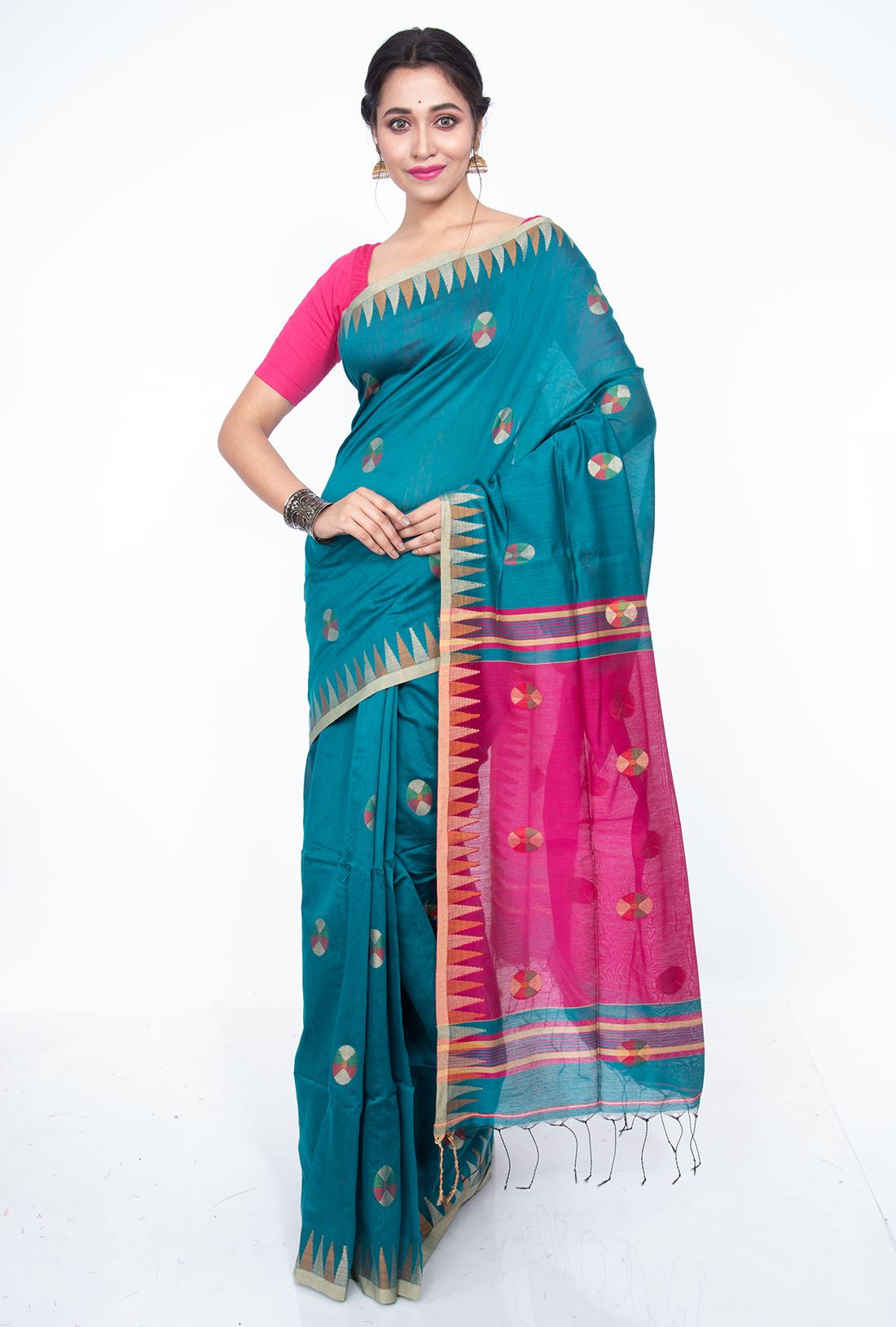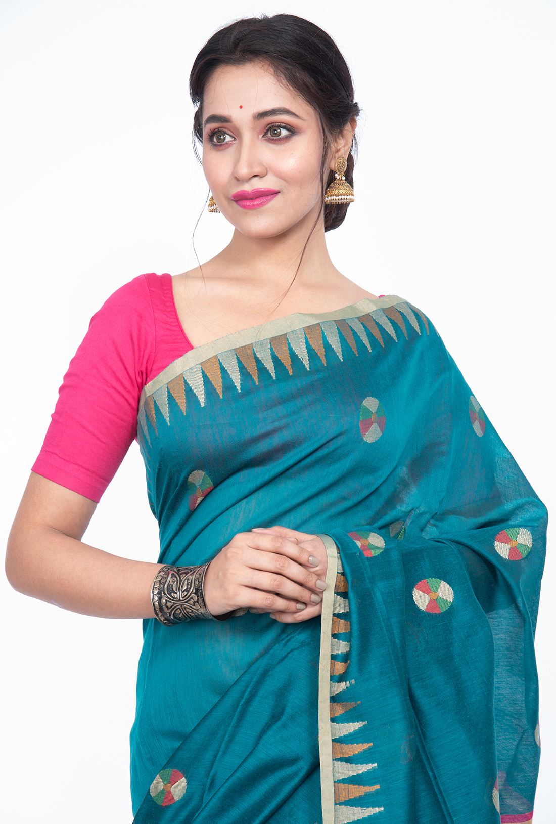 Body: Peacock blue body with small round shaped multicolor buttas throughout the saree.