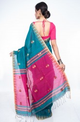 Pallav: In contrast with the peacock blue body, magenta pink Pallav with small round shaped multicolour buttas all over the saree creates the look simple yet rich and elegant.