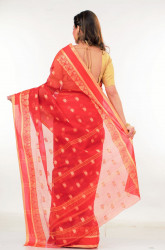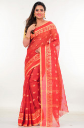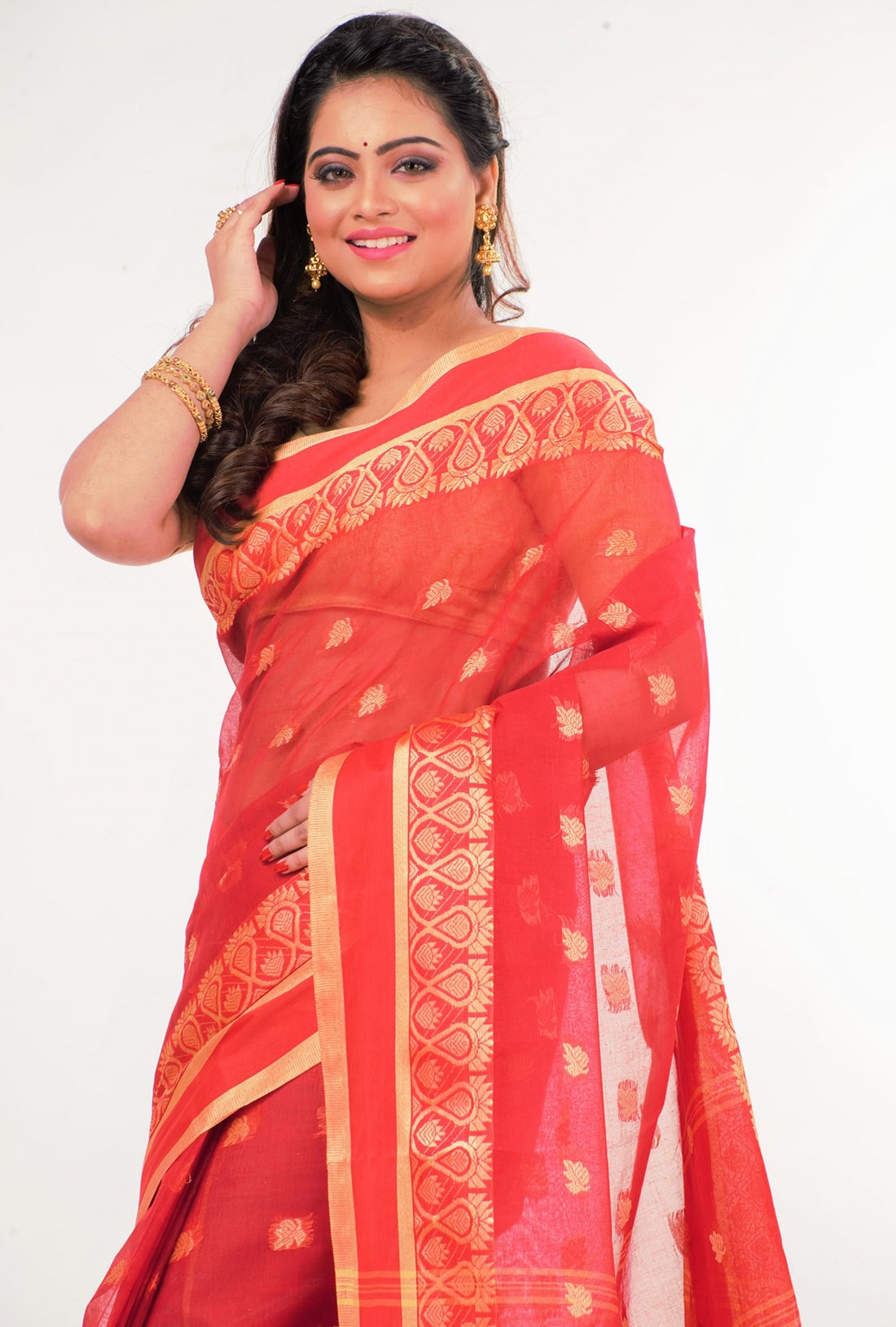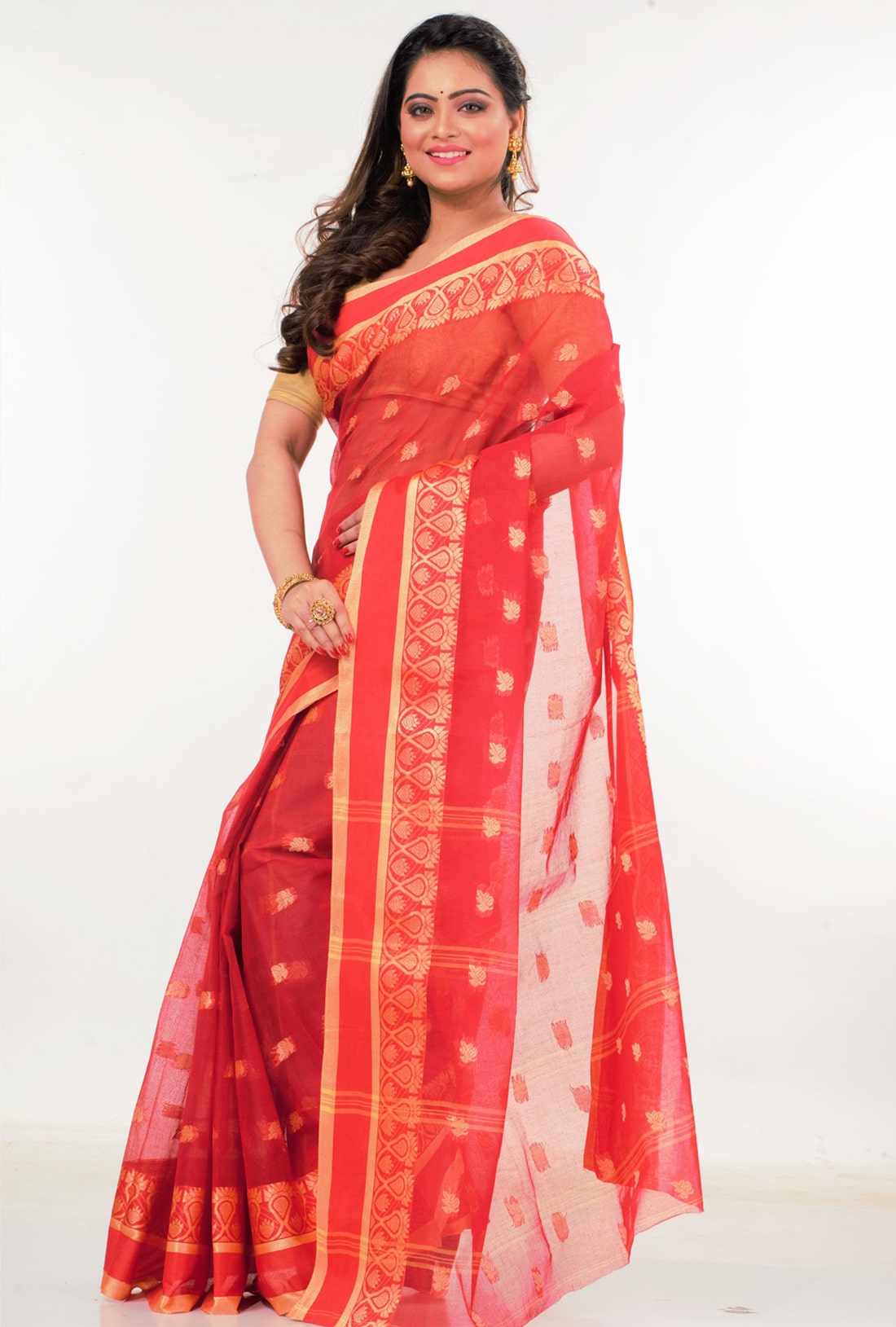 Red Handwoven Bengal Tant Cotton Saree with jamdani pallu.