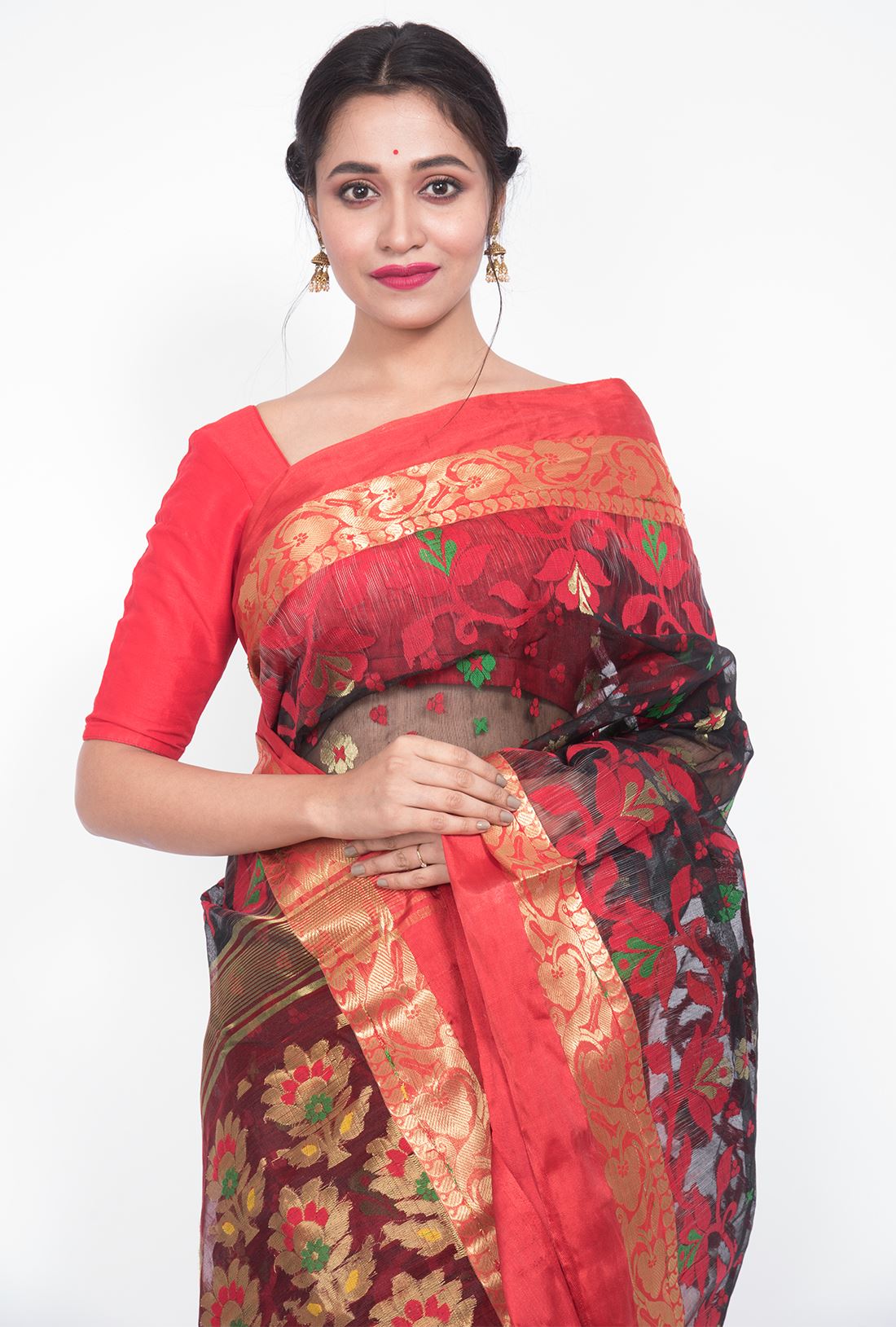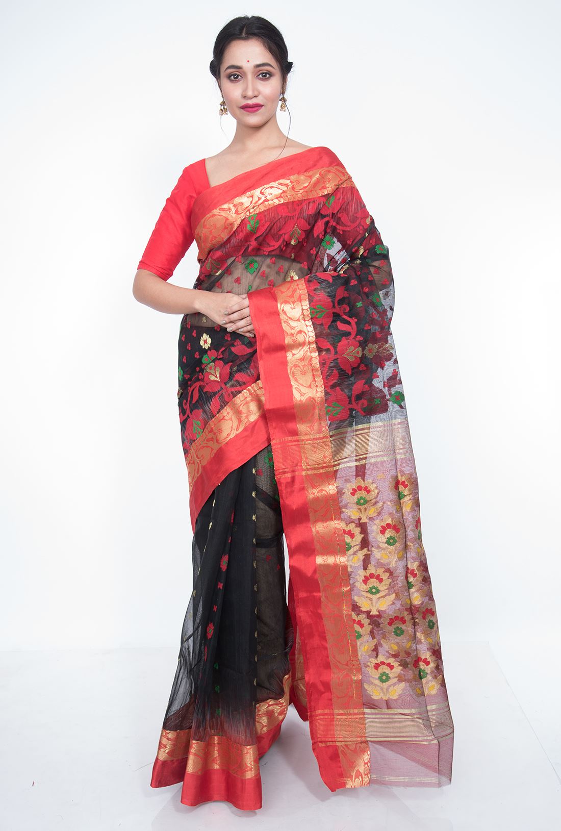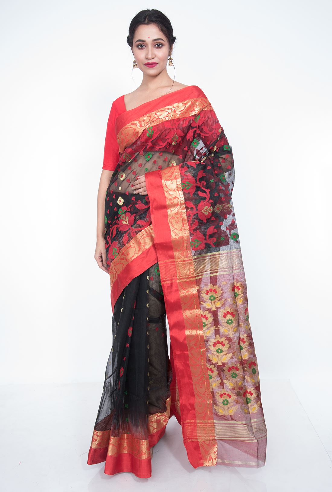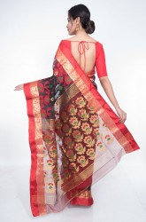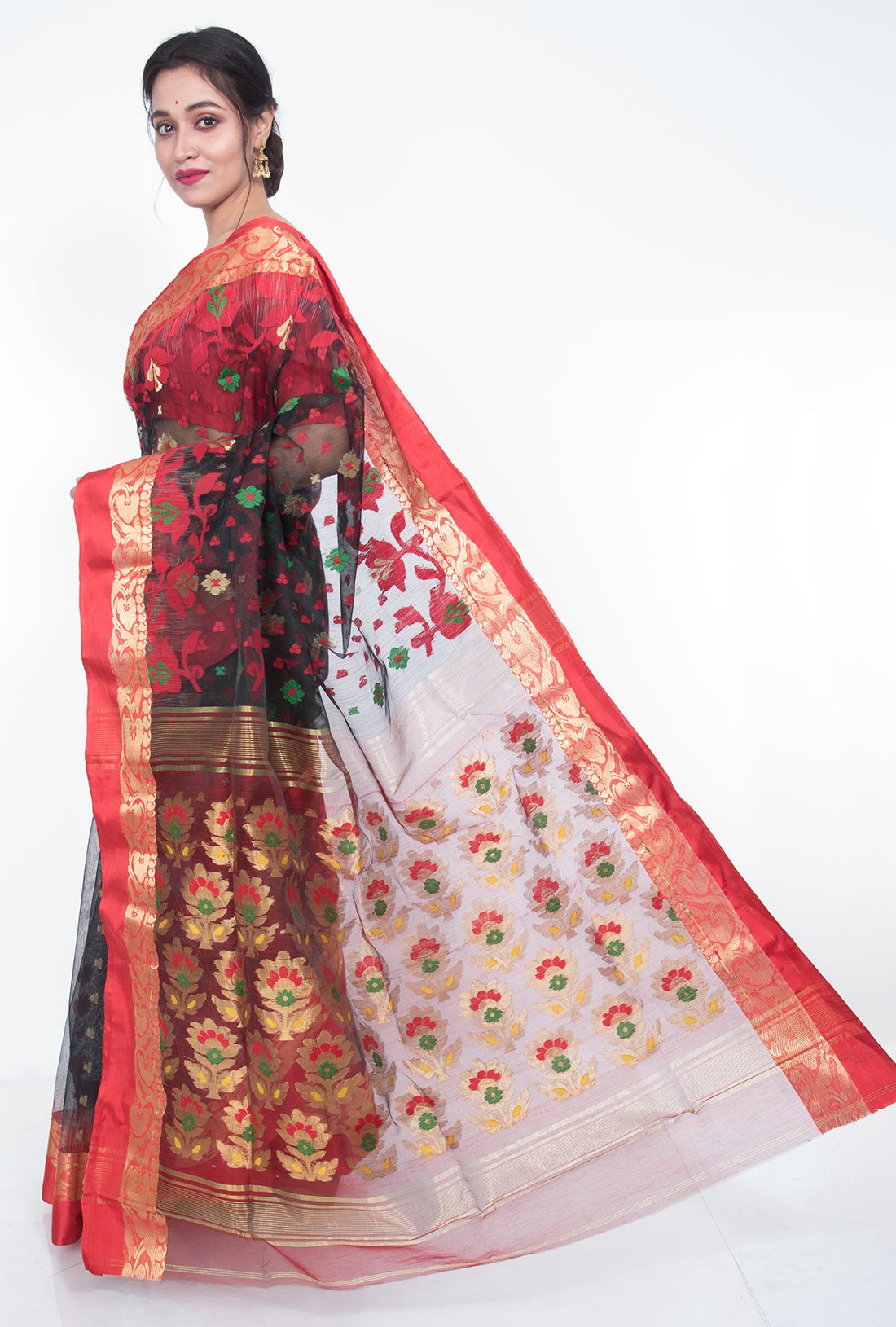 Body: Transparent black body has allover red and green jamdani work in contrast to golden zari butta.