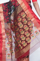 Pallav: Transparent maroon pallav with Golden Zari flower motifs in multicolored jamdani work making the saree absolutely stunning & gorgeous.