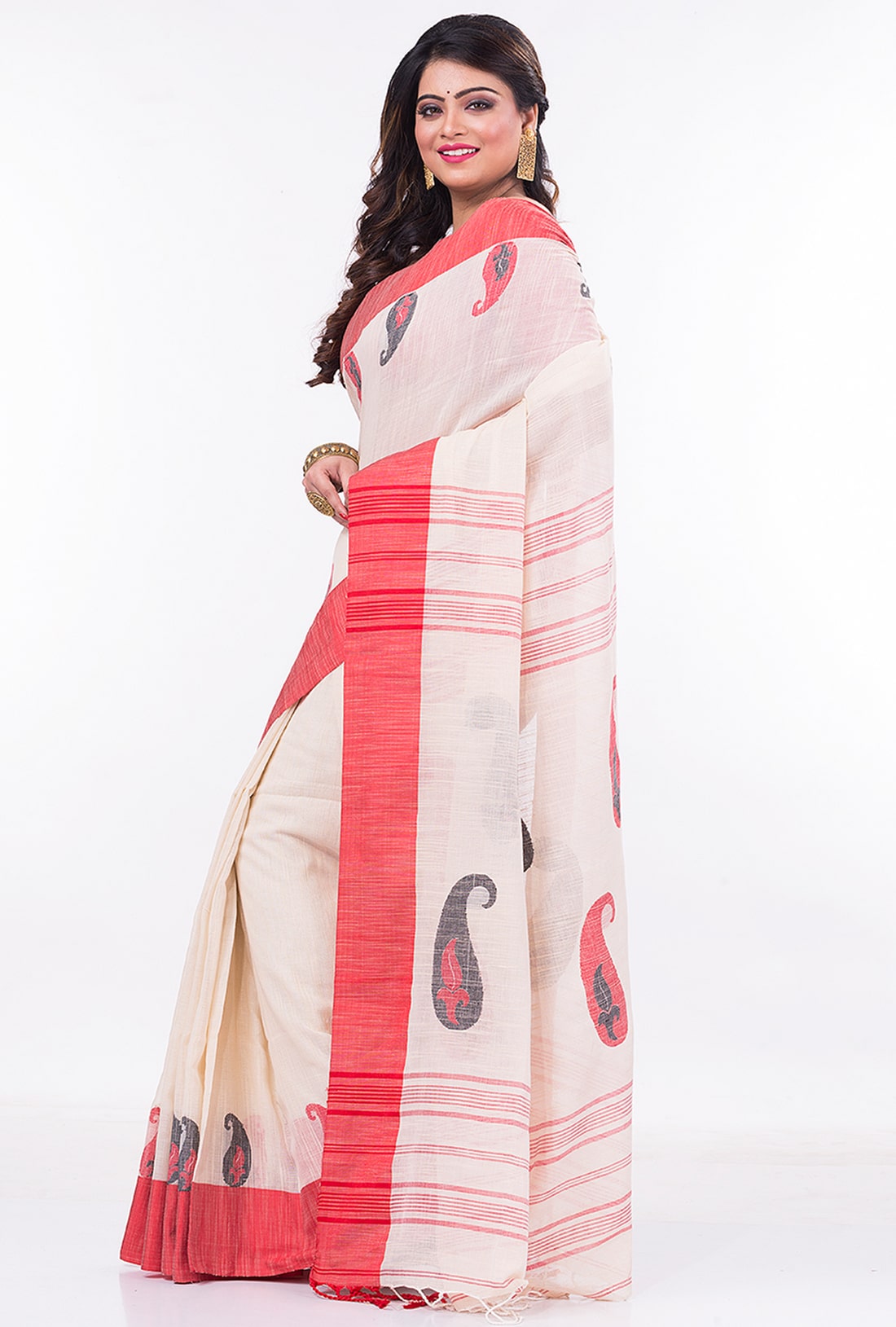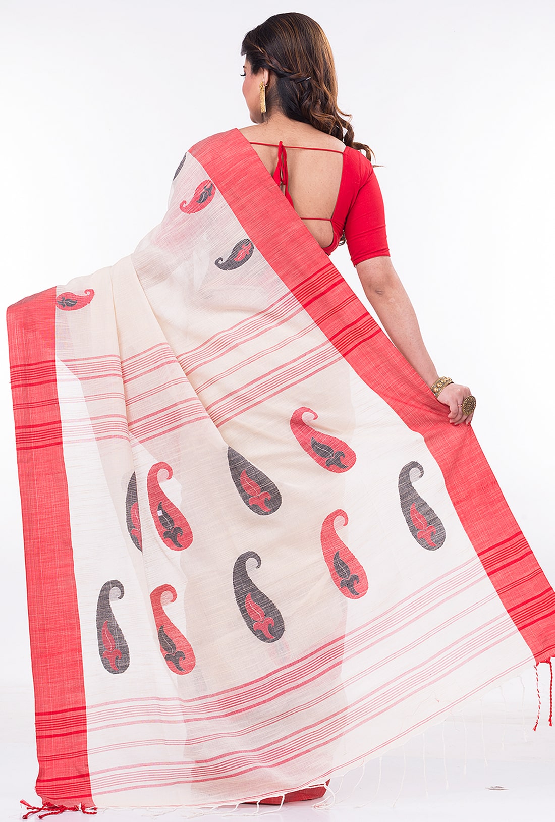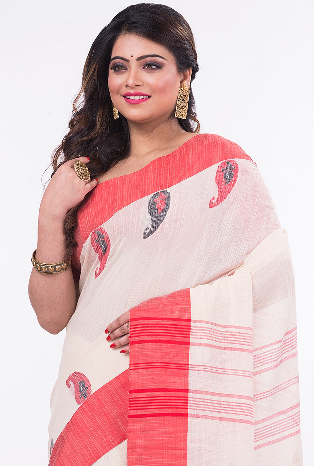 Handwoven red white Bengal Handloom Khadi Cotton saree with jamdani pallu.