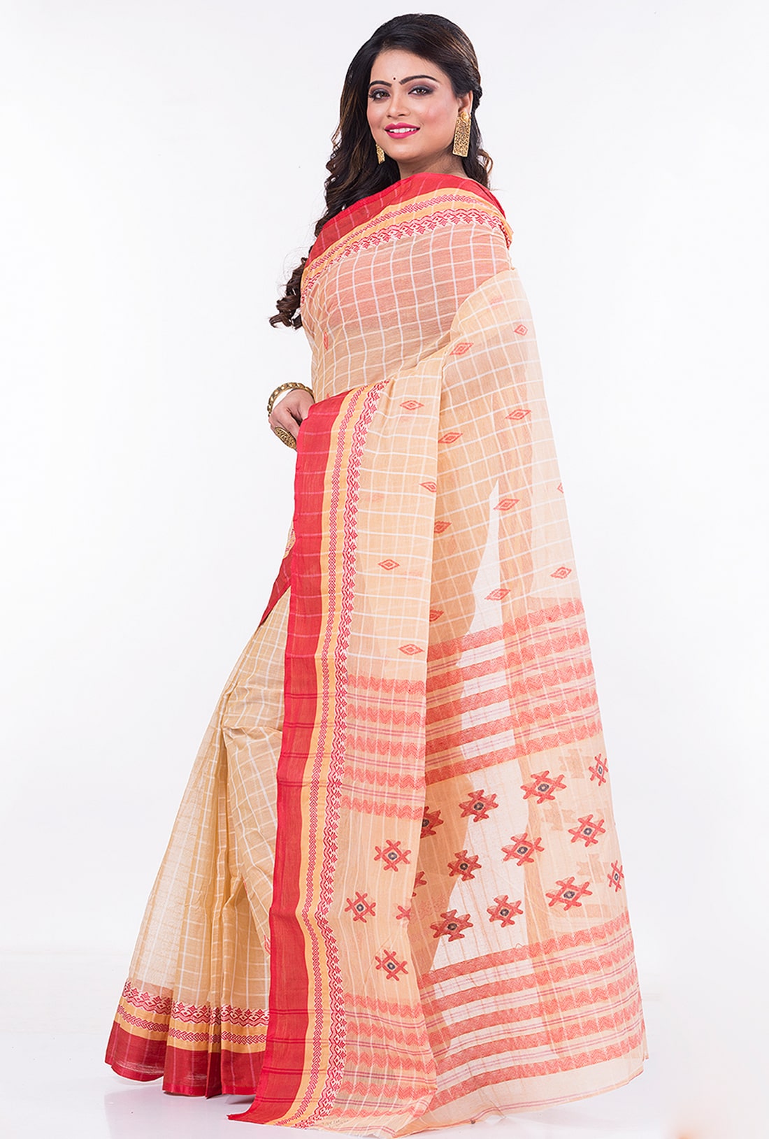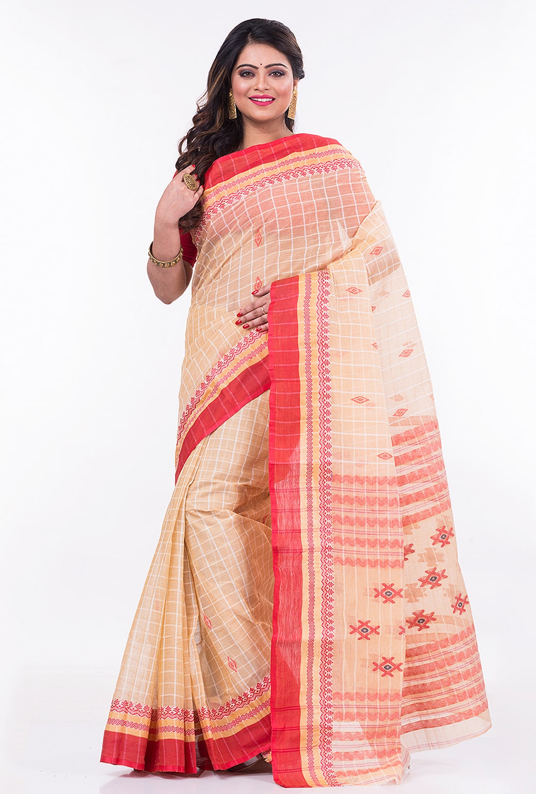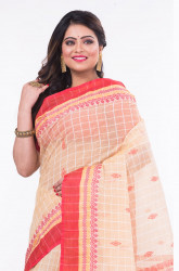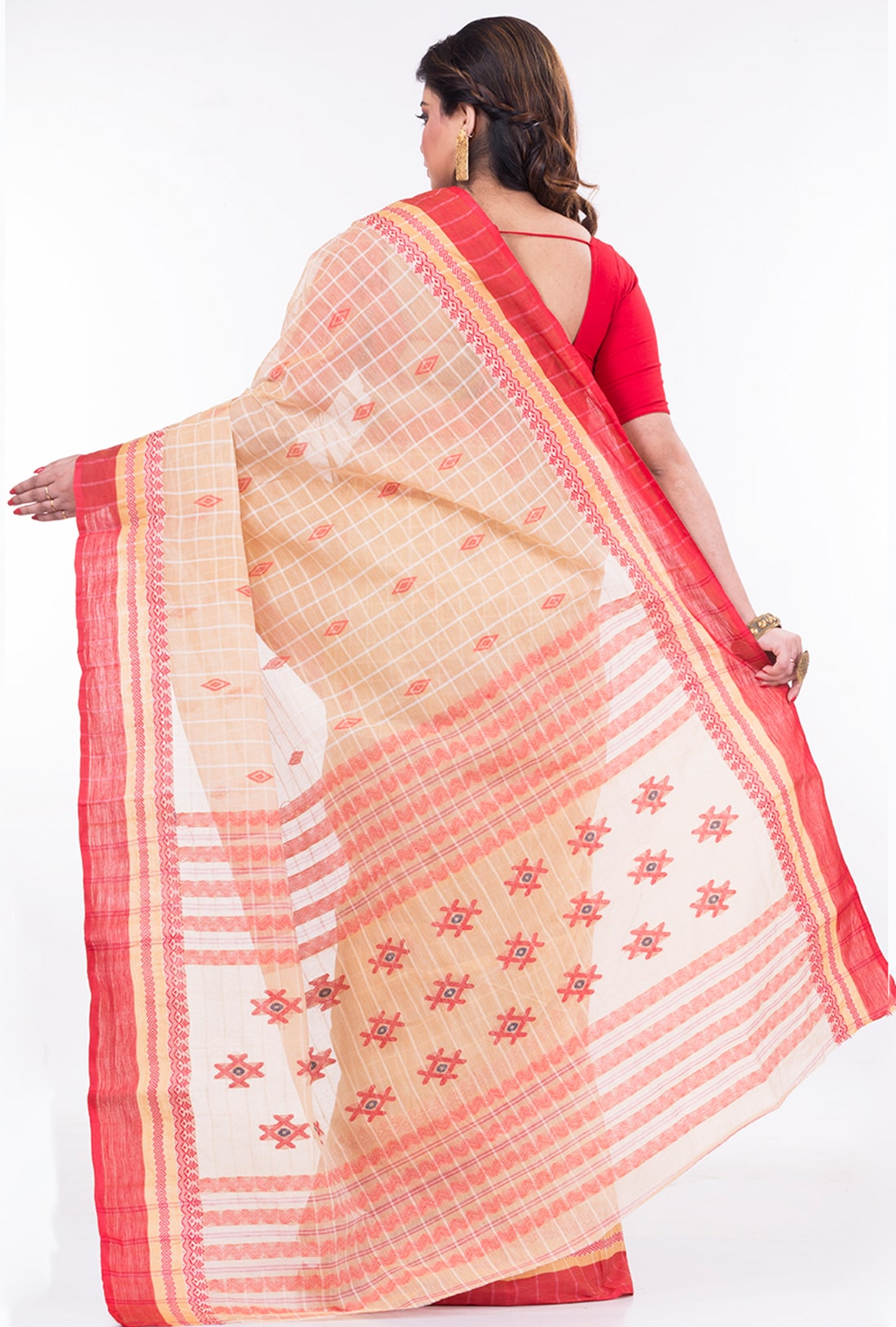 Handwoven red white Bengal Tant Cotton saree with jamdani pallu. Border is made of fine velvet. Easy to wear, maintain and drape.