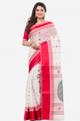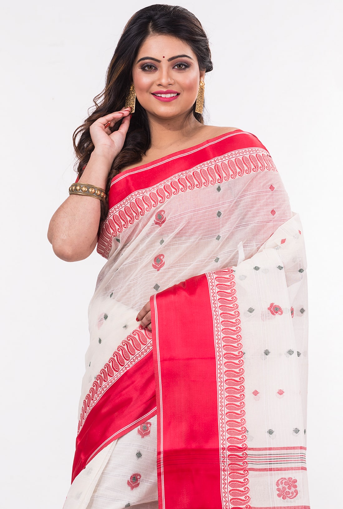Handwoven red white Bengal Tant Cotton Saree with jamdani pallu.