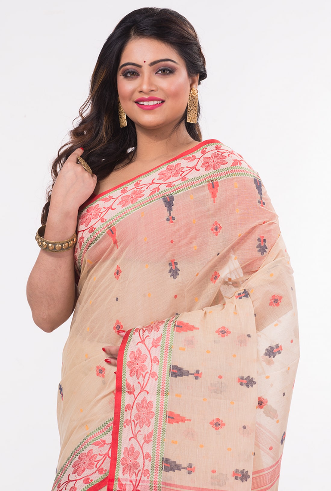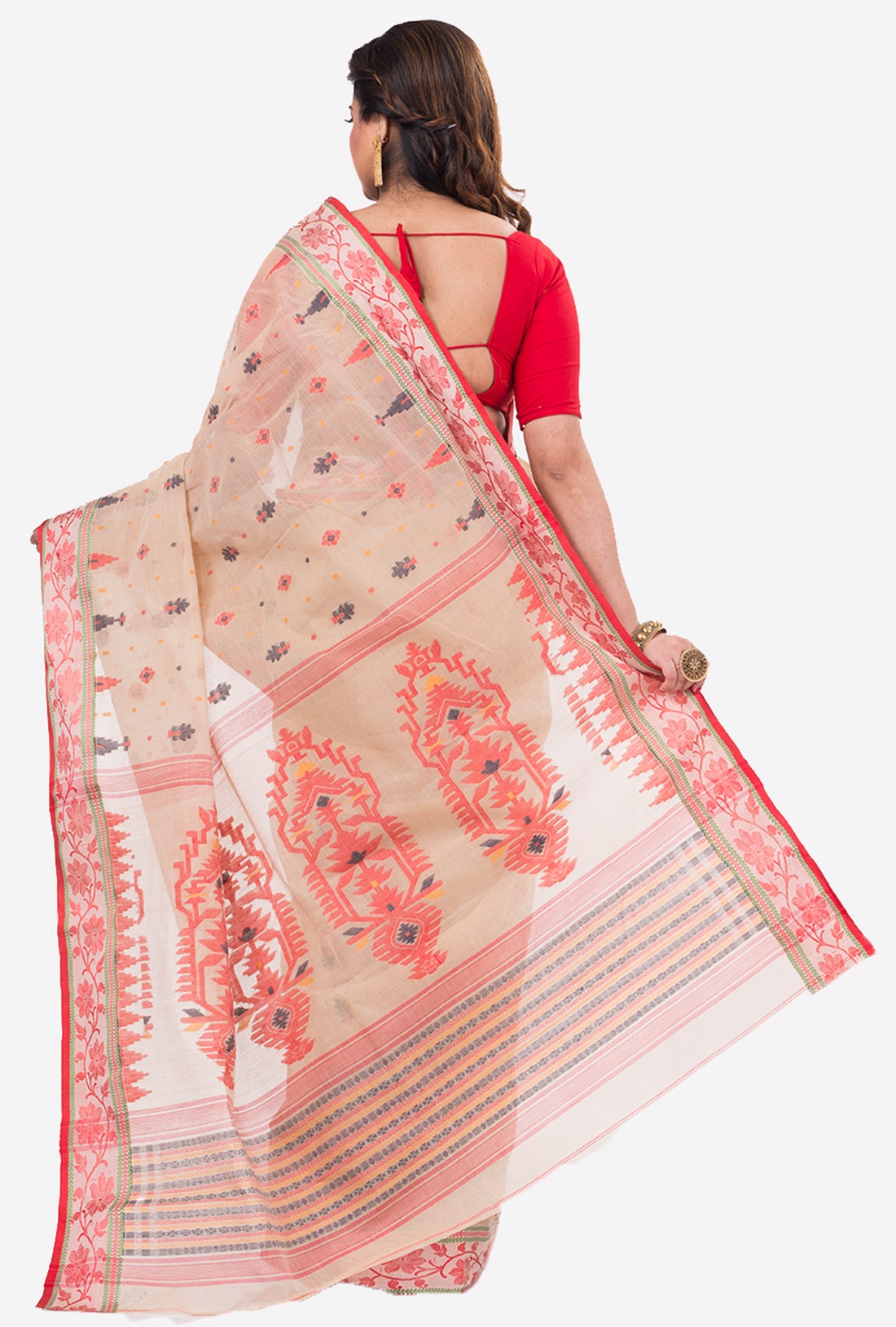 Handwoven red white Bengal Tant Cotton Saree with jamdani pallu.