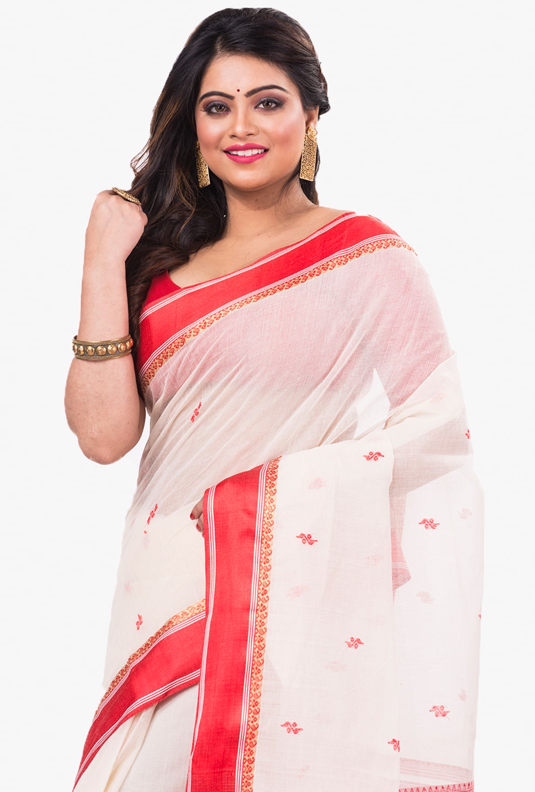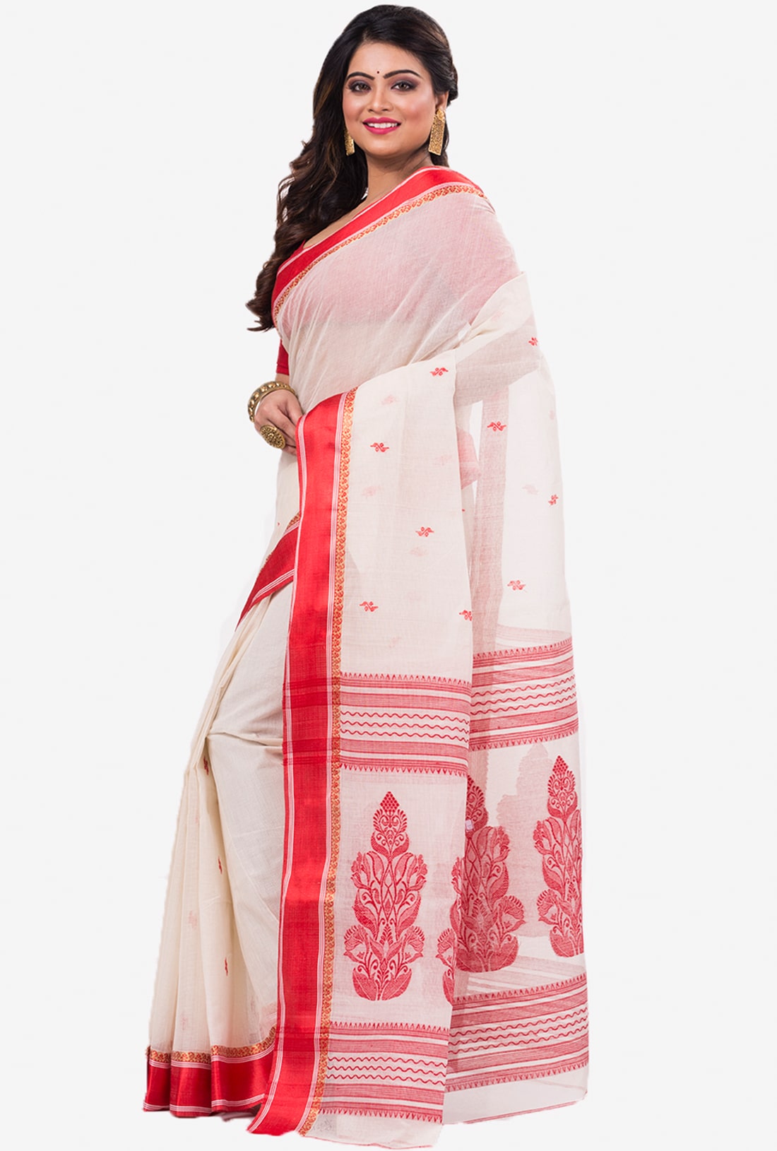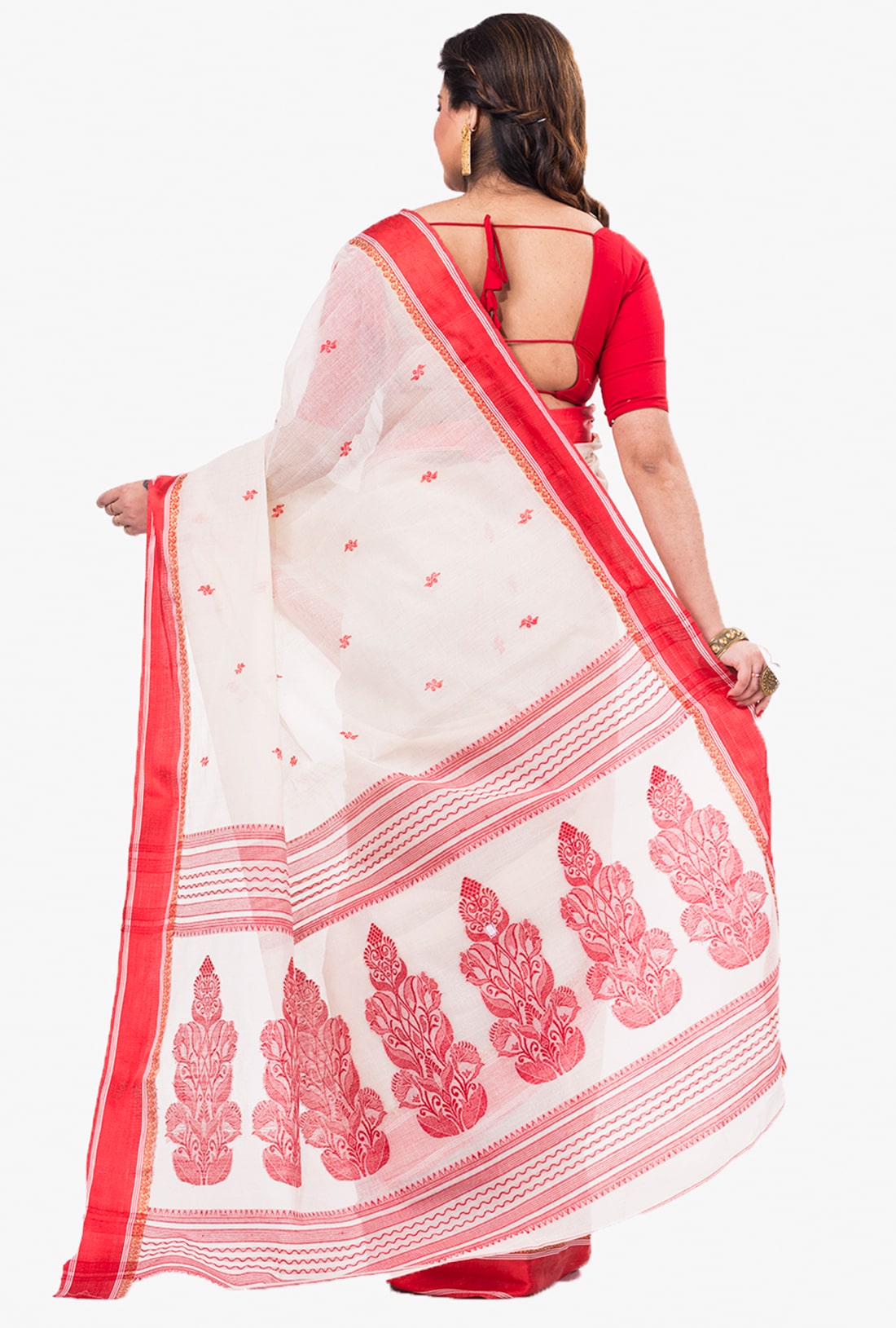 Handwoven red white Bengal Tant Cotton Saree with jamdani pallu.