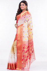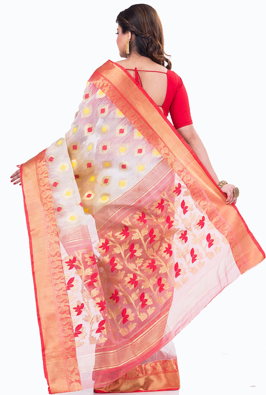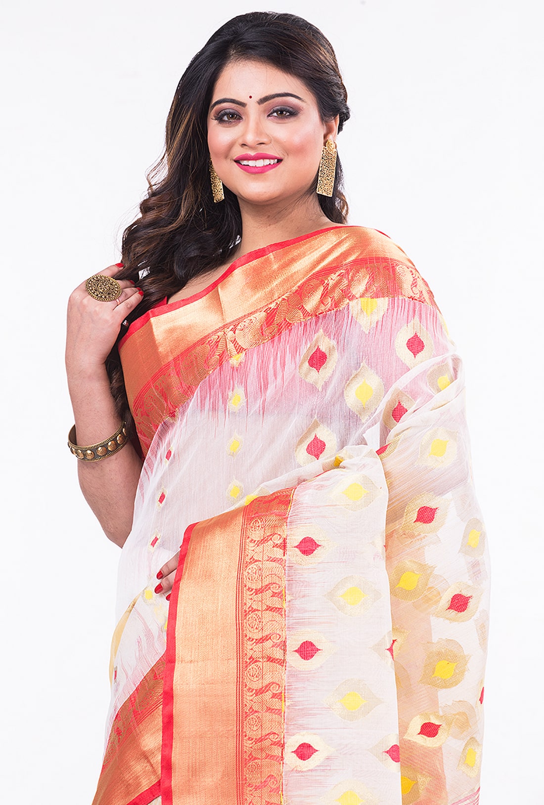 Handwoven red white Bengal Tant silk saree with jamdani pallu. Border is made of fine zari. Easy to wear, maintain and drape.